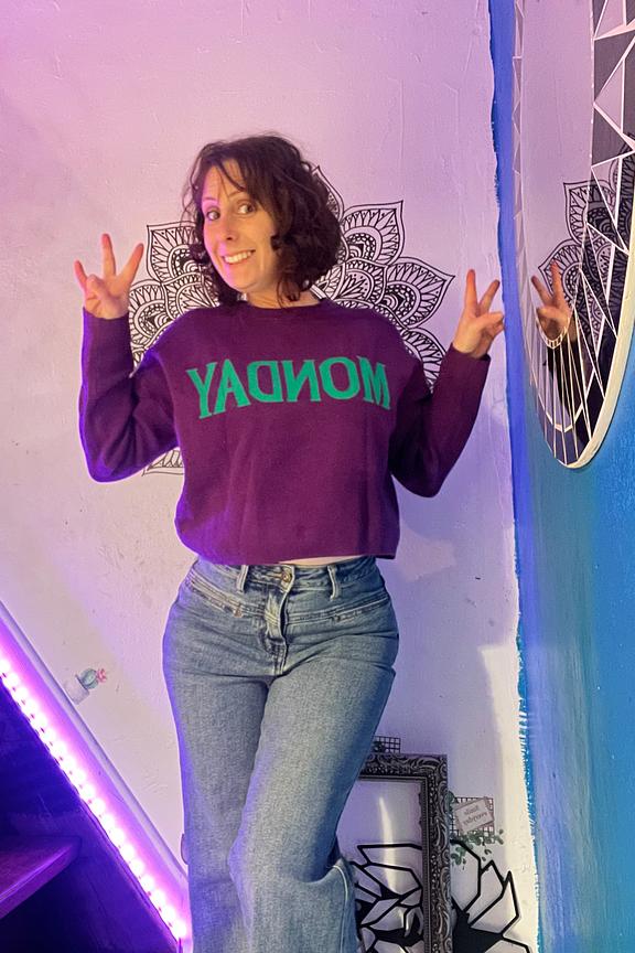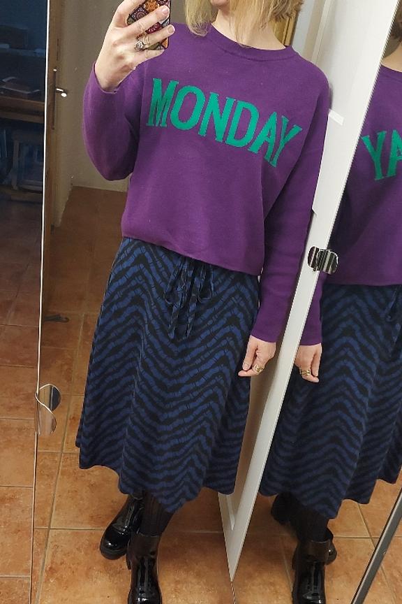 โข Pull en maille violet doux โข Logo "monday" vert โข Manches longues โข Col rond โข Coupe courte โข La taille unique convient du 34 au 42 โข Longueur totale 53cm โข Aisselle ร aisselle 58cm โข Largeur manche 40cm