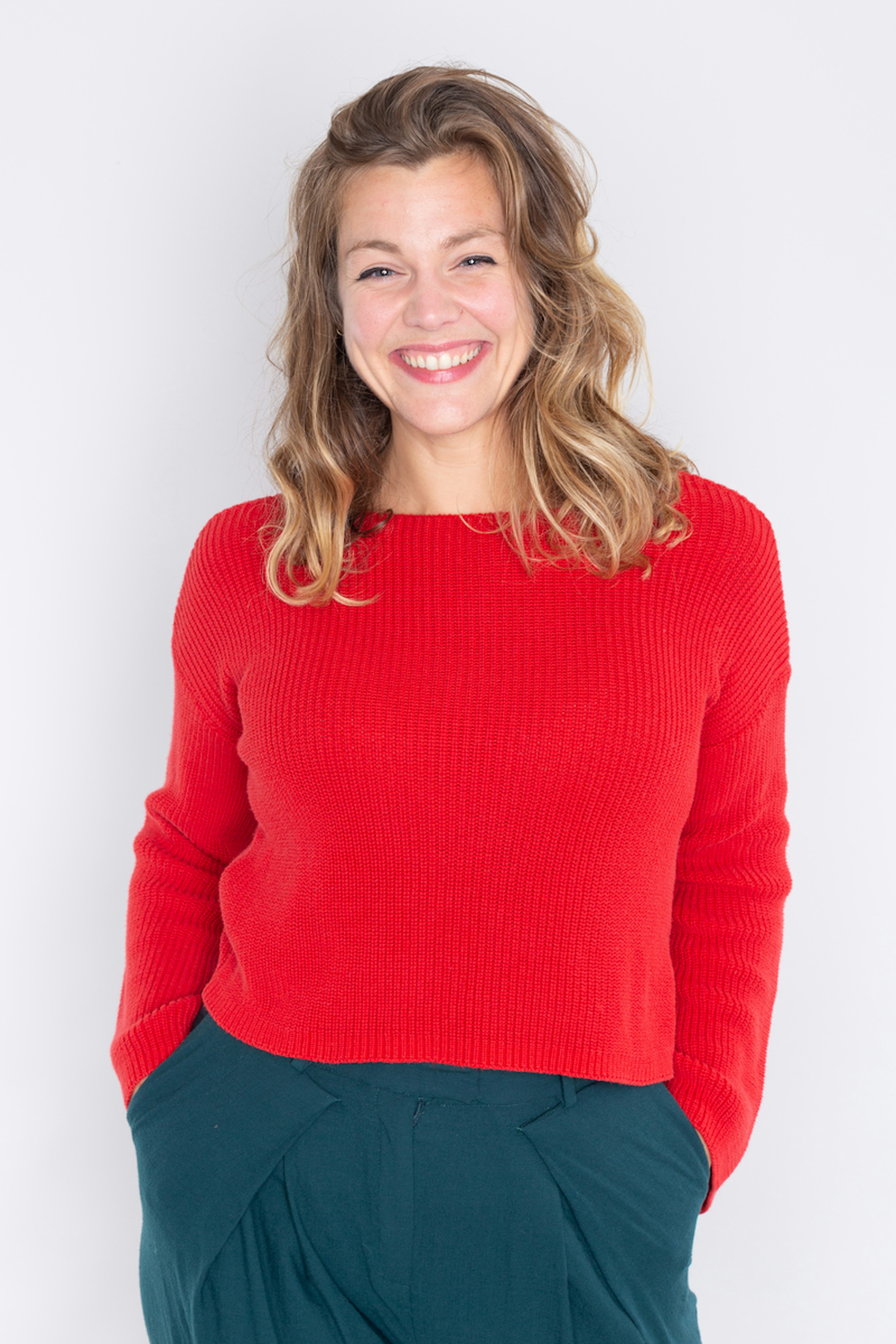 โข Pull en mailles rouge โข Coupe courte ร la taille โข Manches longues รฉvasรฉes sur le bas โข Encolure ras du cou