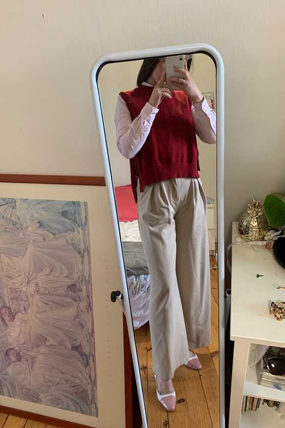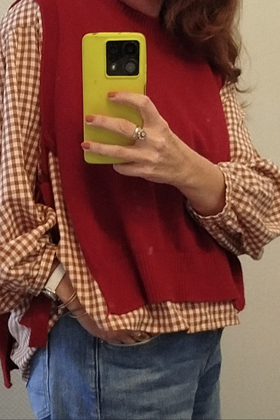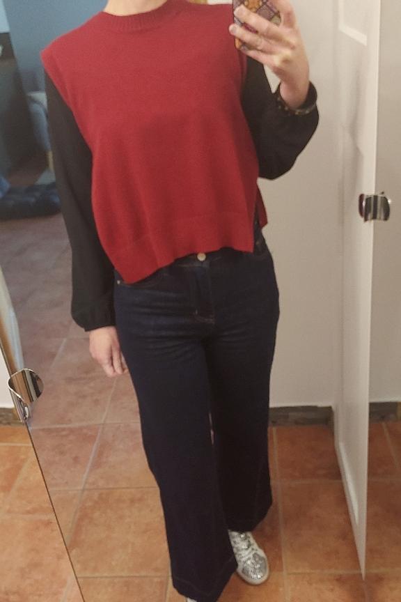 Associez ce pull sans manches à une chemise blanche et un pantalon ajusté pour un look chic en hiver. • Pull sans manches • Coupe droite • Fentes latérales • Col rond • Couleur bordeaux