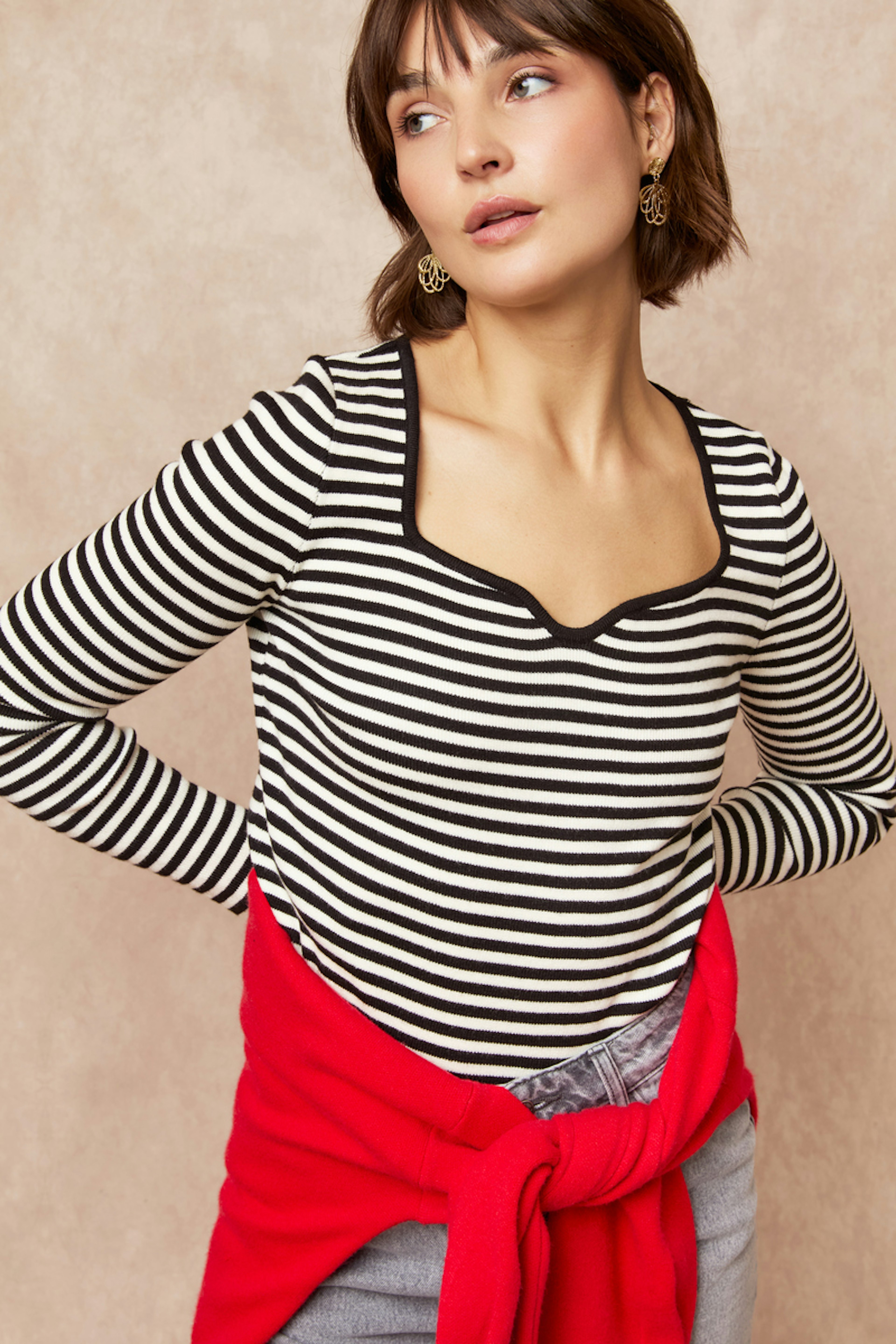 **Pour un look chic et décontracté, associez ce pull avec un jean taille haute et vos accessoires dorés préférés. Idéal pour l'hiver.** • Pull à rayures • Coupe ajustée • Col carré • Manches longues • Motif rayé