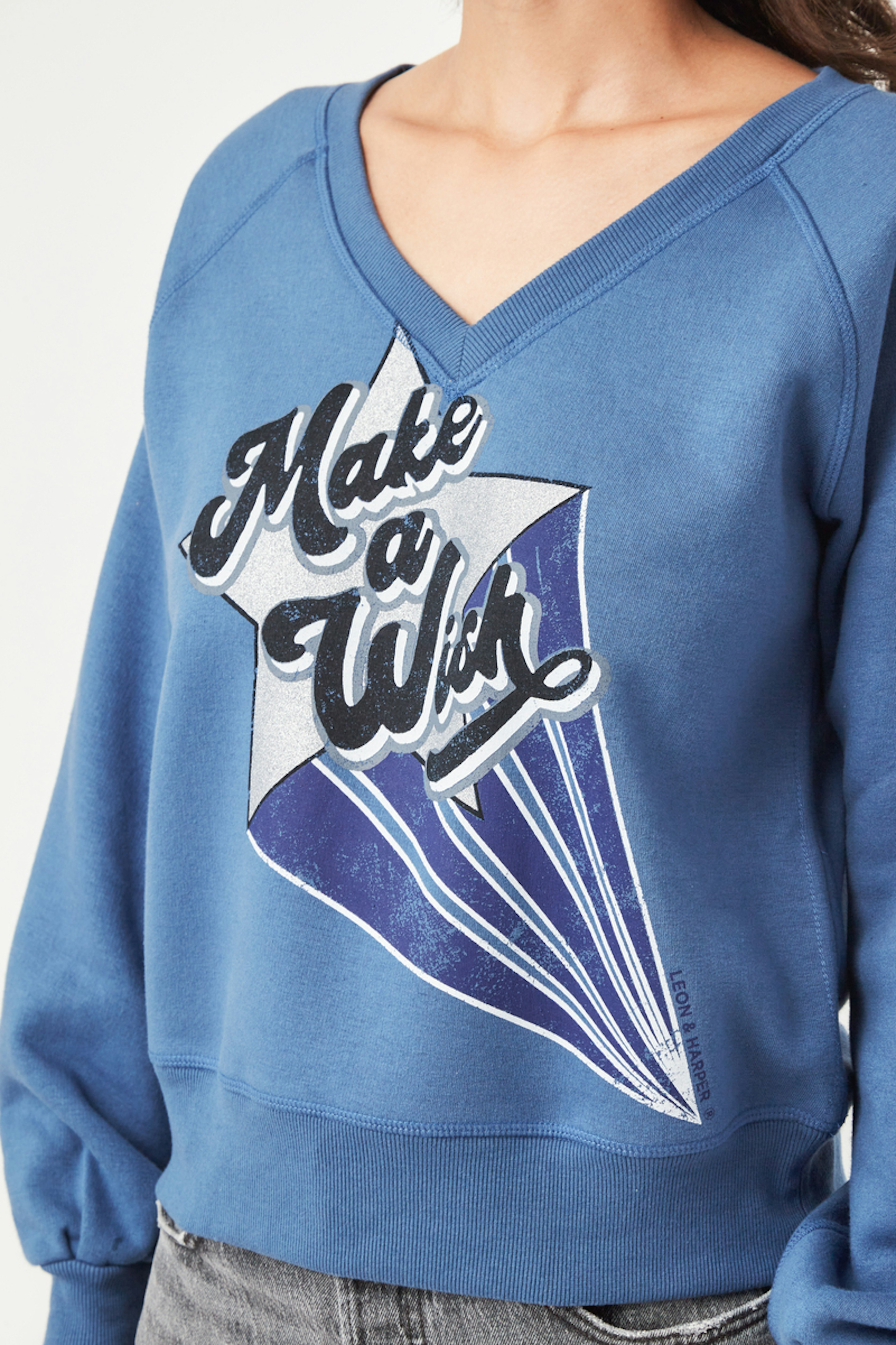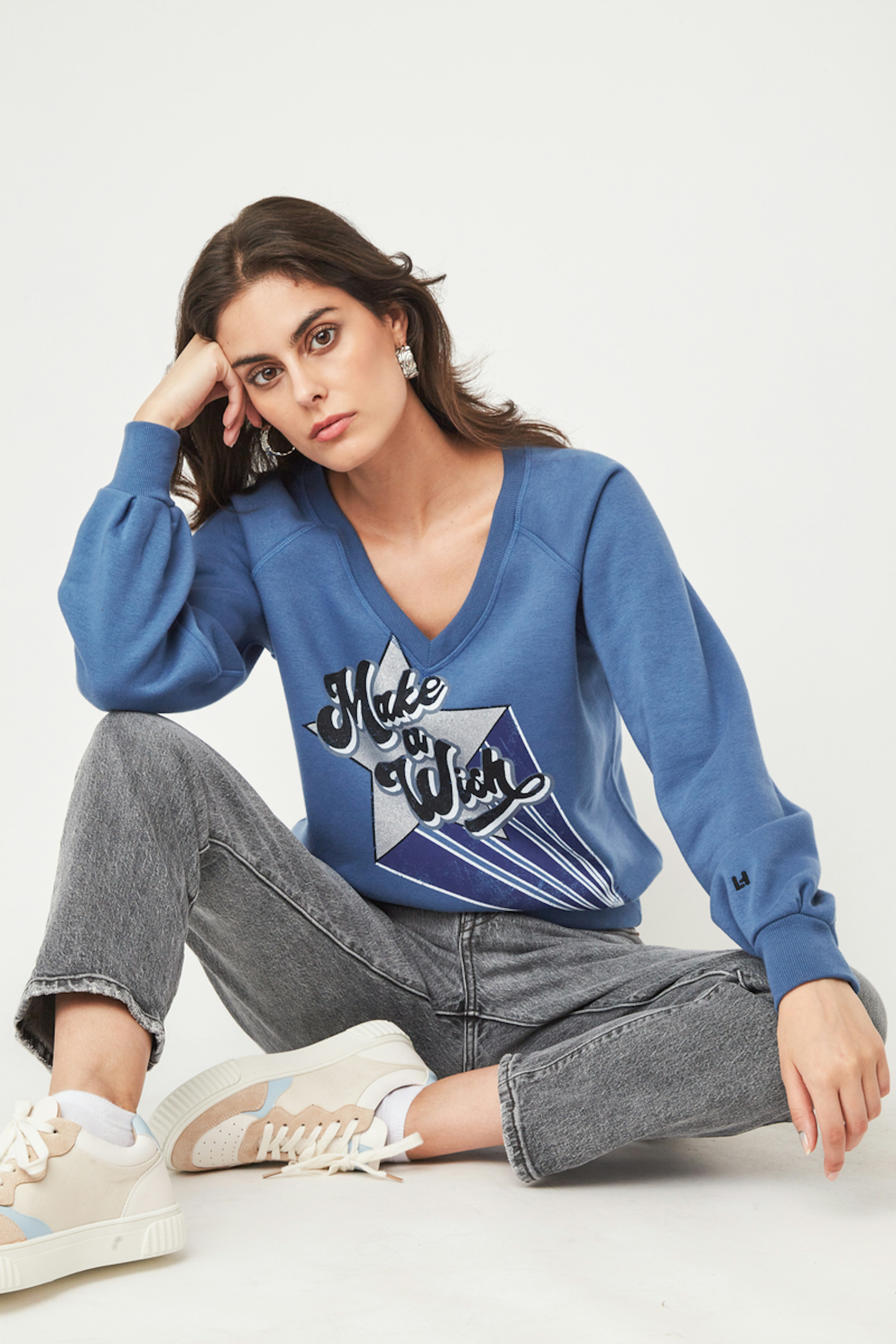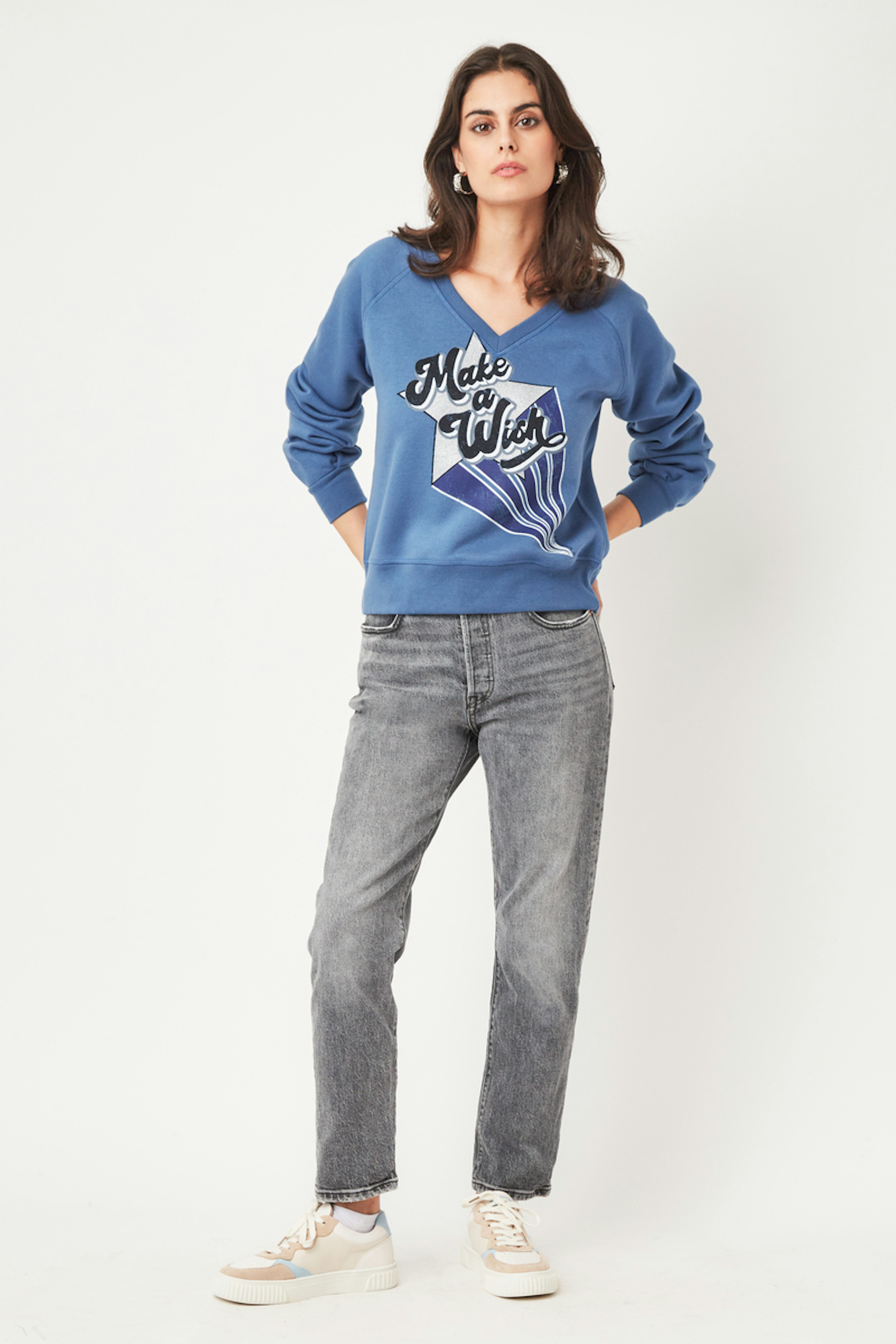 โข Sweatshirt en coton biologique et polyester โข Manches longues โข Col V โข Finitions bords cรดte โข Coupe droite โข Imprimรฉ sรฉrigraphique en รฉtoile โข Couleur Bleue