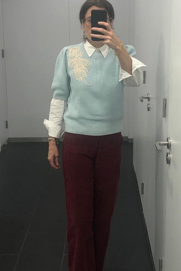 Portez ce pull bleu avec un pantalon beige et des bottines pour un look élégant et confortable. Parfait en toute saison. • Pull en coton biologique • Col rond chic • Manches courtes élégantes • Détail brodé unique • Coupe légèrement ajustée