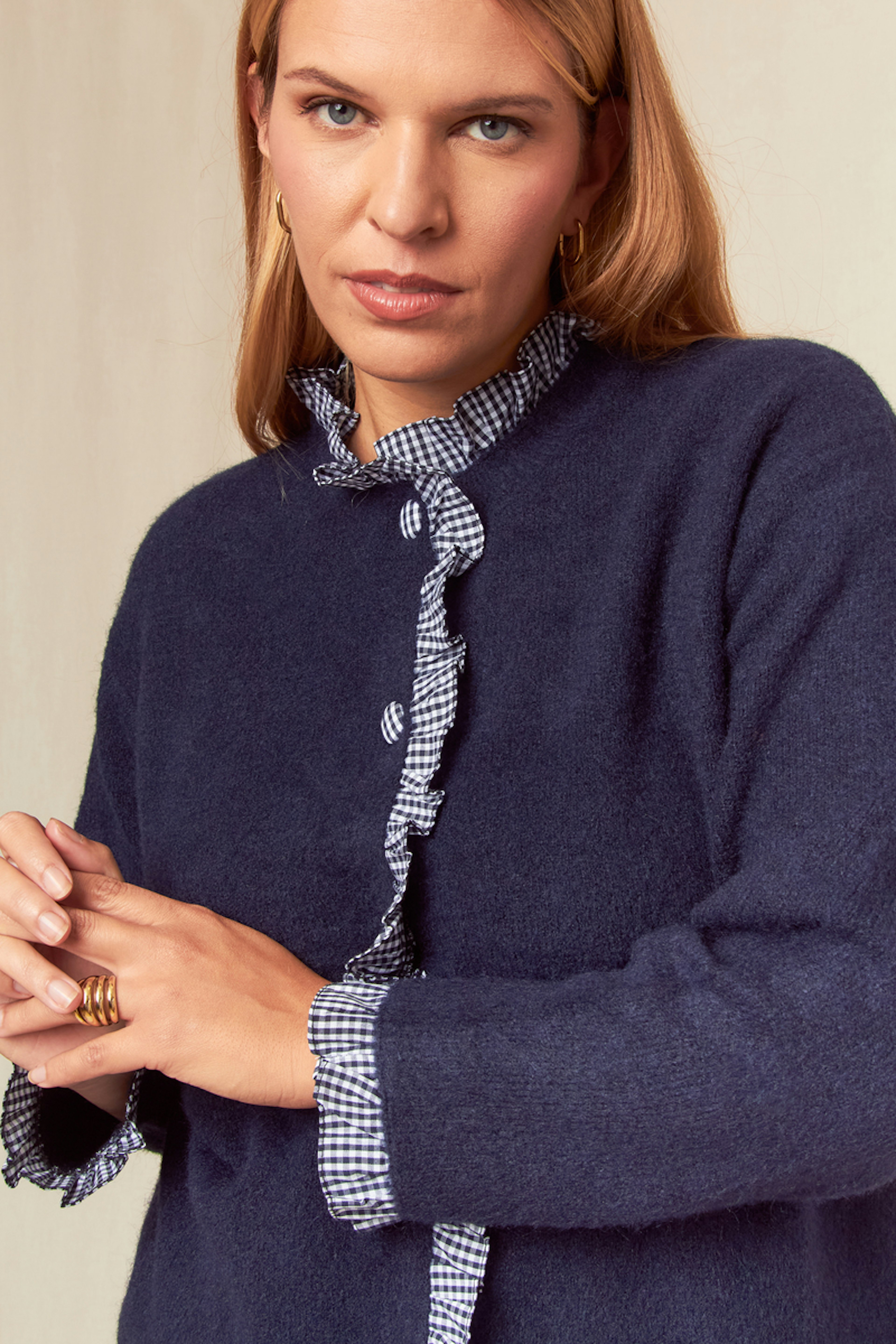 Associez ce pull avec une jupe en laine et des bottes pour un look hivernal chic. • Manches longues • Coupe droite • Encolure ronde • Bordures à volants • Fermeture boutonnée à l'avant