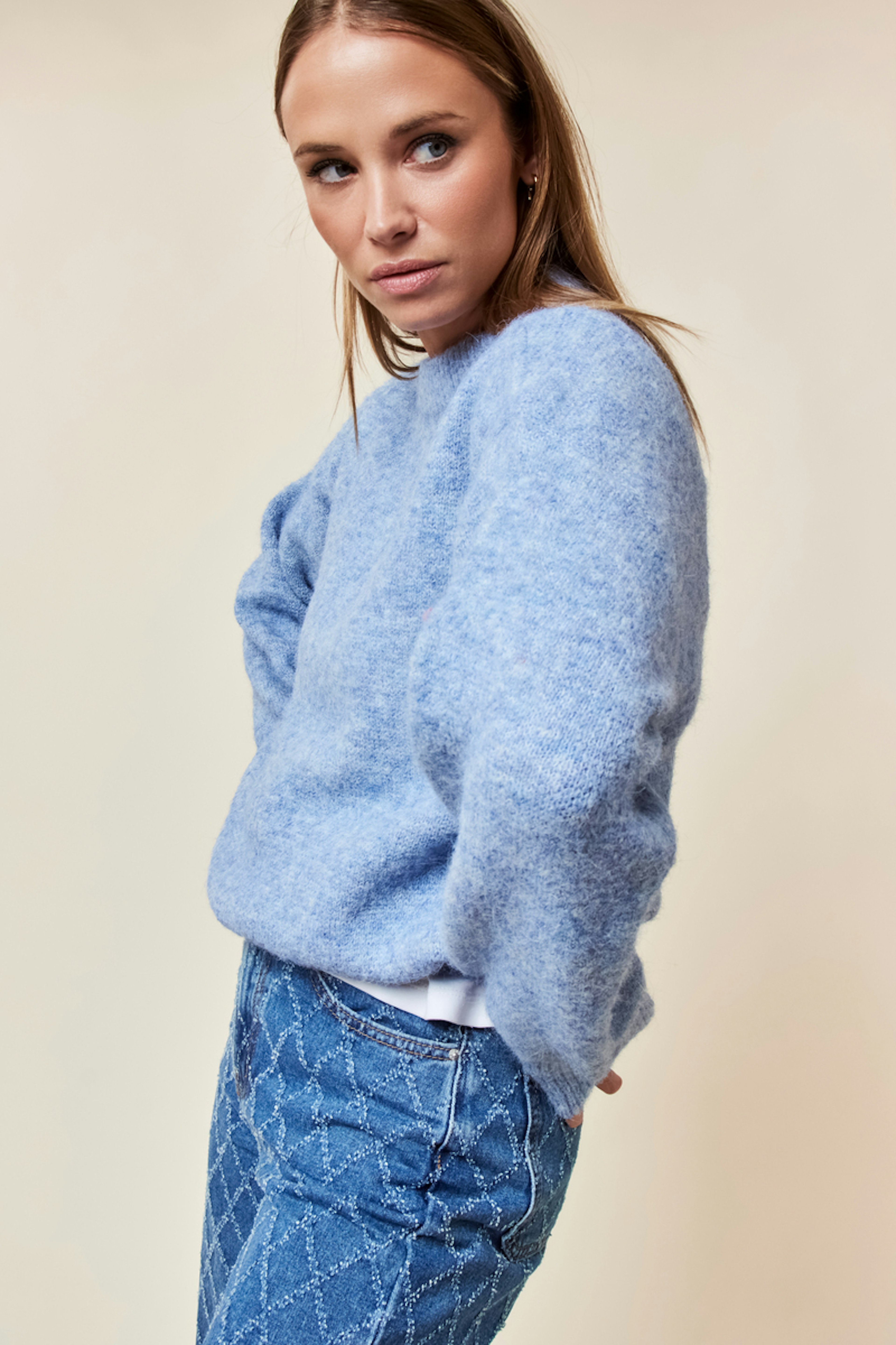 “Superbe pull oversize, la couleur est vraiment flatteuse pour les yeux bleus.”