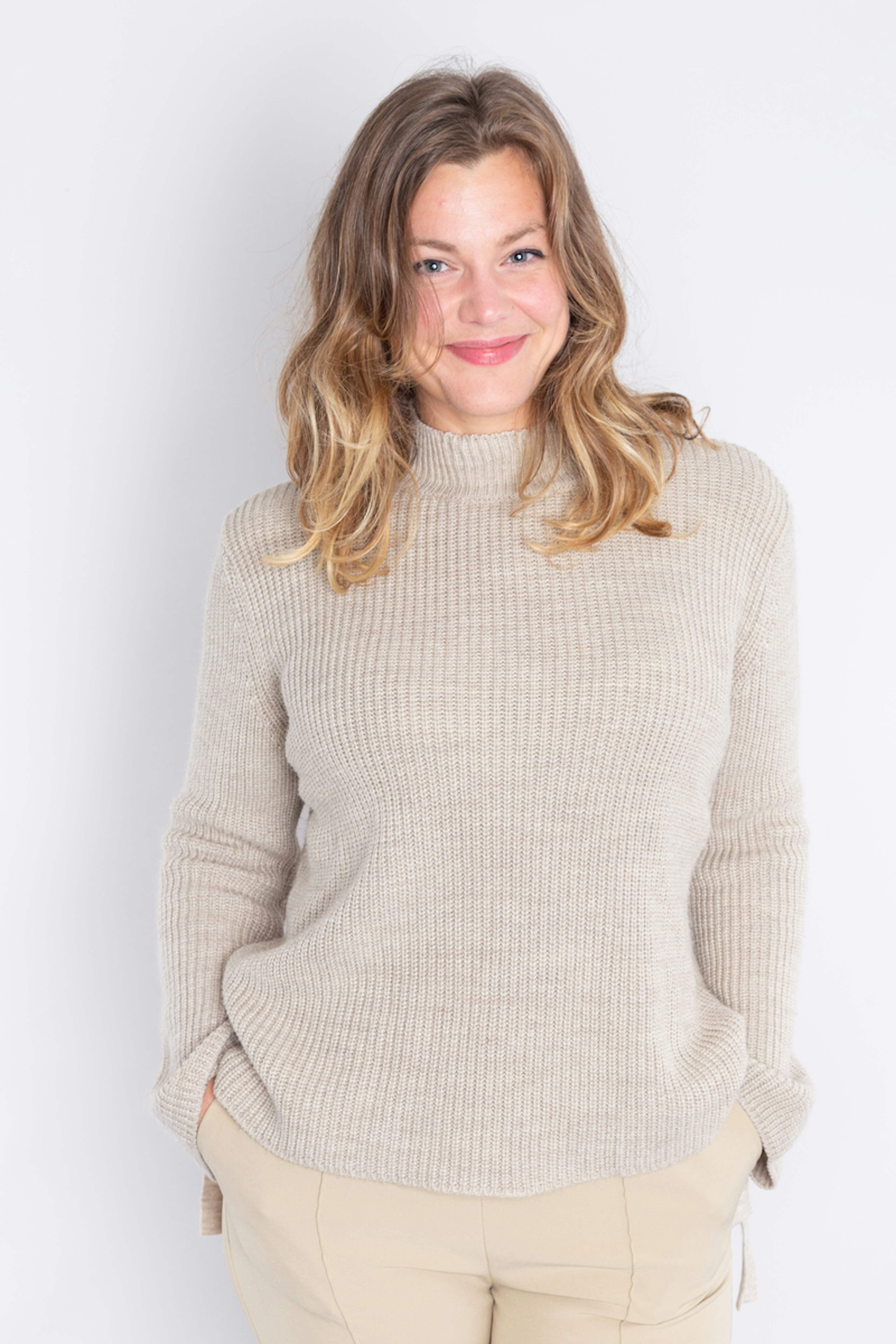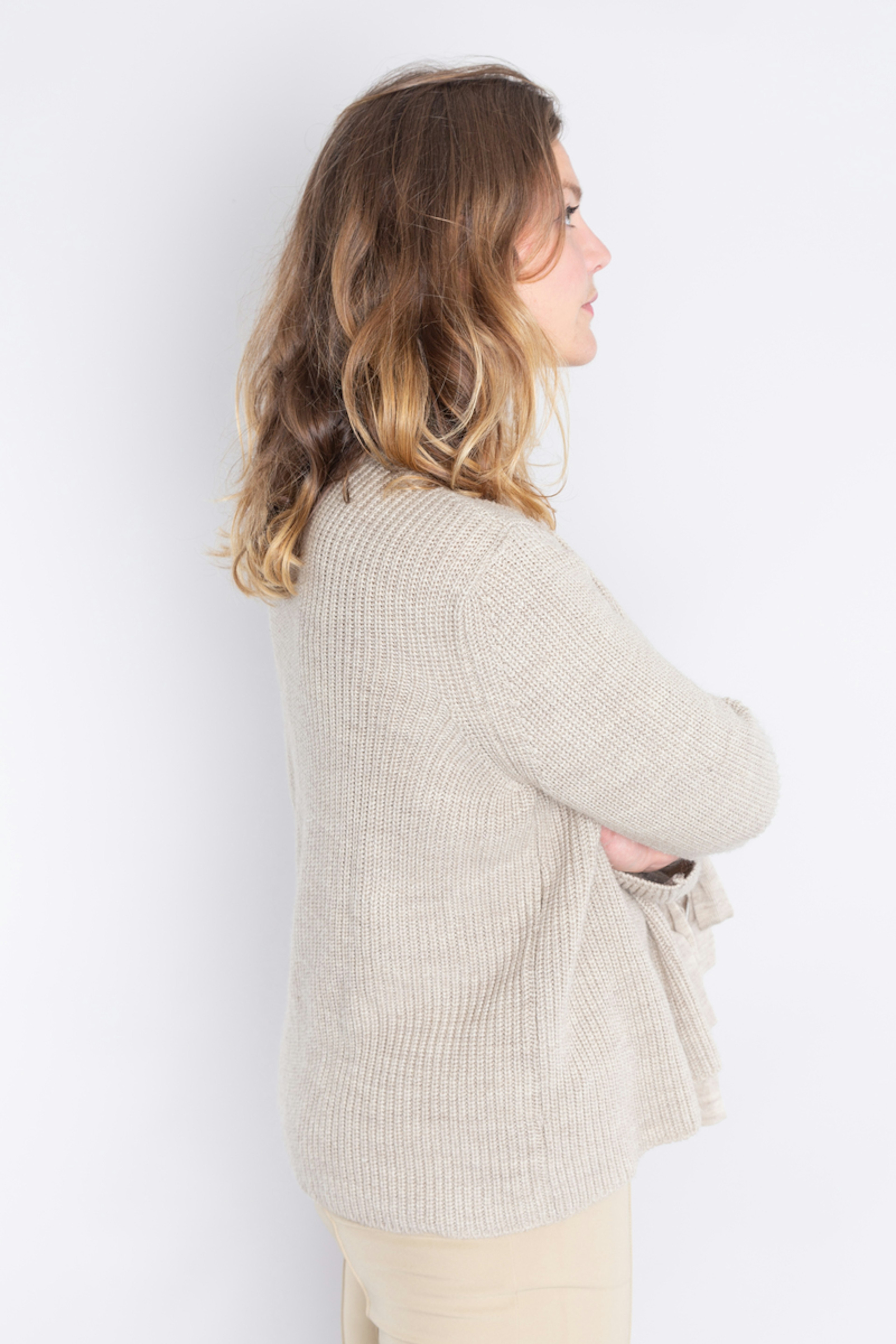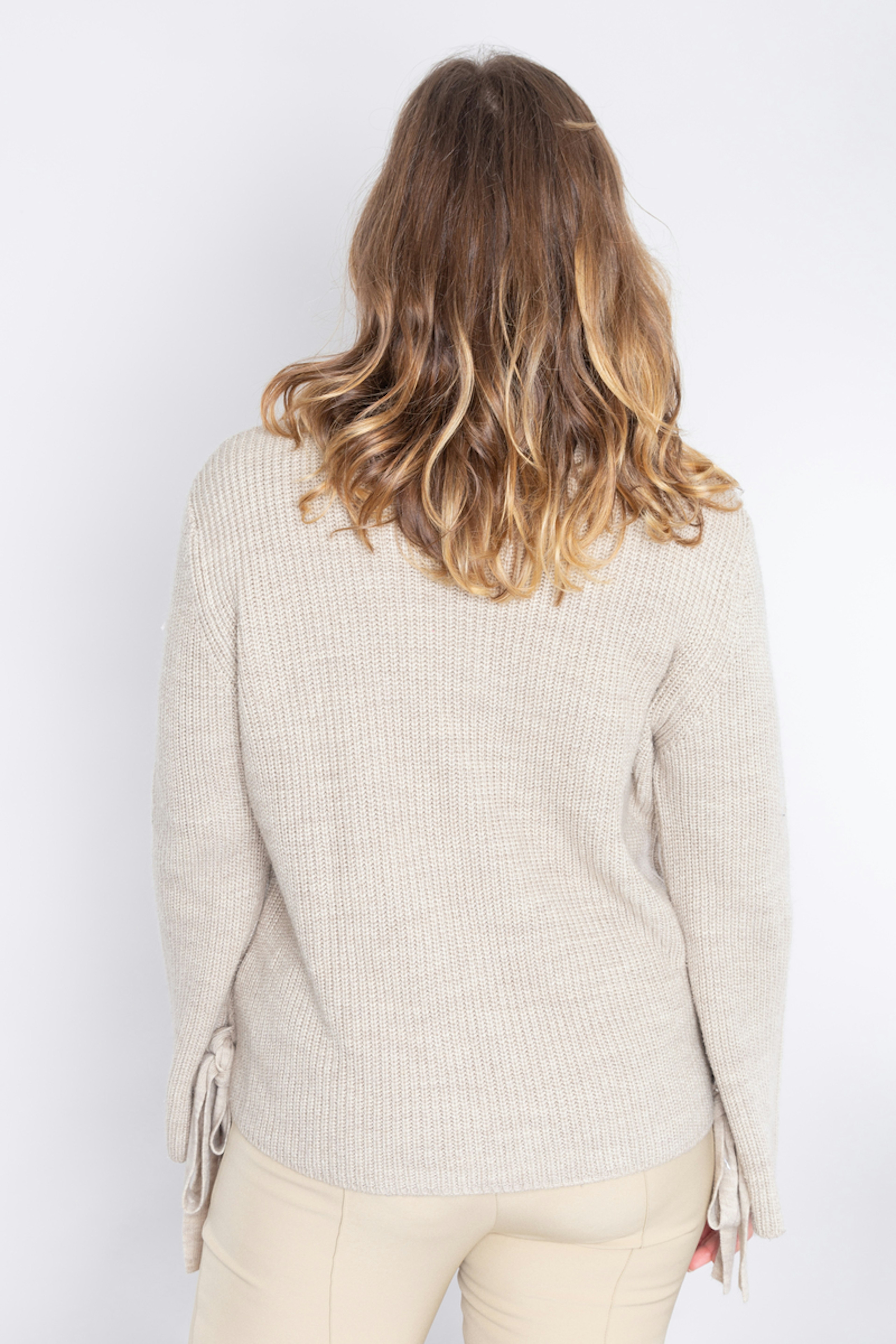 โข Pull en mailles cรดtelรฉes beige โข Manches longues รฉvasรฉes sur la fin et fermรฉes par des nลuds โข Encolure montante