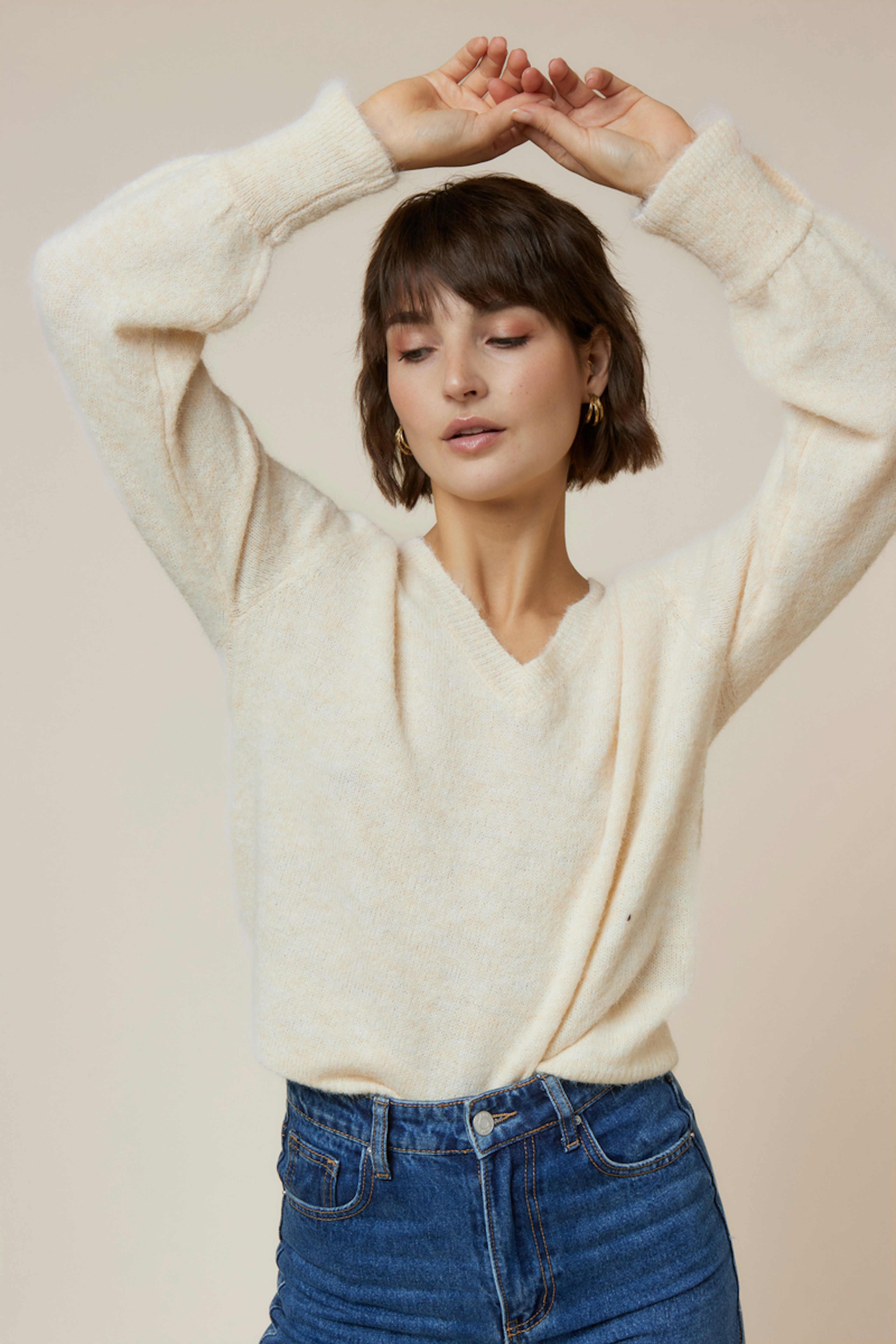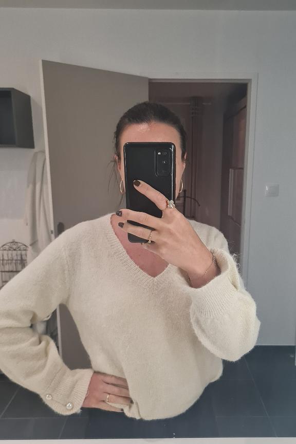 Portez ce pull cosy avec un jean bleu pour un style décontracté-chic cet hiver. • Pull doux en laine • Manches longues • Coupe décontractée • Détail perlé aux poignets • Couleur beige élégante