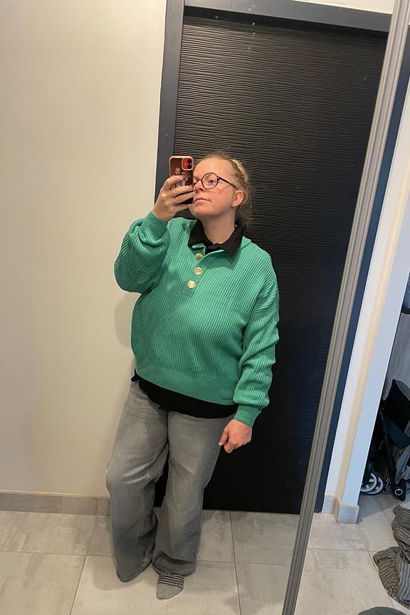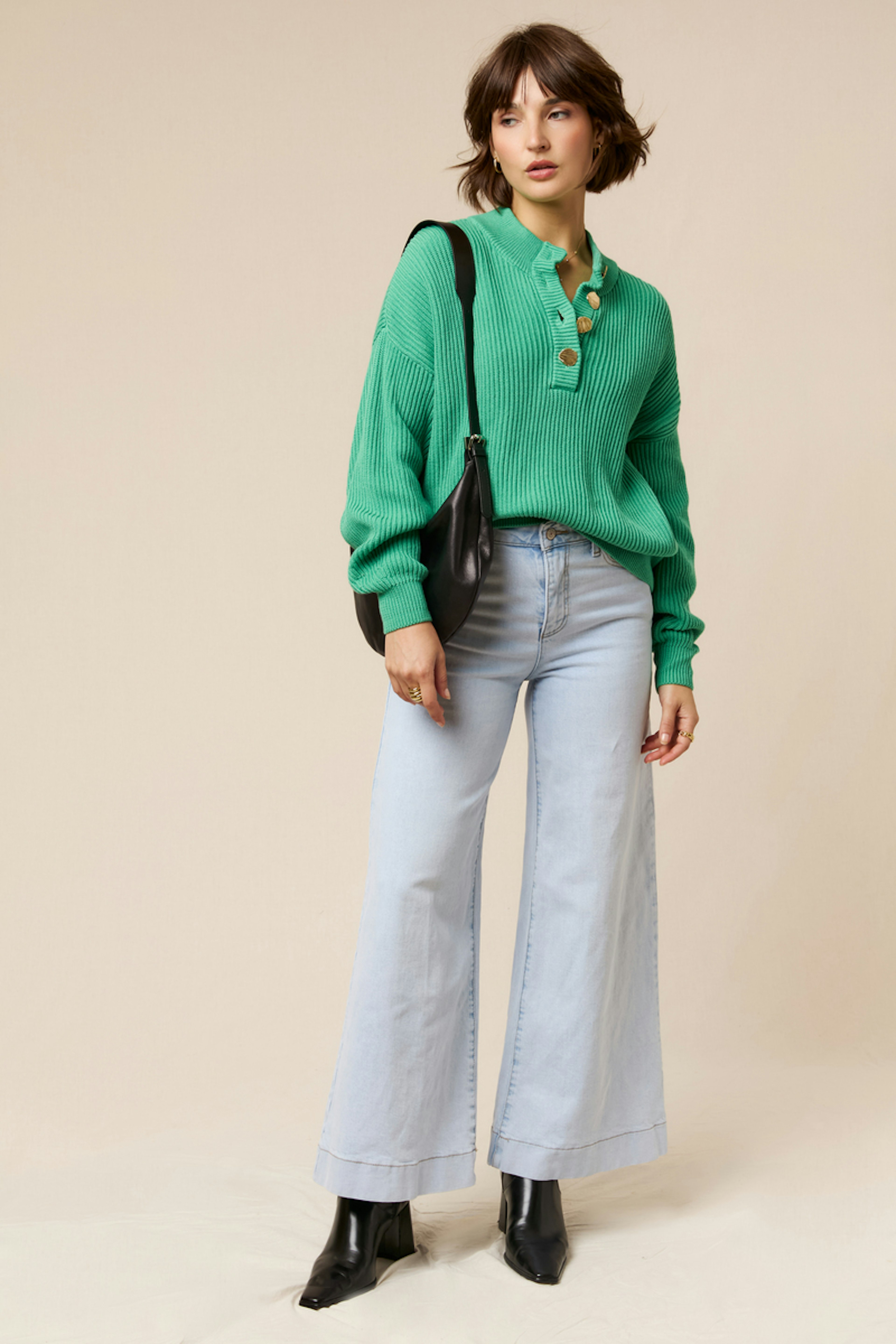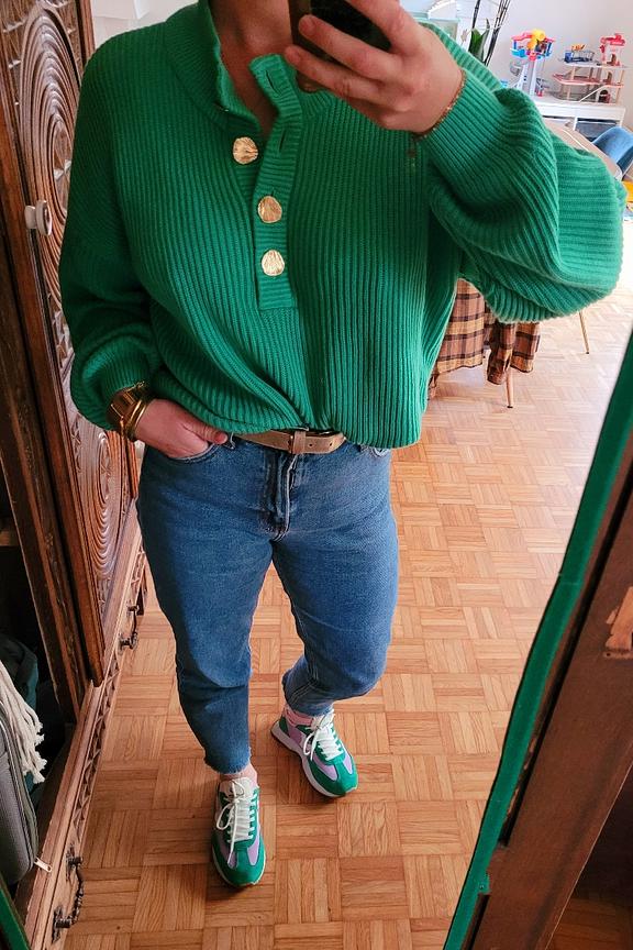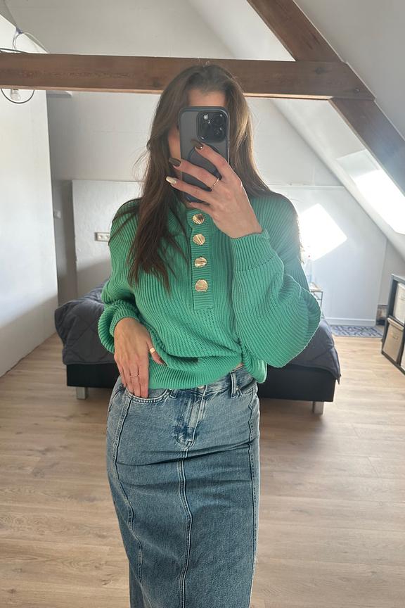Portez ce pull avec un jean blanc et des bottines pour un look chic et décontracté, parfait en toute saison. • Pull en coton biologique • Coupe décontractée • Encolure boutonnée • Manches longues • Coloris vert vibrant