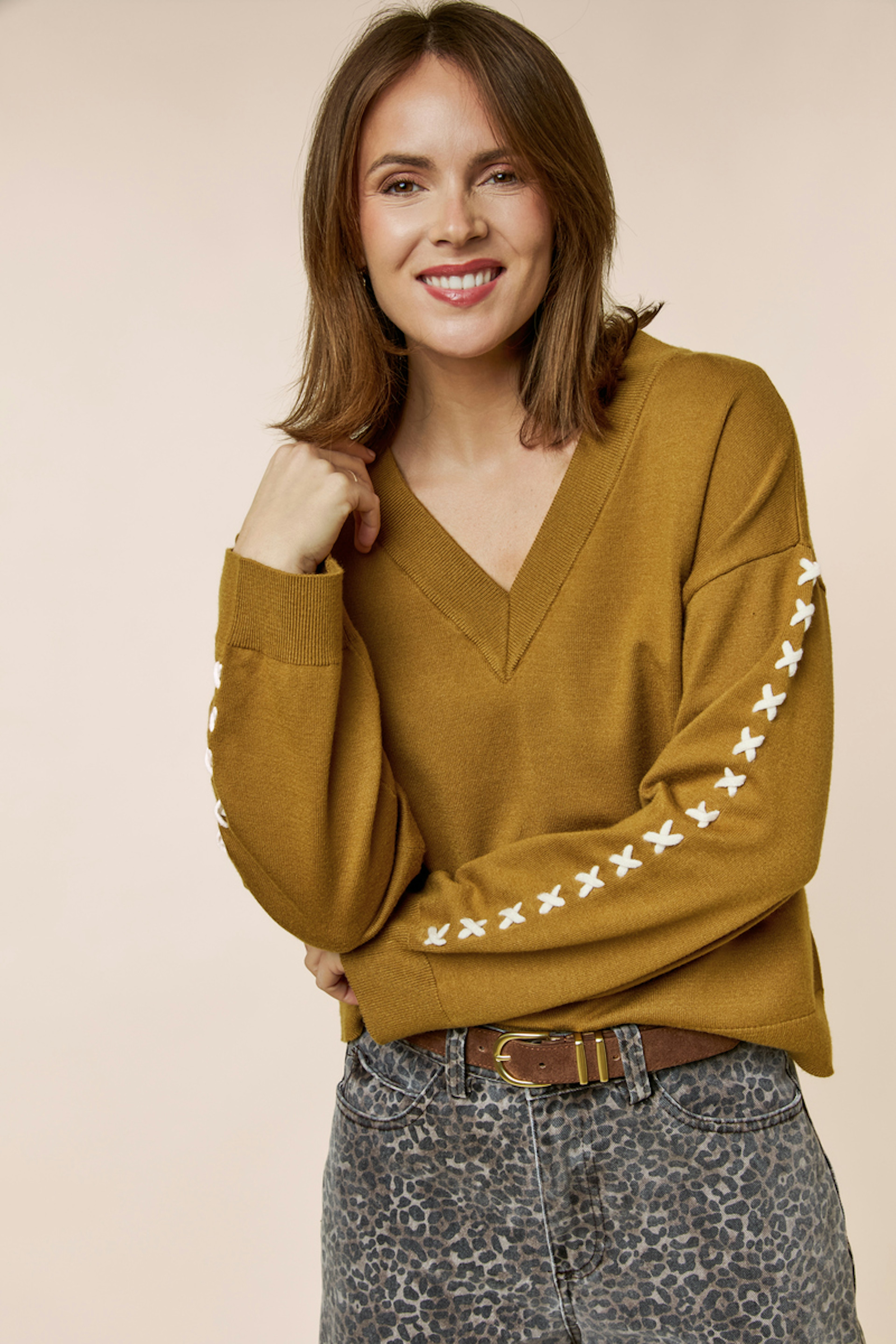 Portez-le avec un jean slim noir et des bottines pour un look chic hivernal. Ajoutez un chapeau en feutre pour une touche finale élégante. • Pull avec motif • Col en V flatteur • Manches longues • Coupe droite • Détails brodés sur les manches