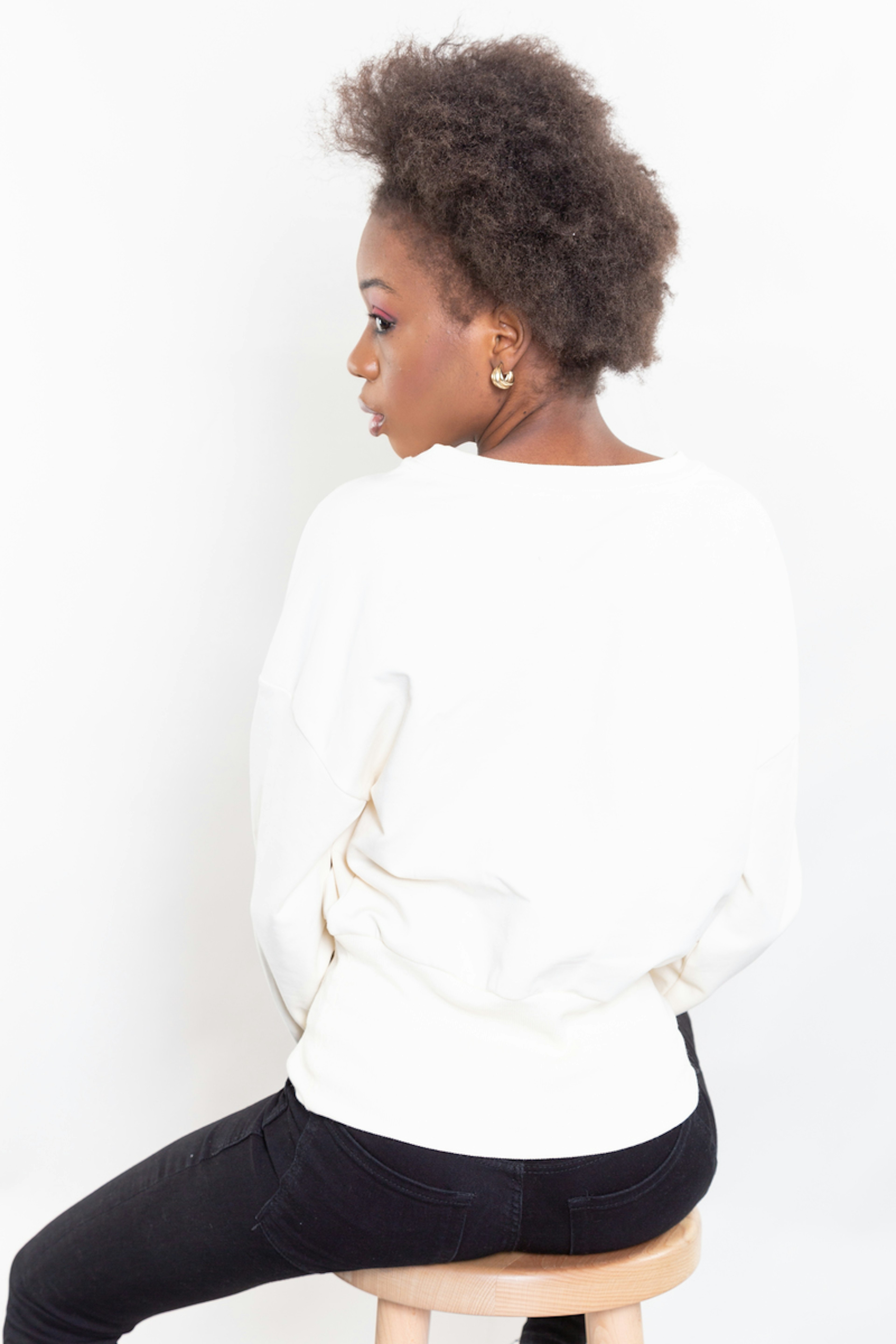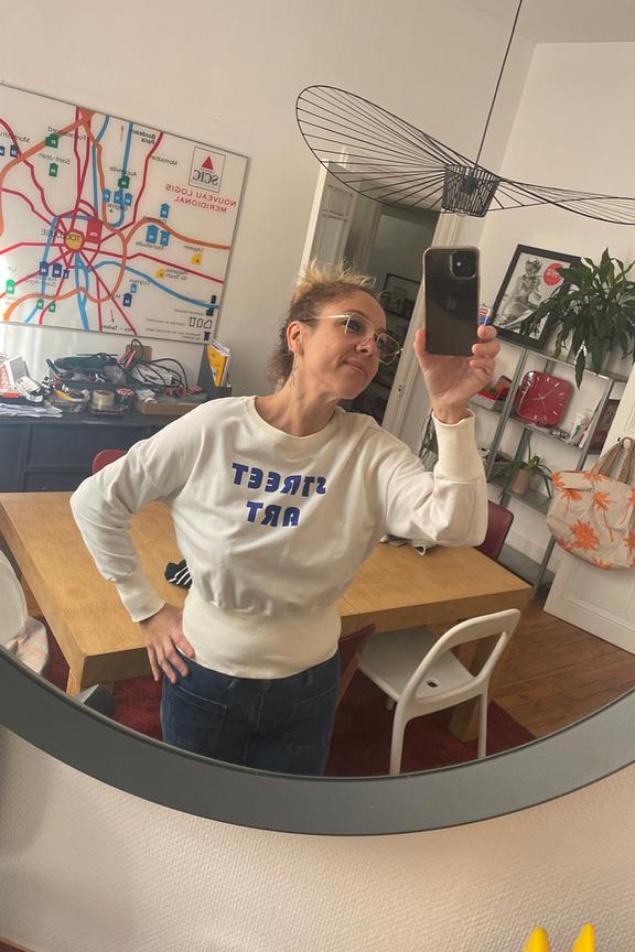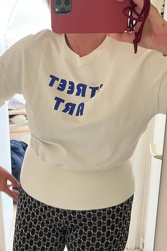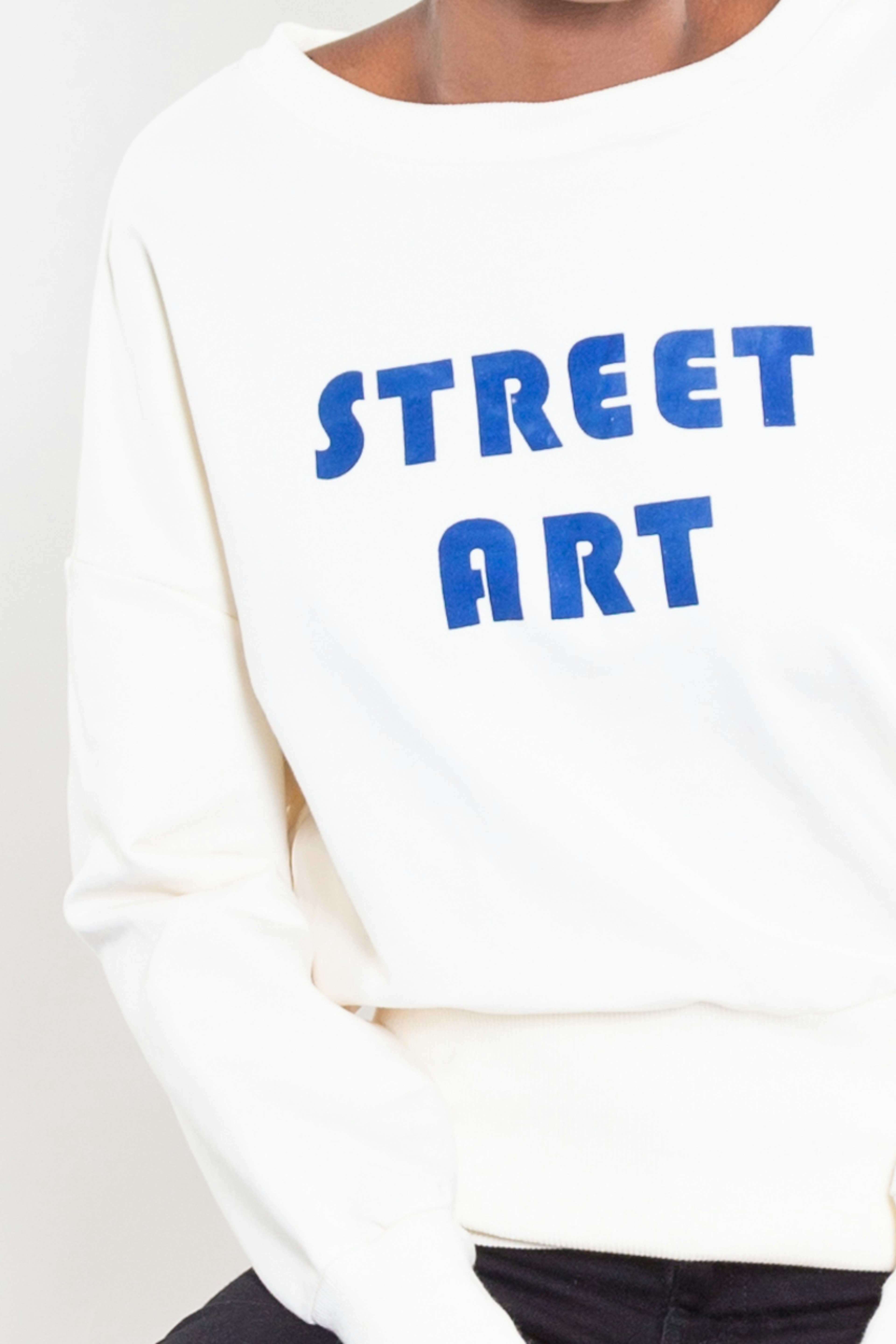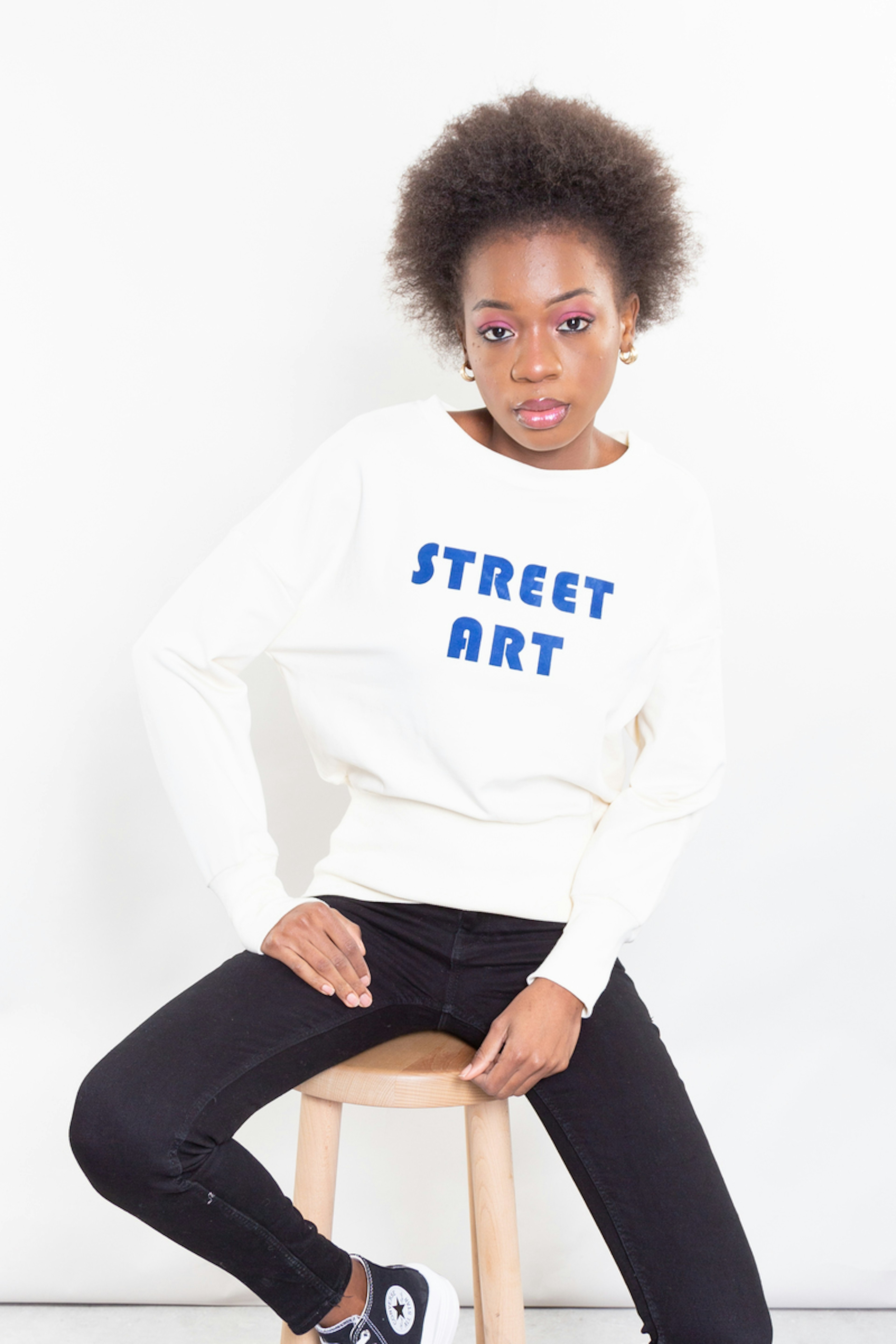 โข Sweatshirt รฉcru ร manches longues โข Sรฉrigraphie "Street art" bleue โข Bord cรดte aux manches et au col
