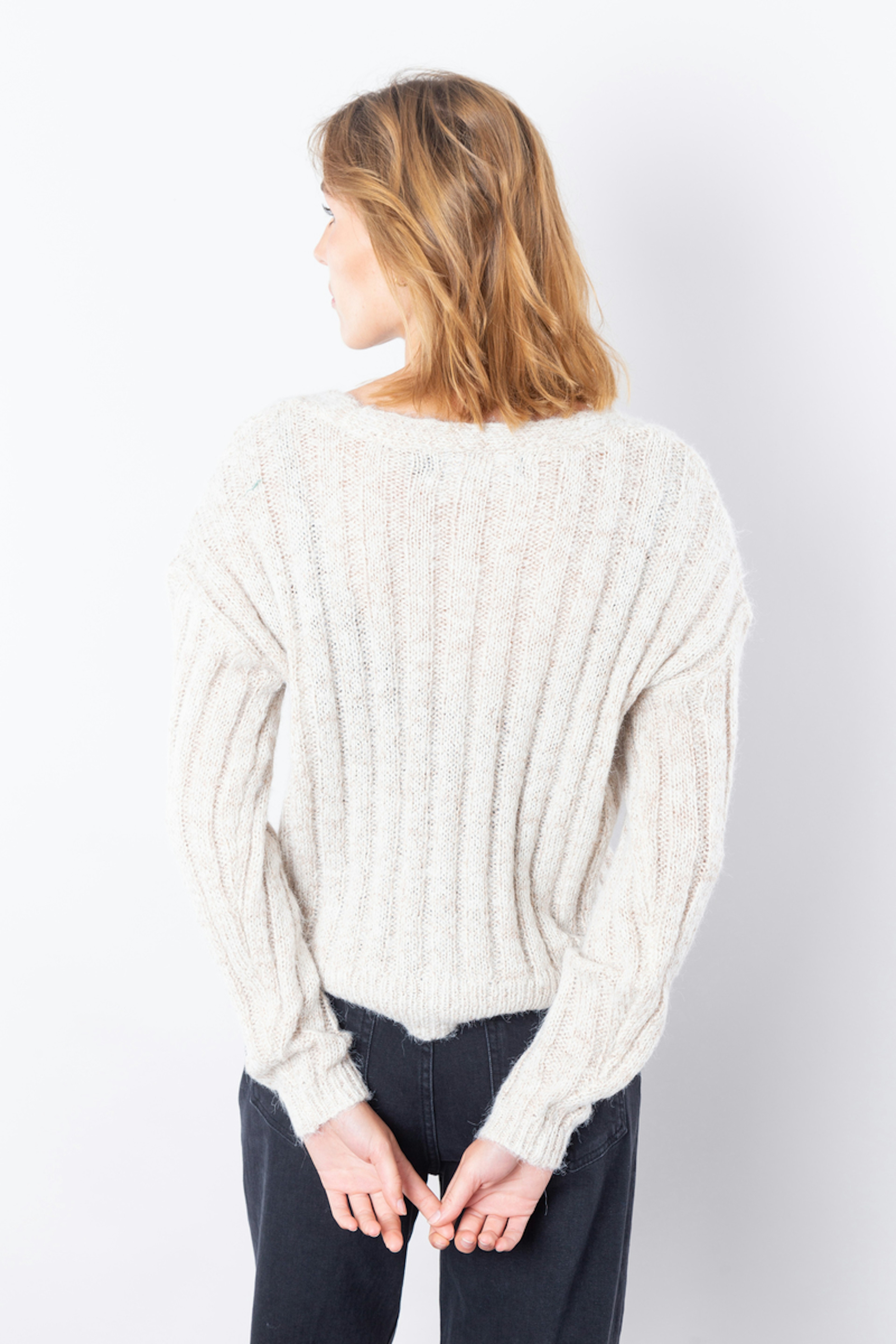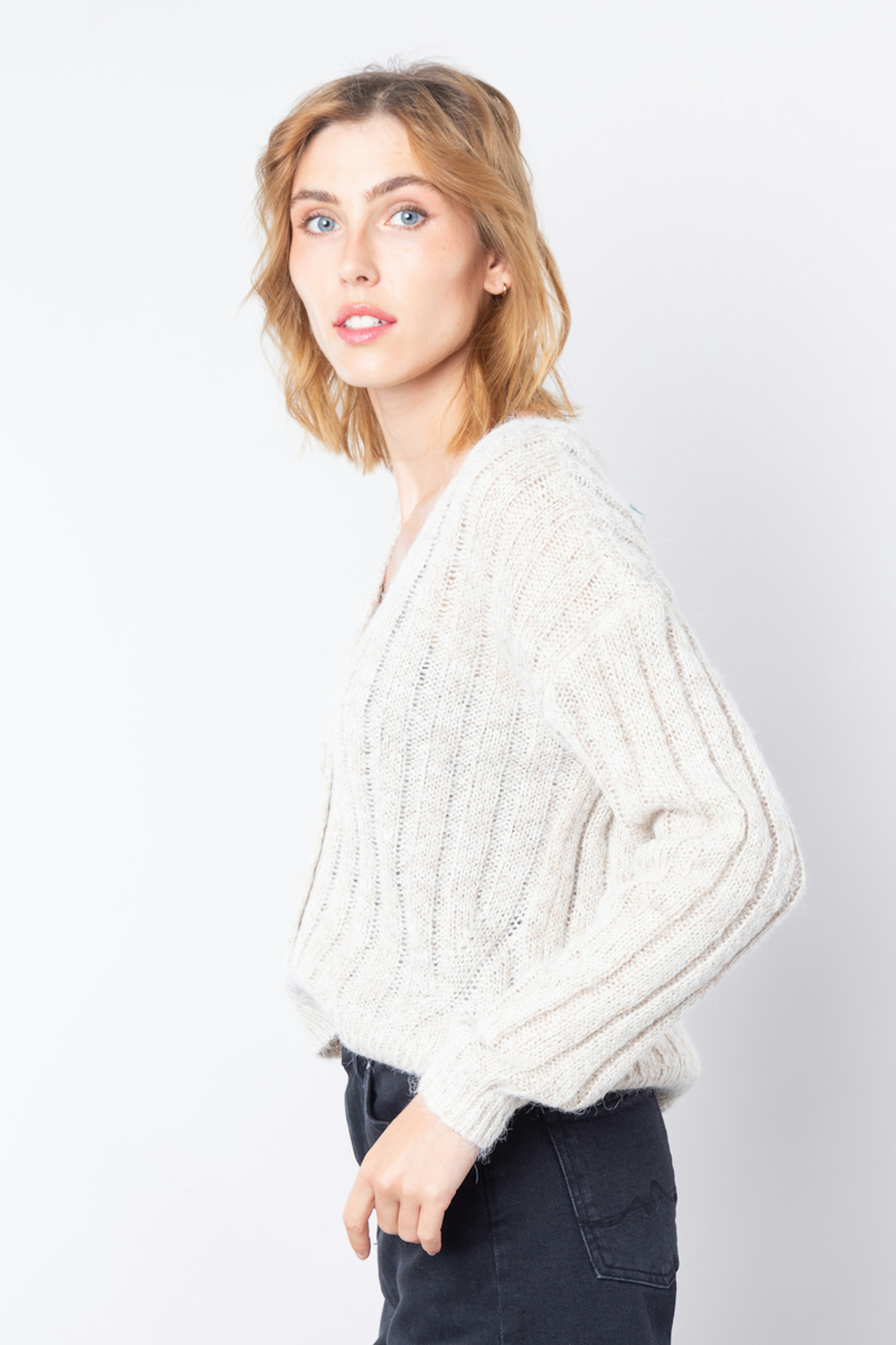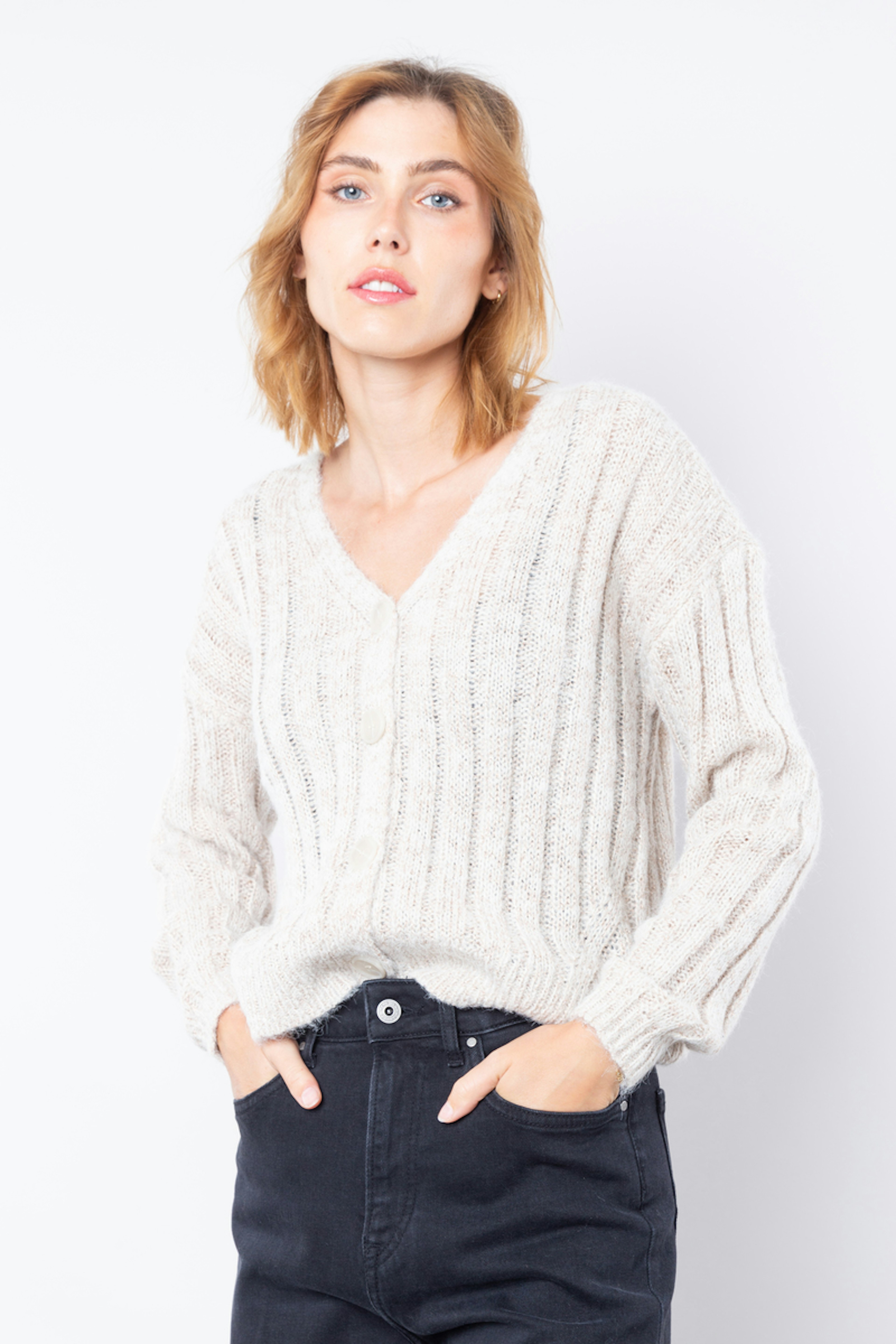 โ€ข Cardigan ร  manches longues beige โ€ข Maille chinรฉe avec lurex โ€ข Boutons ton sur ton โ€ข Col en V โ€ข Contient du polyester recyclรฉ