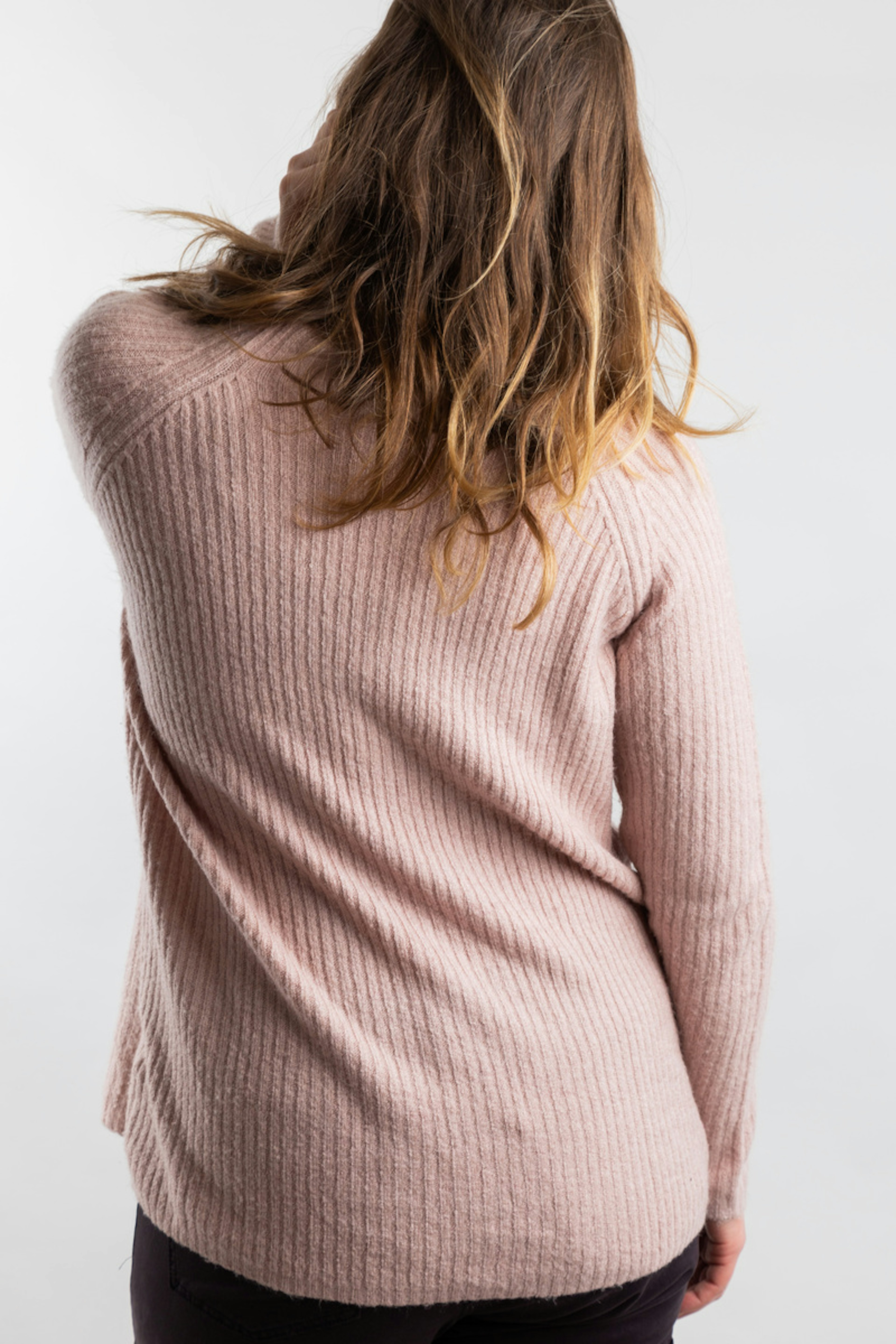โข Pull cรดtelรฉ rose poudrรฉ โข Manches longues โข Col montant โข Coupe classique droite