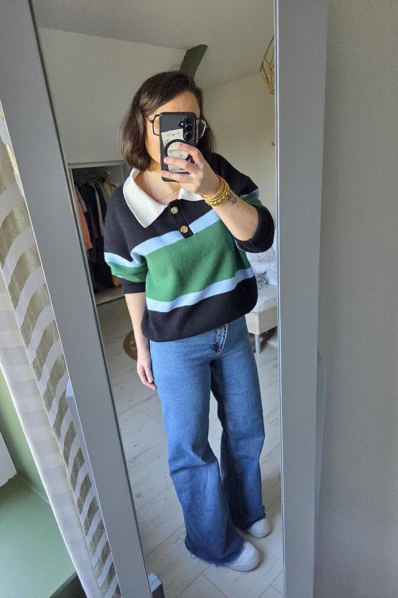 Optez pour un look décontracté en associant ce pull à un jean brut et des baskets blanches. Idéal pour les journées d'hiver relaxantes ! • Pull à rayures • Manches longues • Col chemise boutonné • Coupe ample • Détail boutons dorés