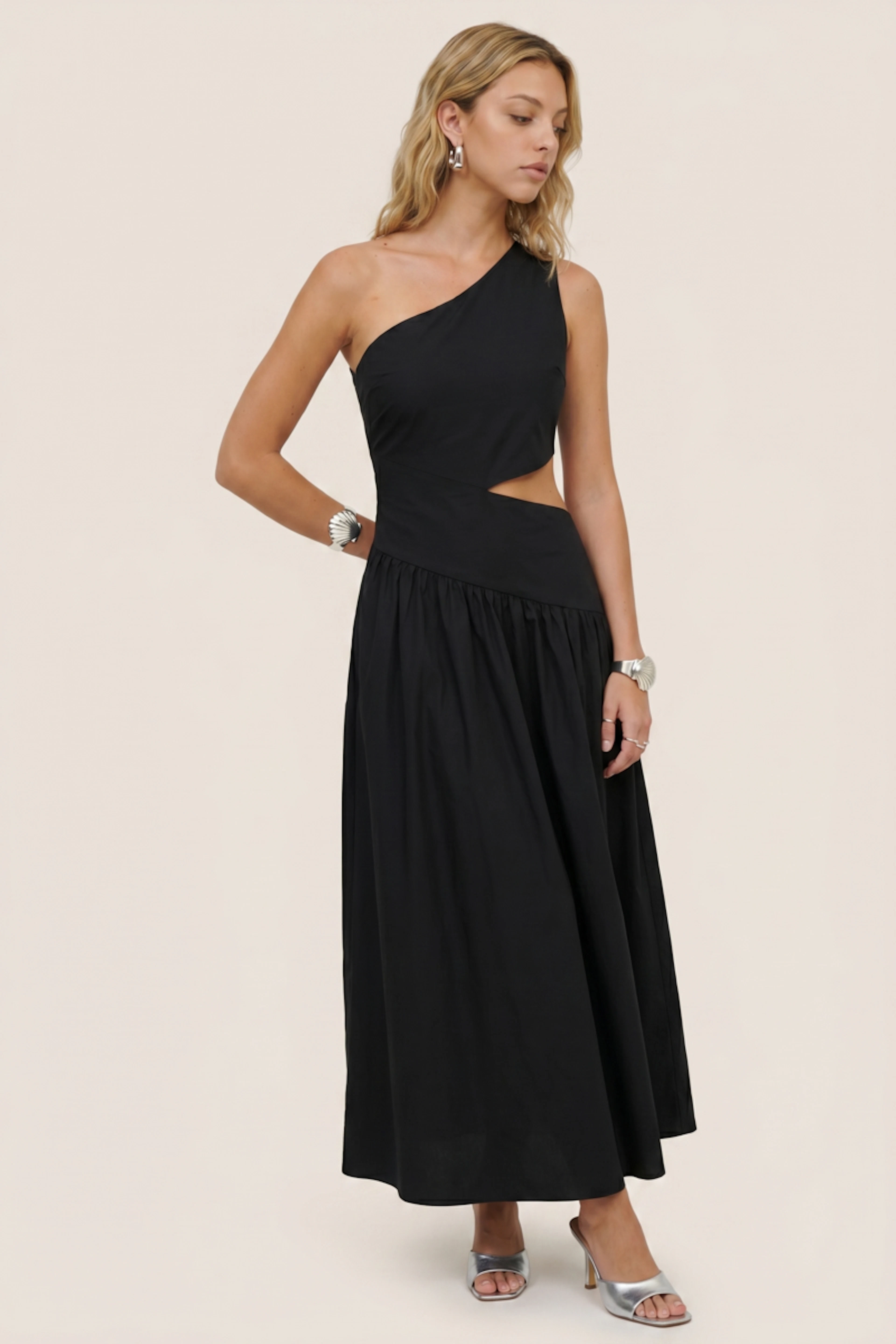 Ajoutez une touche de glamour avec des boucles d’oreilles scintillantes et des sandales métallisées pour une soirée estivale inoubliable. • Robe longue en coton • Coupe asymétrique • Épaule dénudée • Taille découpée • Jupe fluide et ample