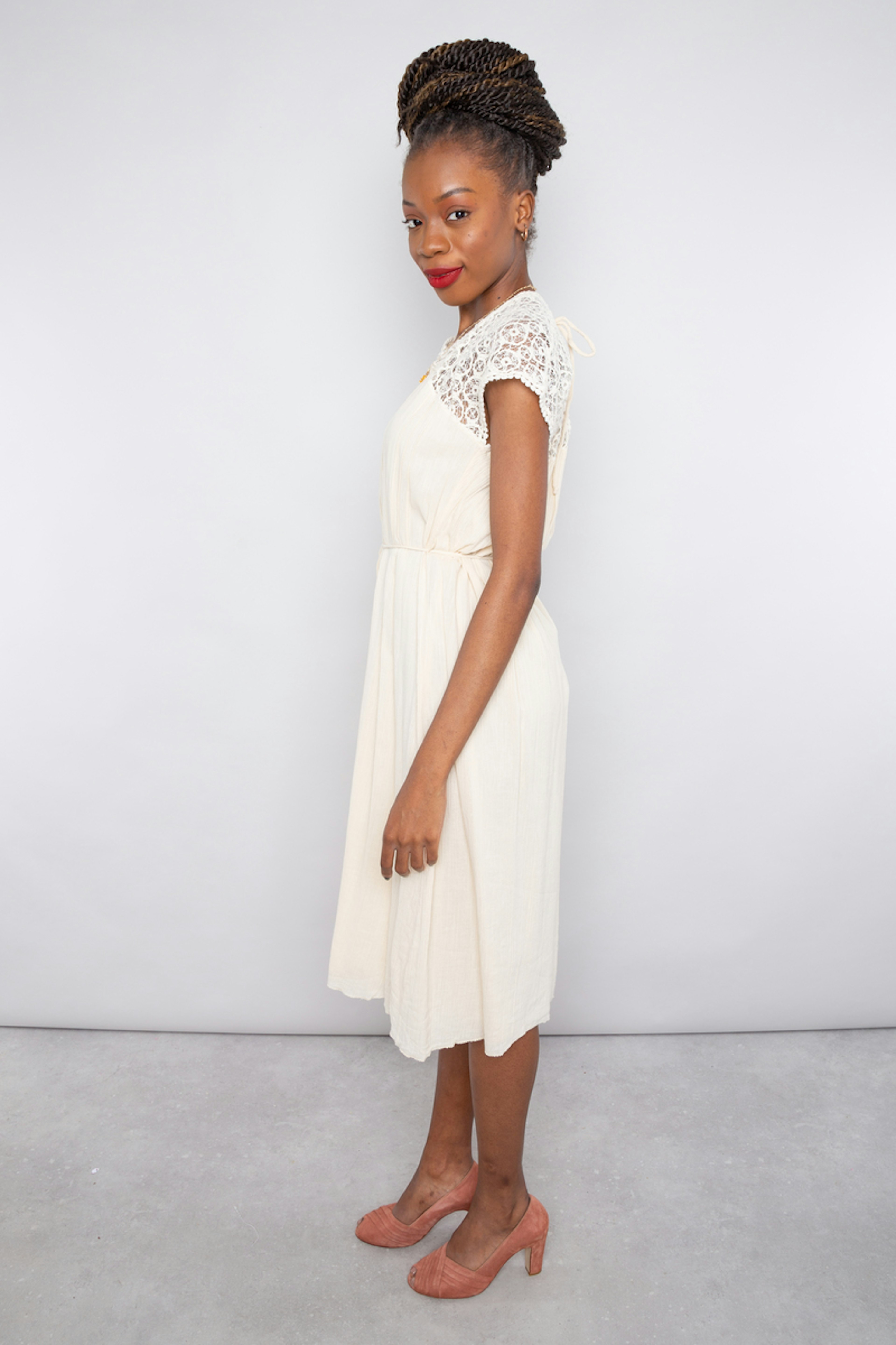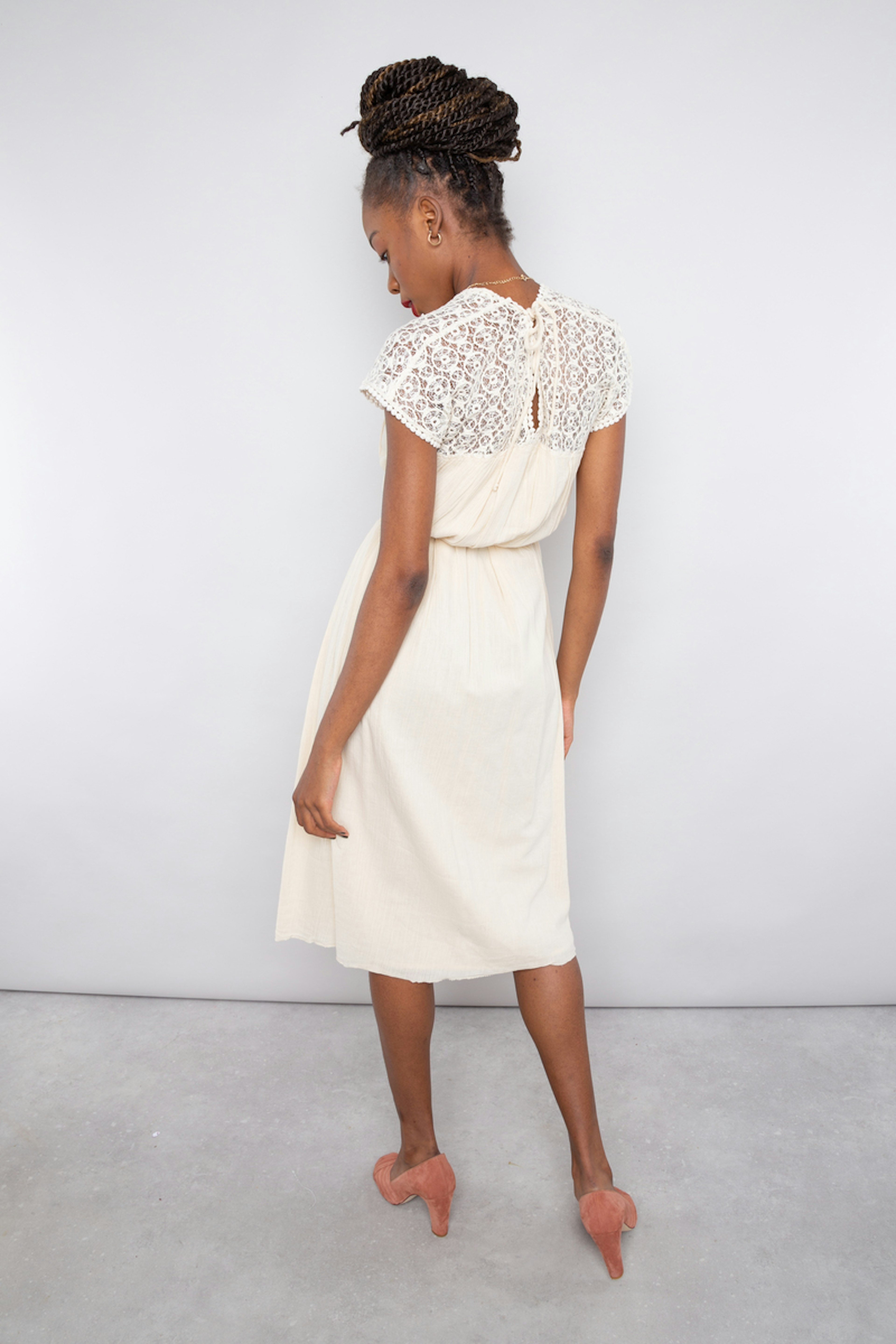 โข Robe longue ร manches courtes en coton bio โข Encolure et emmanchures en dentelle โข Dos nus rรฉhaussรฉ d'un lien ร nouer derriรจre le cou โข Finition de dentelle festonnรฉe sur les bords โข Lien ร nouer ร la taille โข Doublure