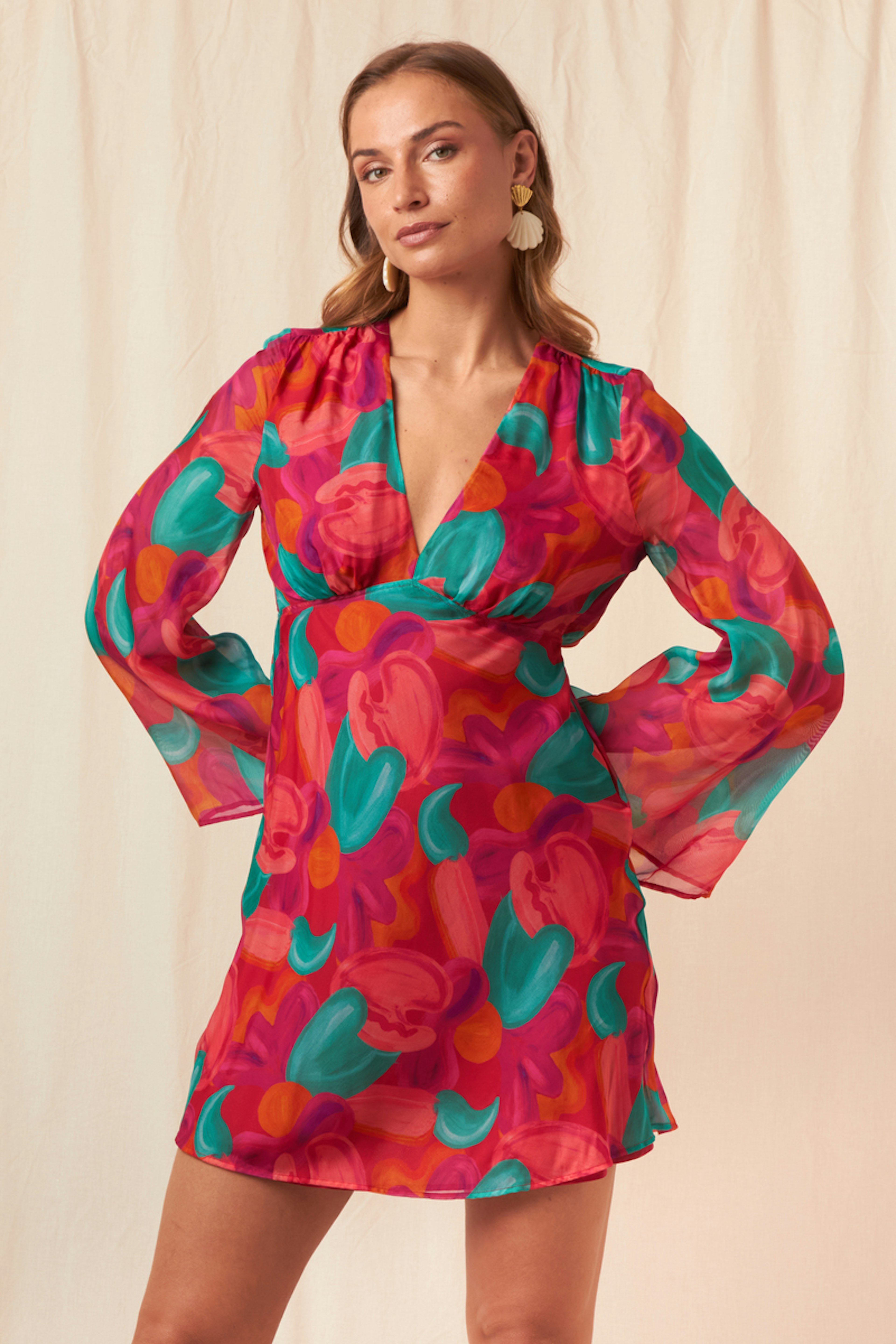 Portez cette robe avec des sandales à lanières et des boucles d'oreilles dorées pour un look estival vibrant. • Robe courte • Manches amples • Col en V • Dos nu séduisant • Robe doublée Modèle qui taille petit, privilégiez la taille au dessus.