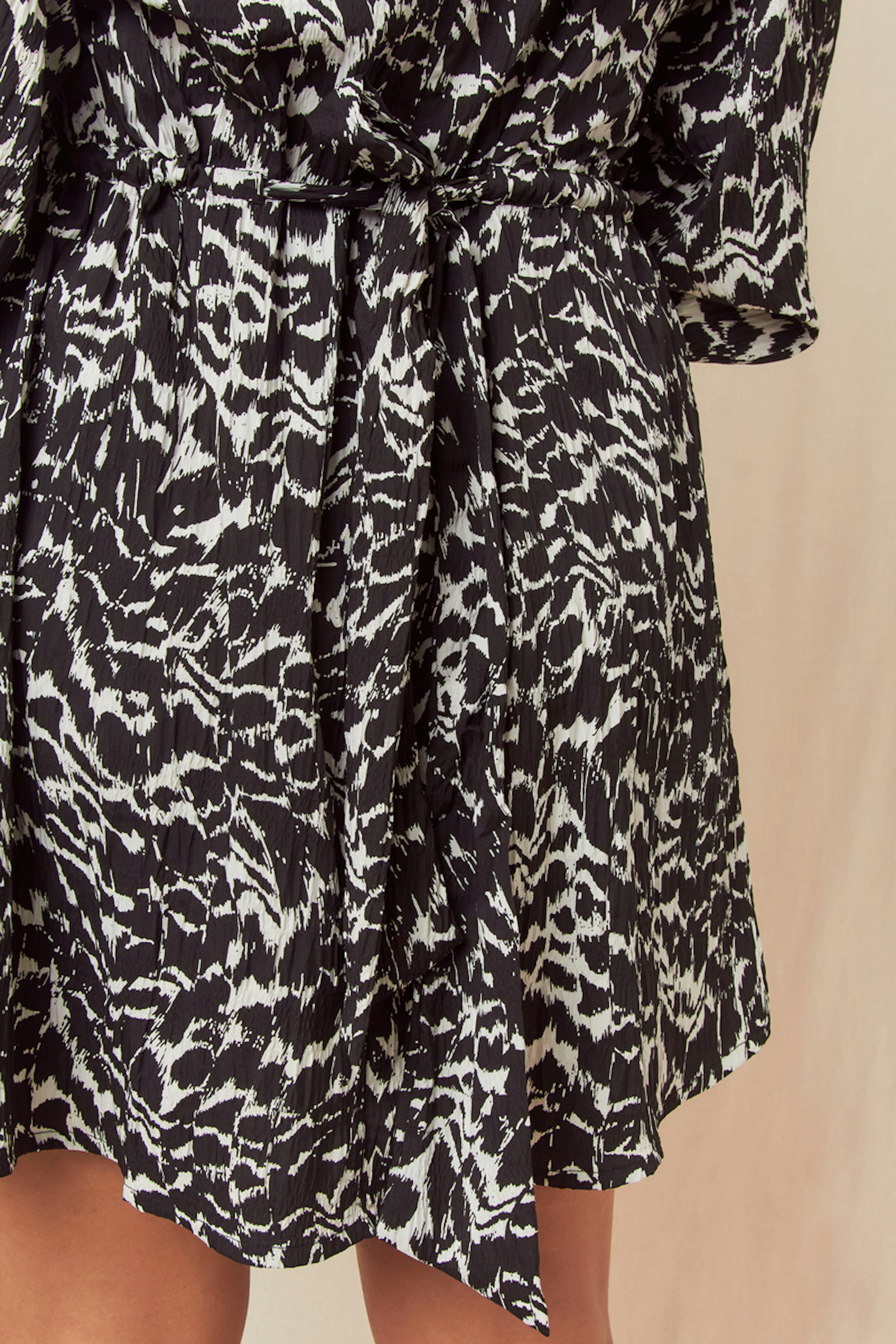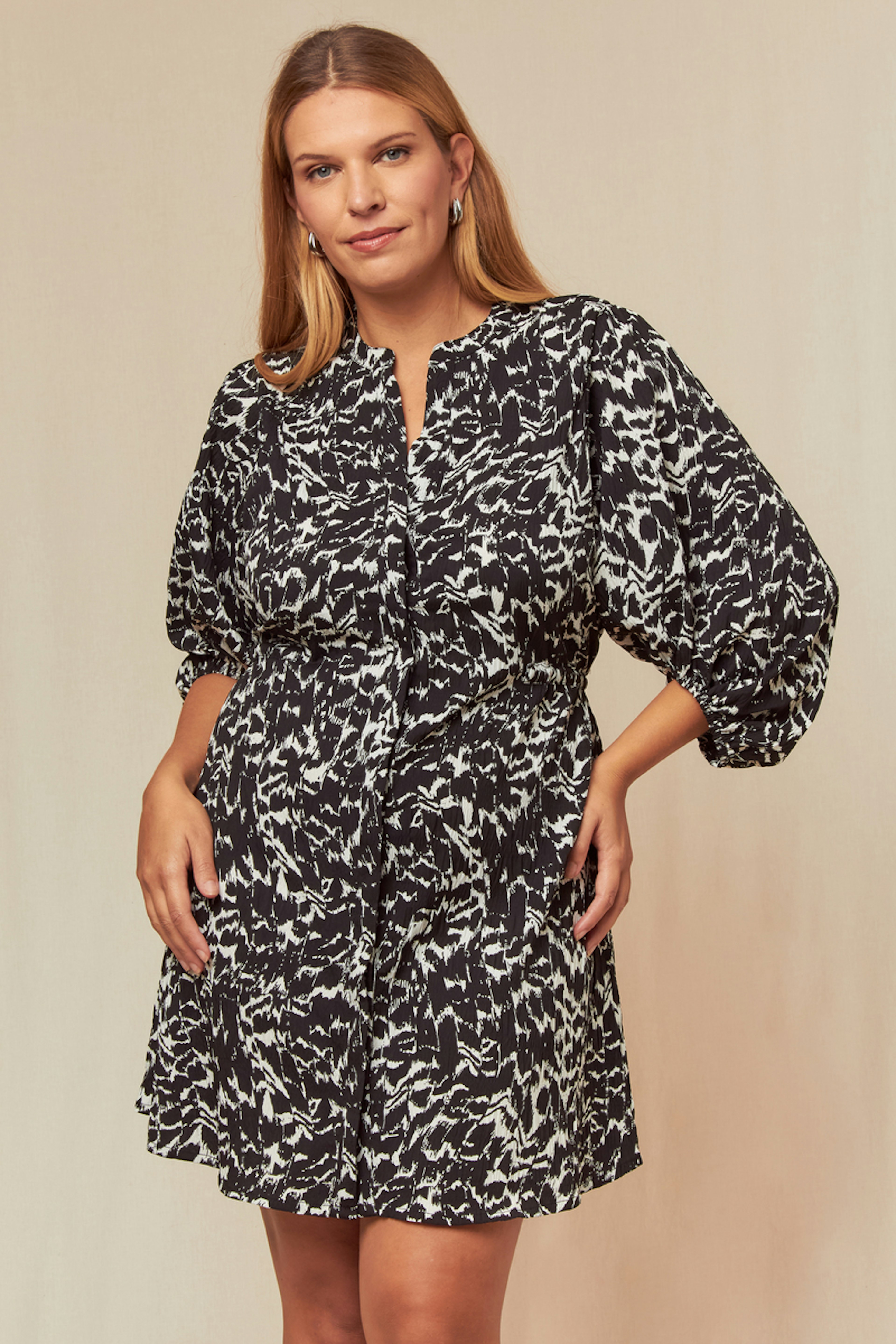 Associez cette robe chemise à sandales en cuir et une pochette minimaliste pour une allure chic et estivale. • Robe chemise, longueur genoux • Col Mao élégant • Manches ballon élastiquées • Patte de boutonnage cachée • Ceinture ajustable