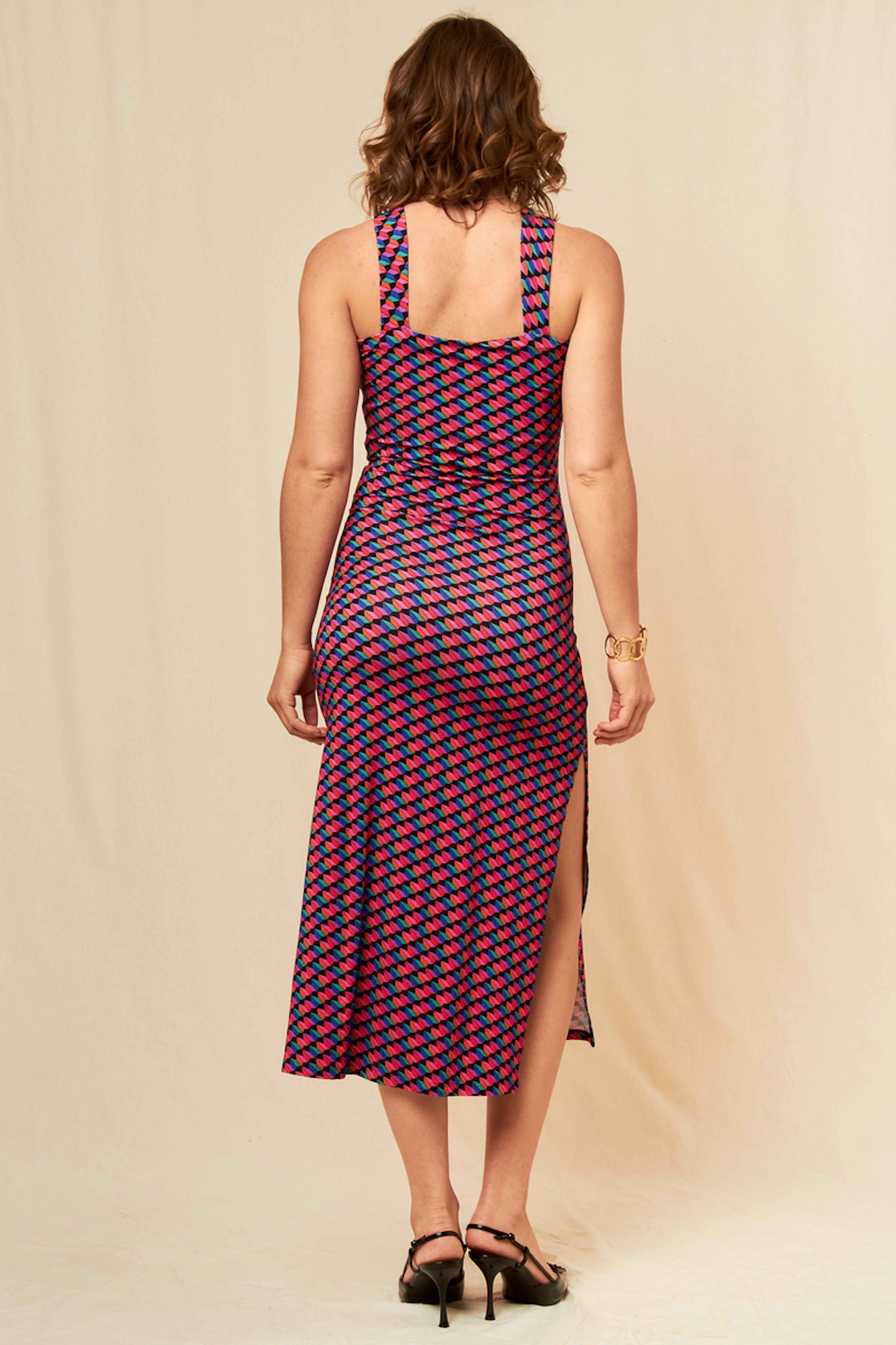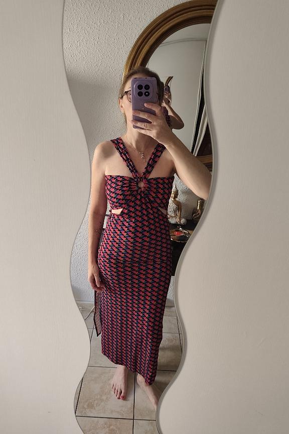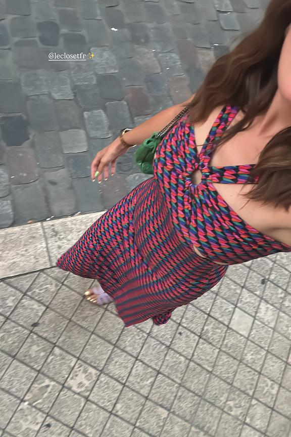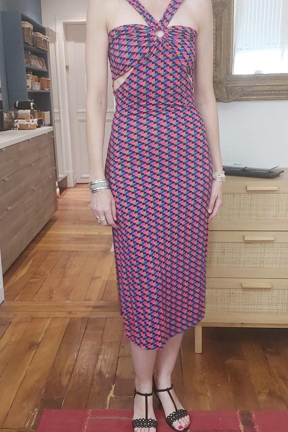 Associez cette robe à des sandales dorées et un chapeau de paille pour une allure estivale chic. • Robe longue • Découpe asymétrique • Bretelles croisées • Motif imprimé • Fente latérale