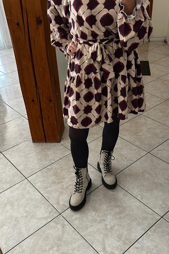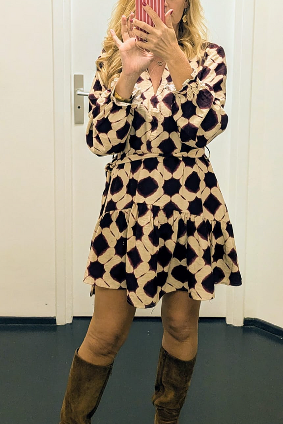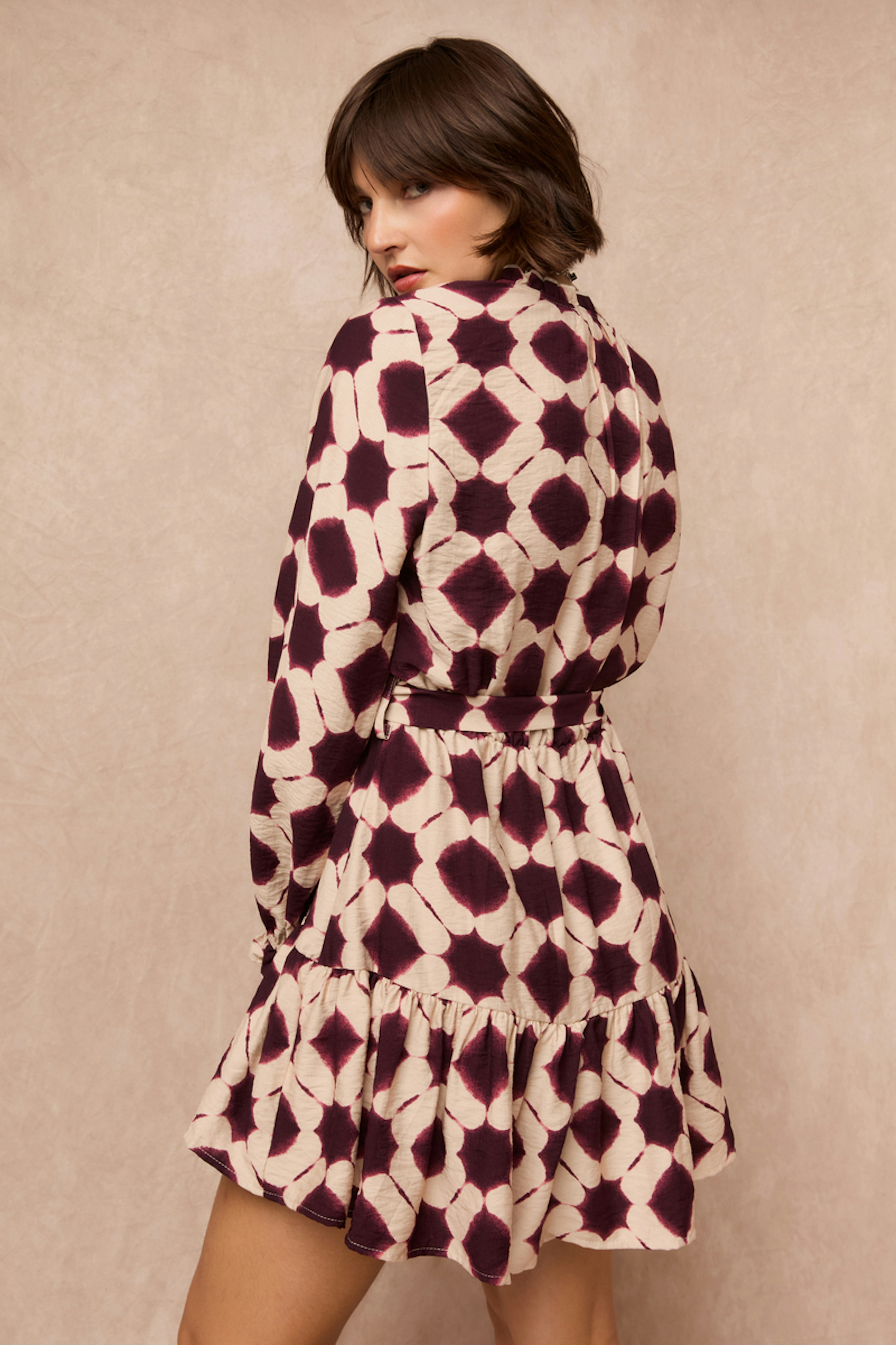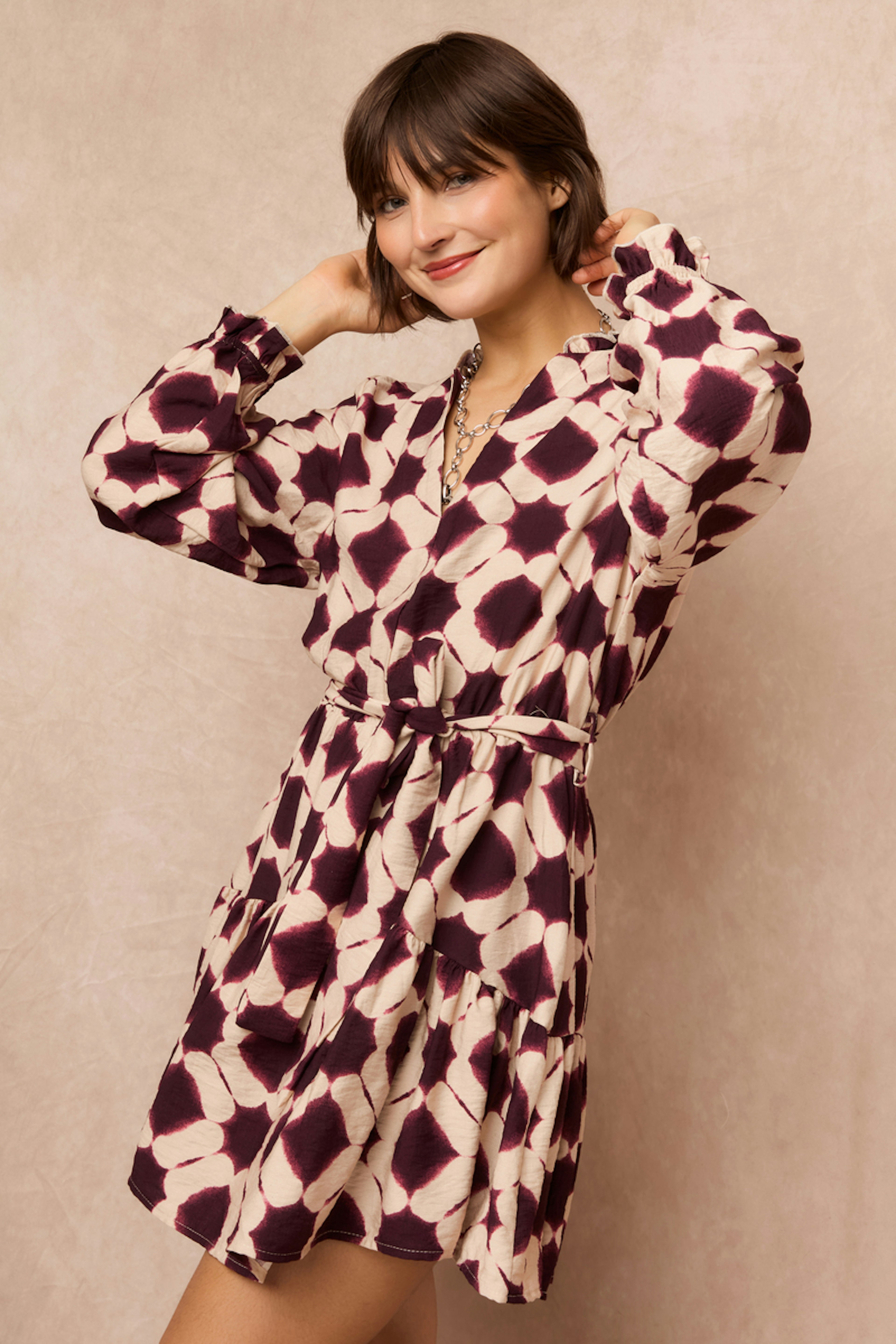 Associez cette robe à des bottines en cuir et un manteau structuré pour un look moderne et sophistiqué en hiver. • Robe courte • Manches longues bouffantes • Taille ceinturée • Encolure ronde • Imprimé graphique