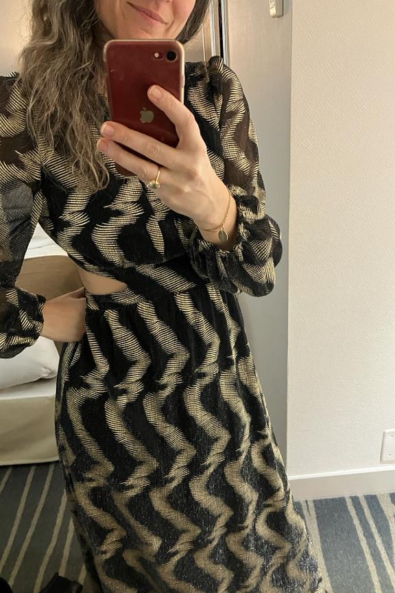 โข Robe longue en lurex โข Dรฉcoupes ajourรฉes sur les cรดtรฉs โข Col rond avec empiรจcement en V ajourรฉ โข Manches longues pagodes โข Zip au dos