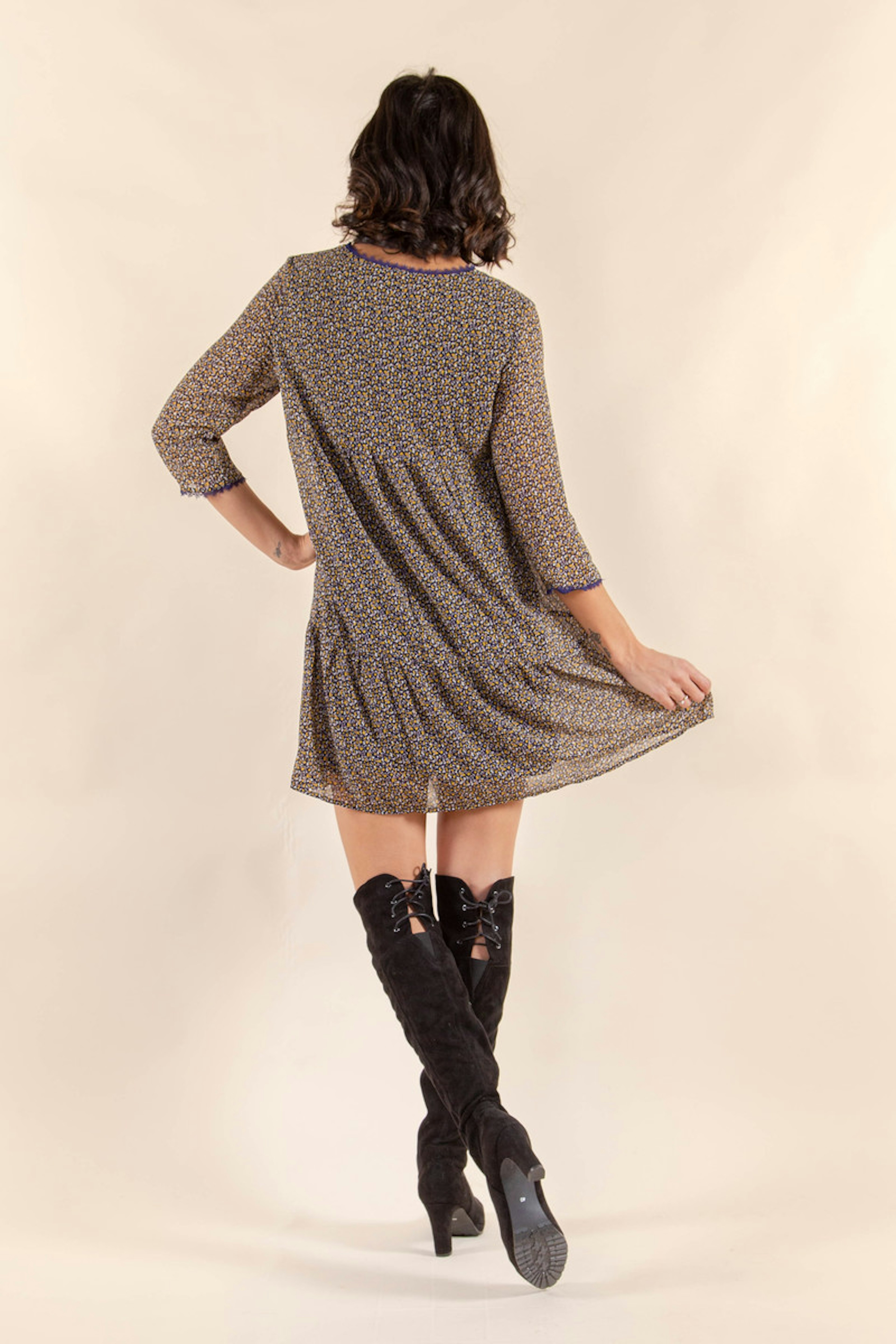 Cette robe ร imprimรฉ graphique est parfaite pour la mi-saison ! Son imprimรฉ jaune, gris et marine vous permettra de l'associer facilement !