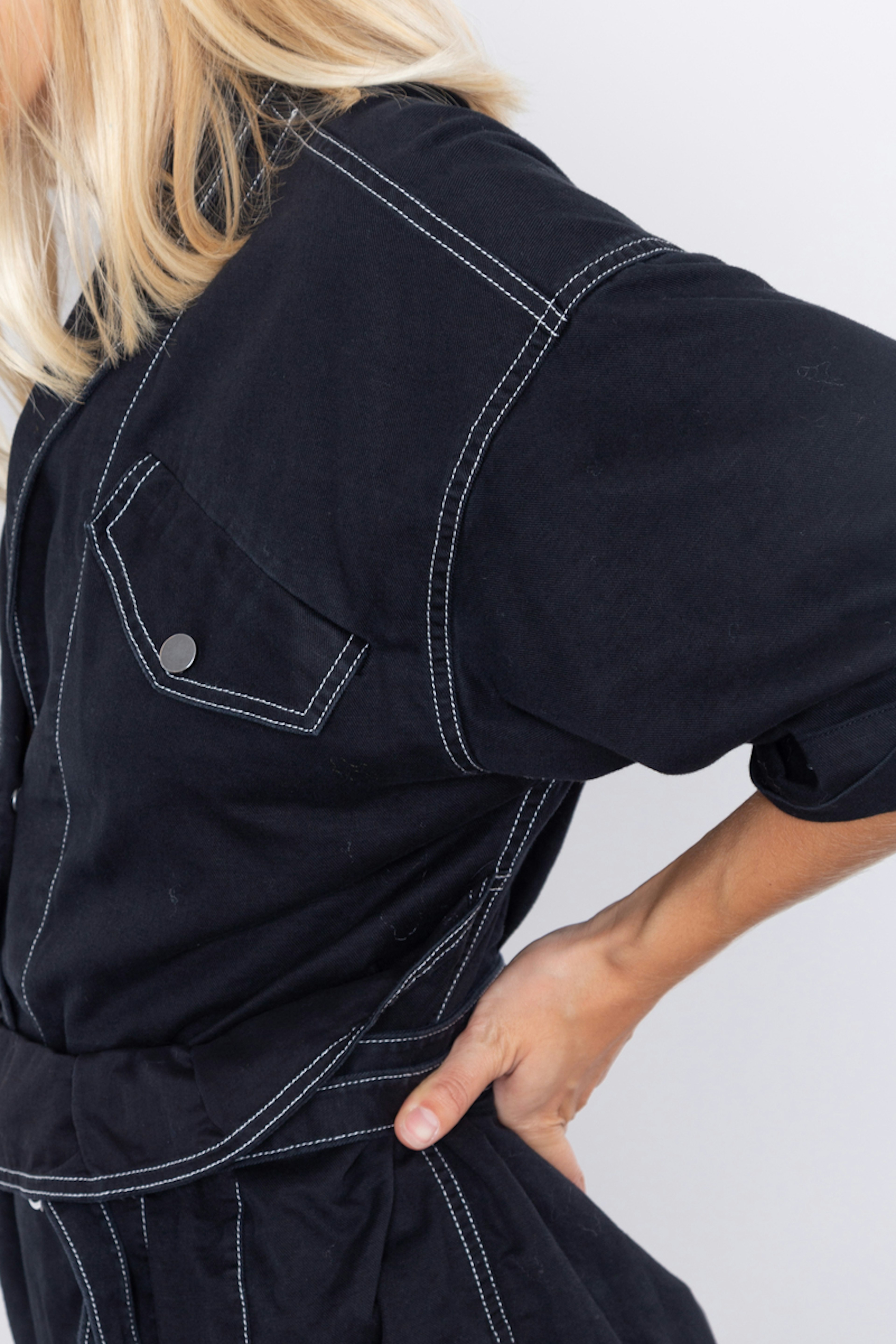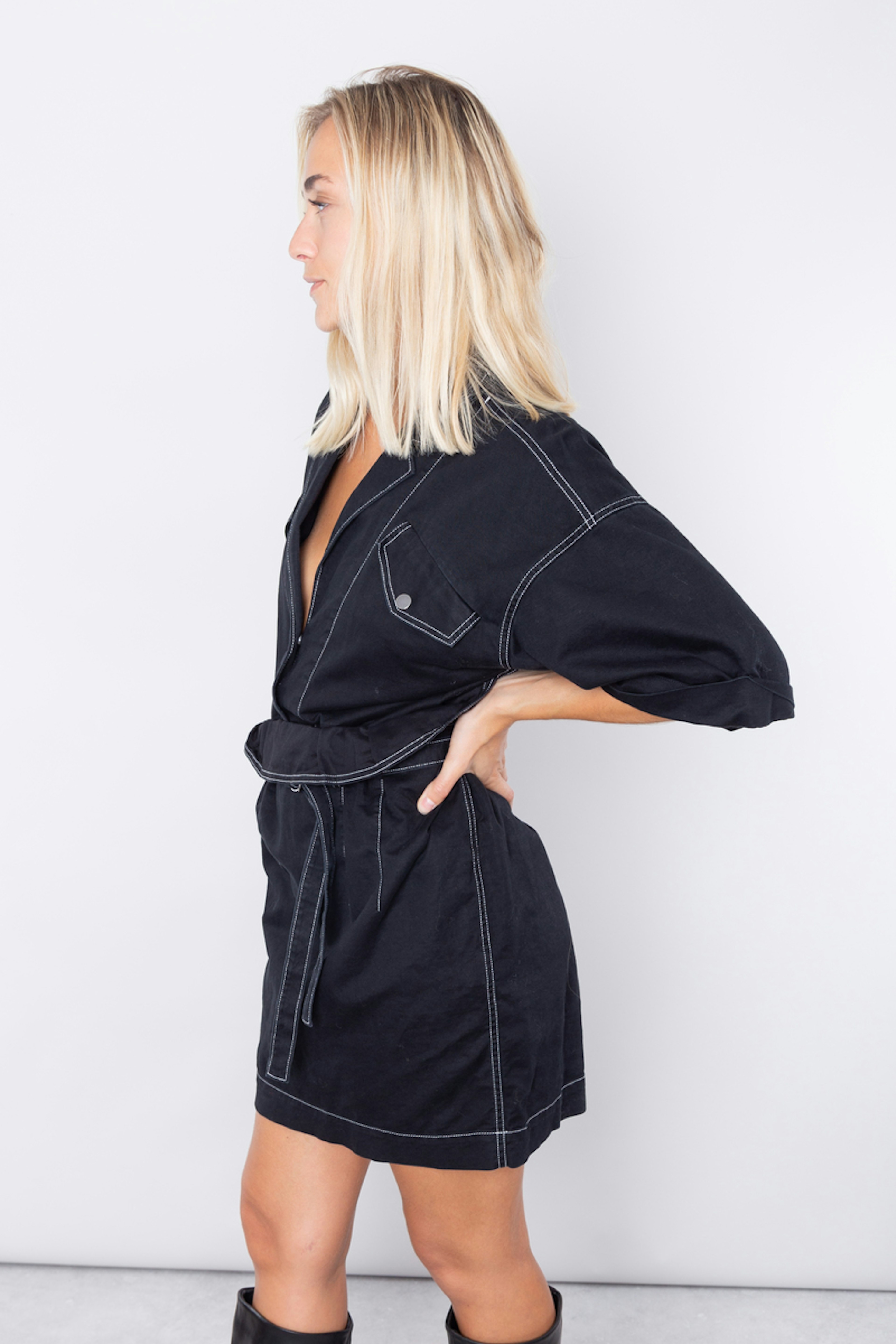 โข Robe chemise noire โข Poches ร rabat sur la poitrine โข Liserรฉ blanc sur les coutures โข Manches longues โข Col chemise boutonnรฉ avec boutons pression โข Ceinturรฉe ร la taille par une ceinture en tissu โข Coupe lรฉgรจrement oversize