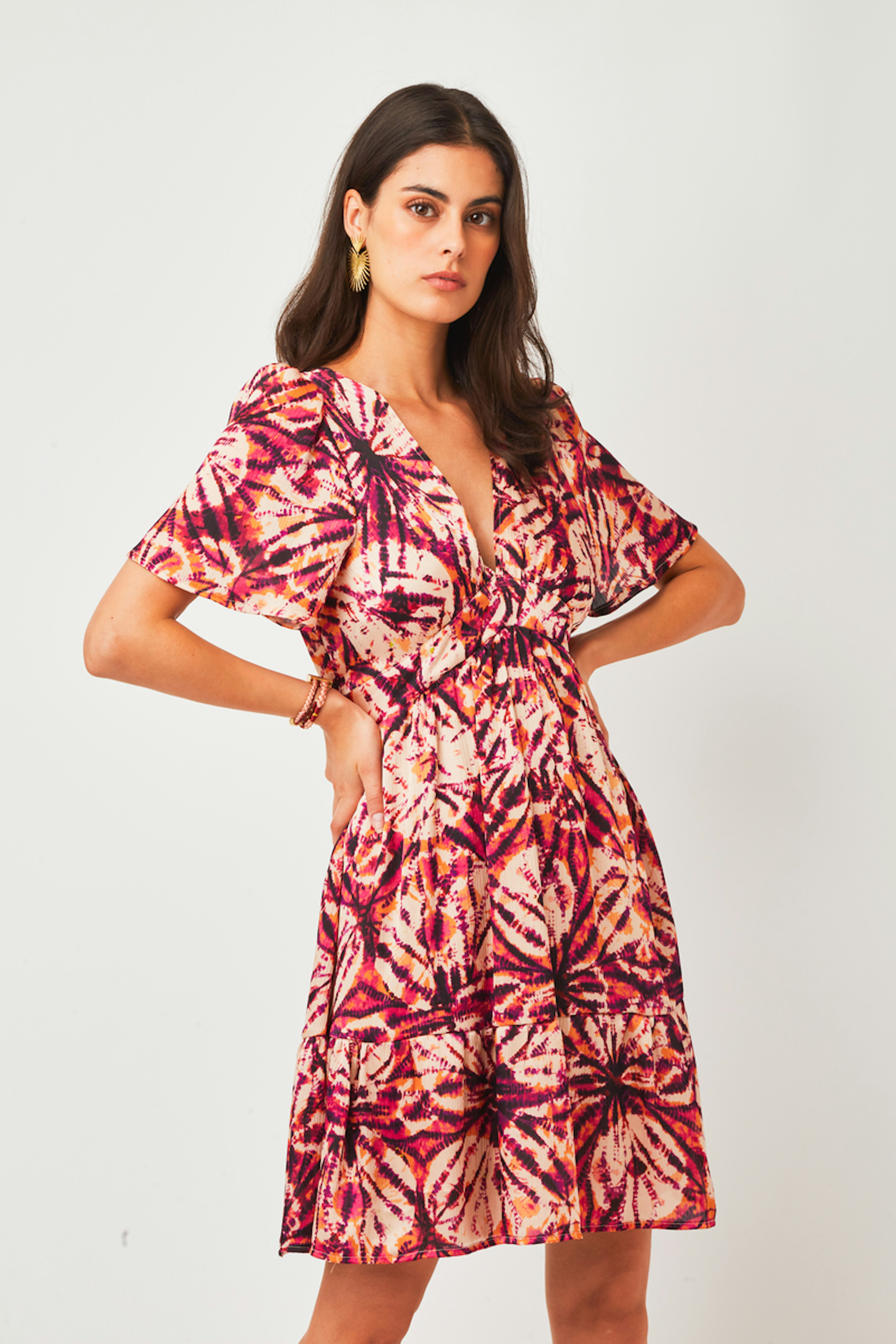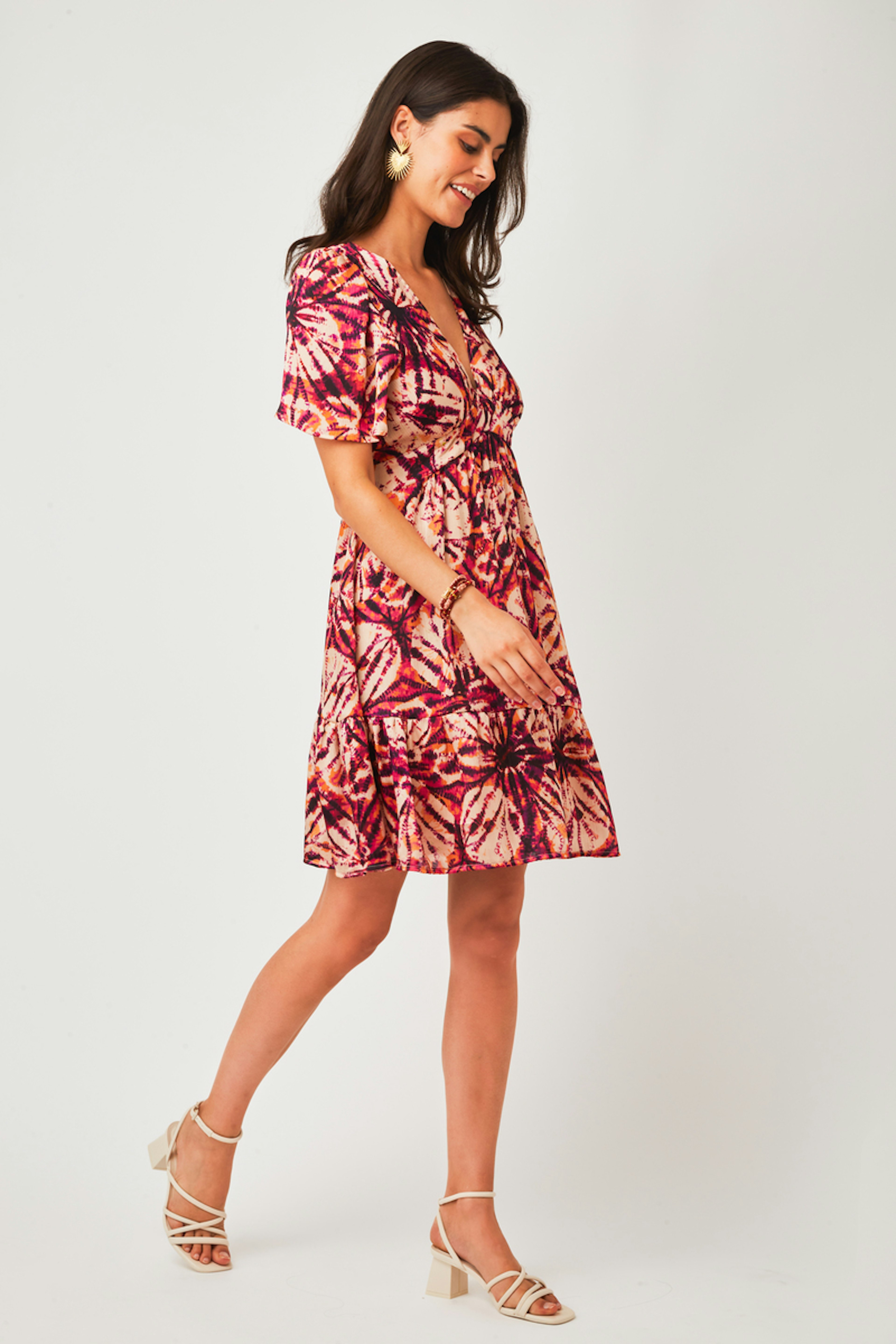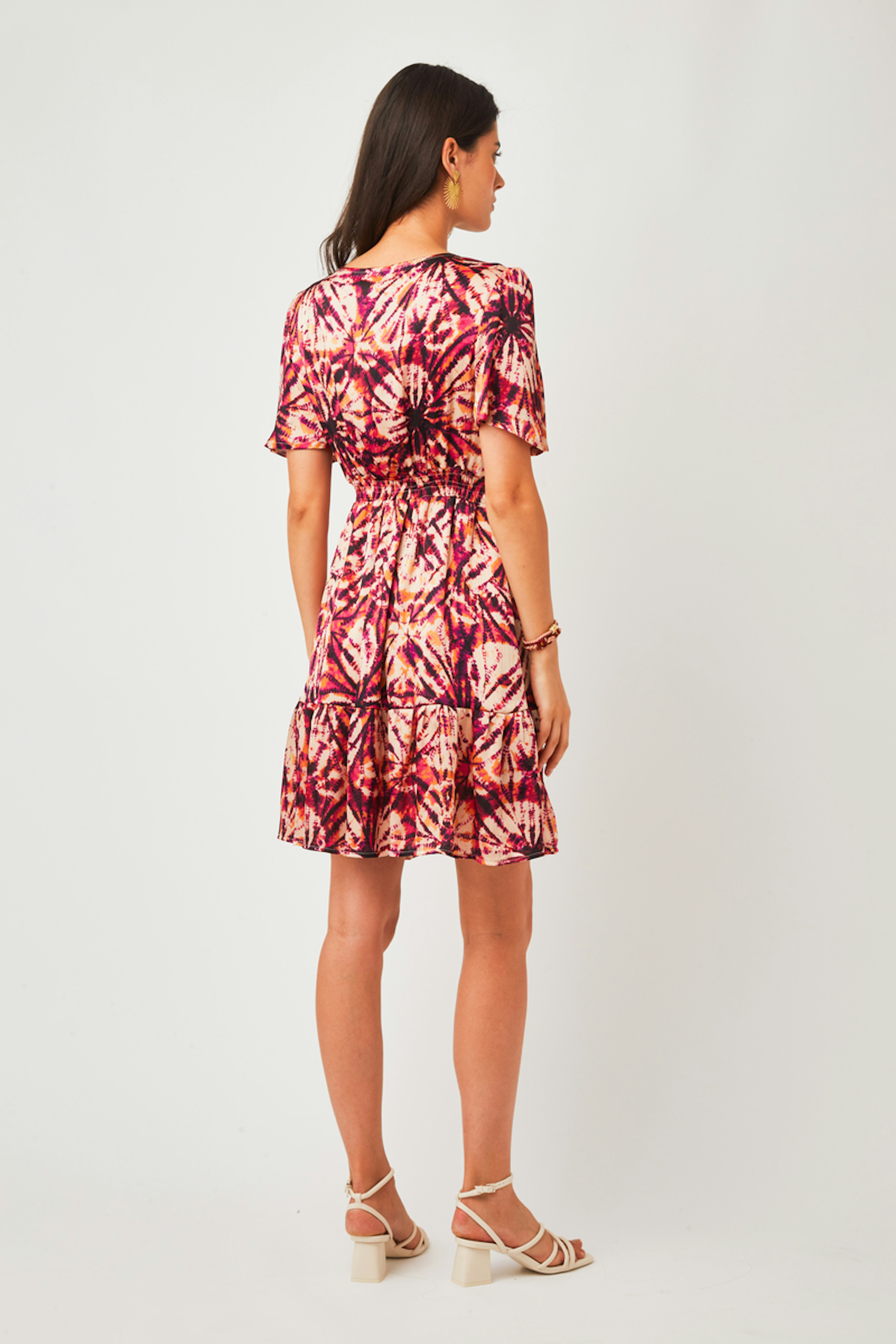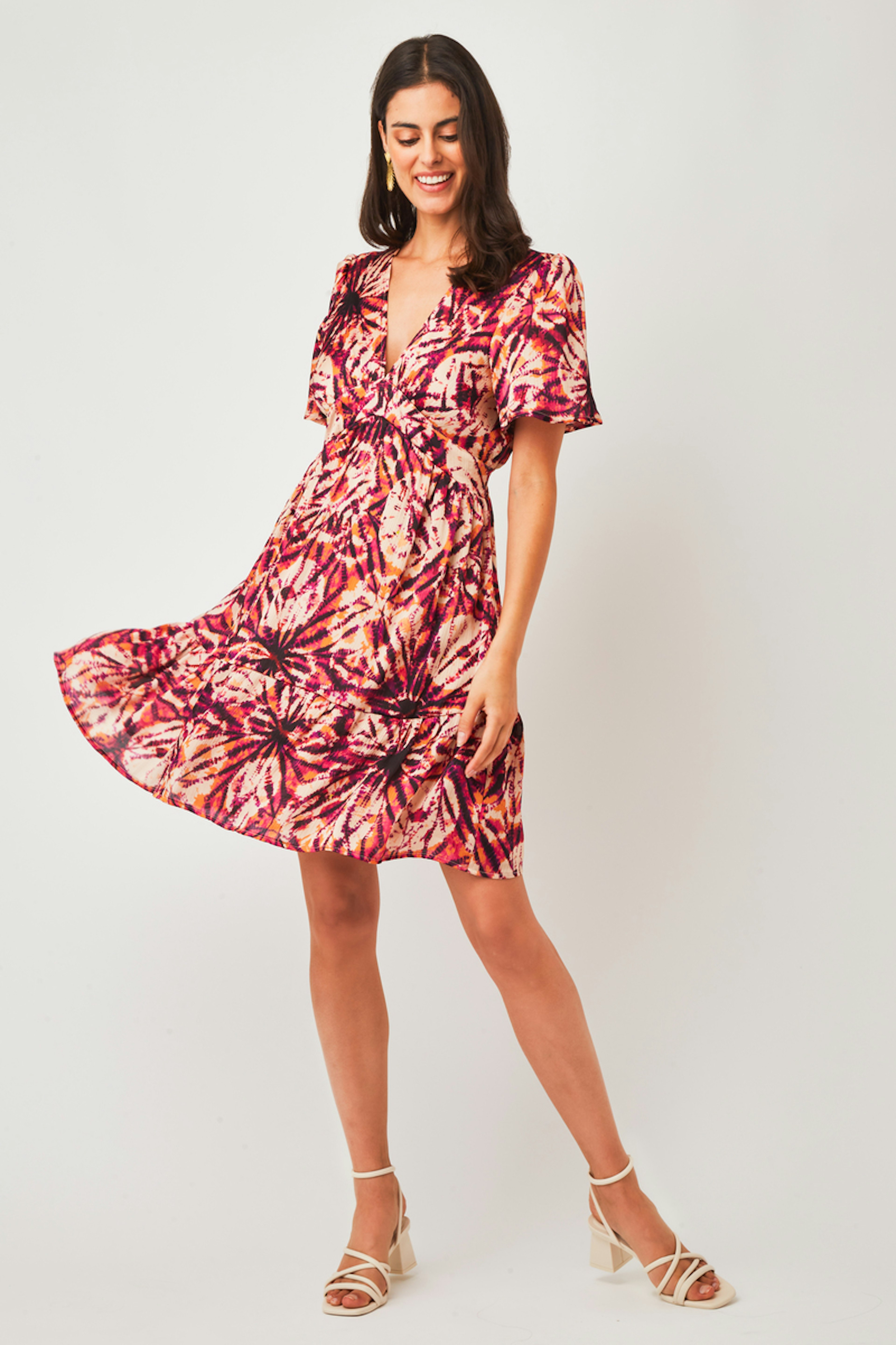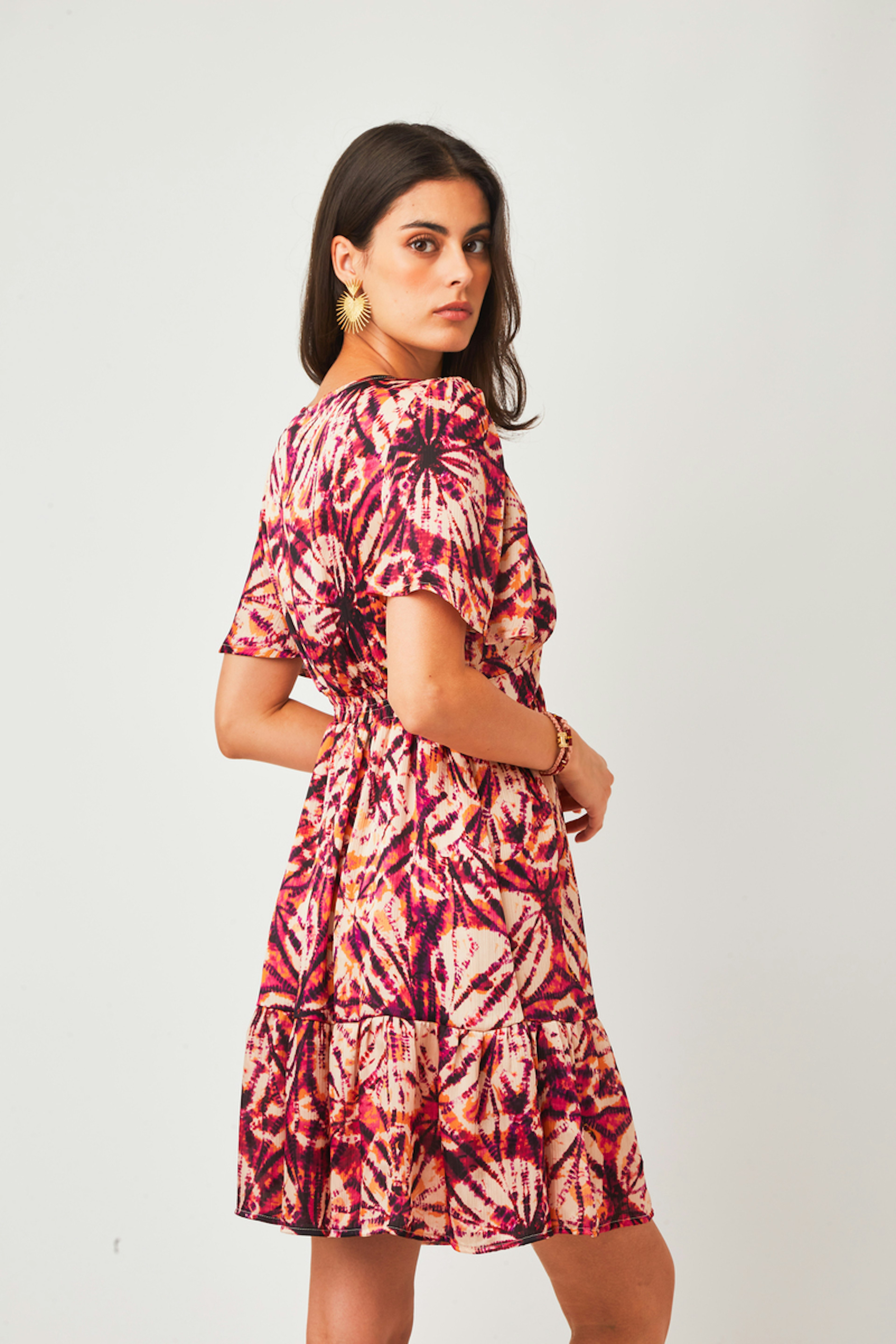 โข Robe Aniela โข Coupe patineuse ajustรฉe ร la taille โข Motif abstrait โข Tissu fluide โข Longueur genoux โข Col en V โข Manches courtes โข Volants en bas du produit