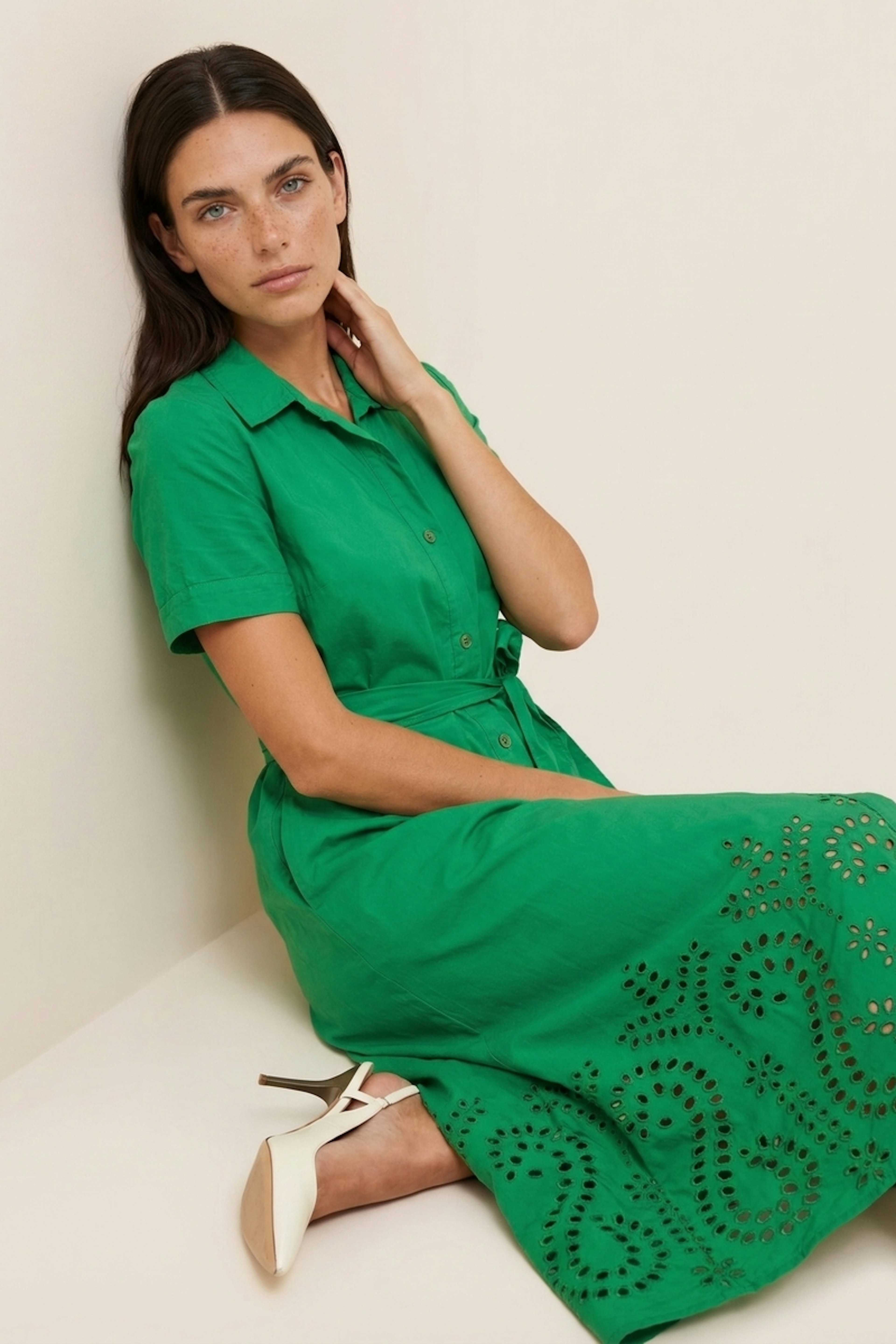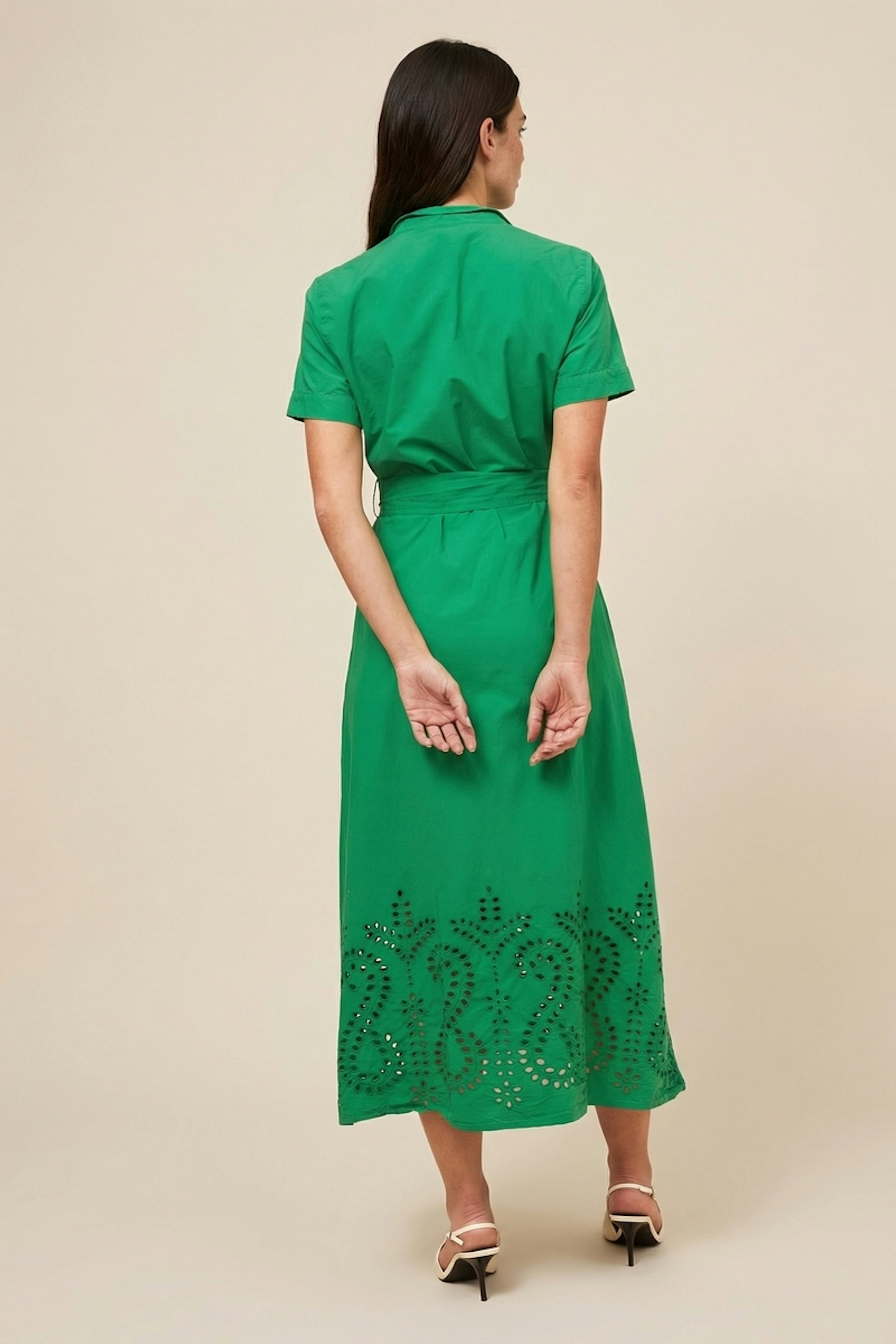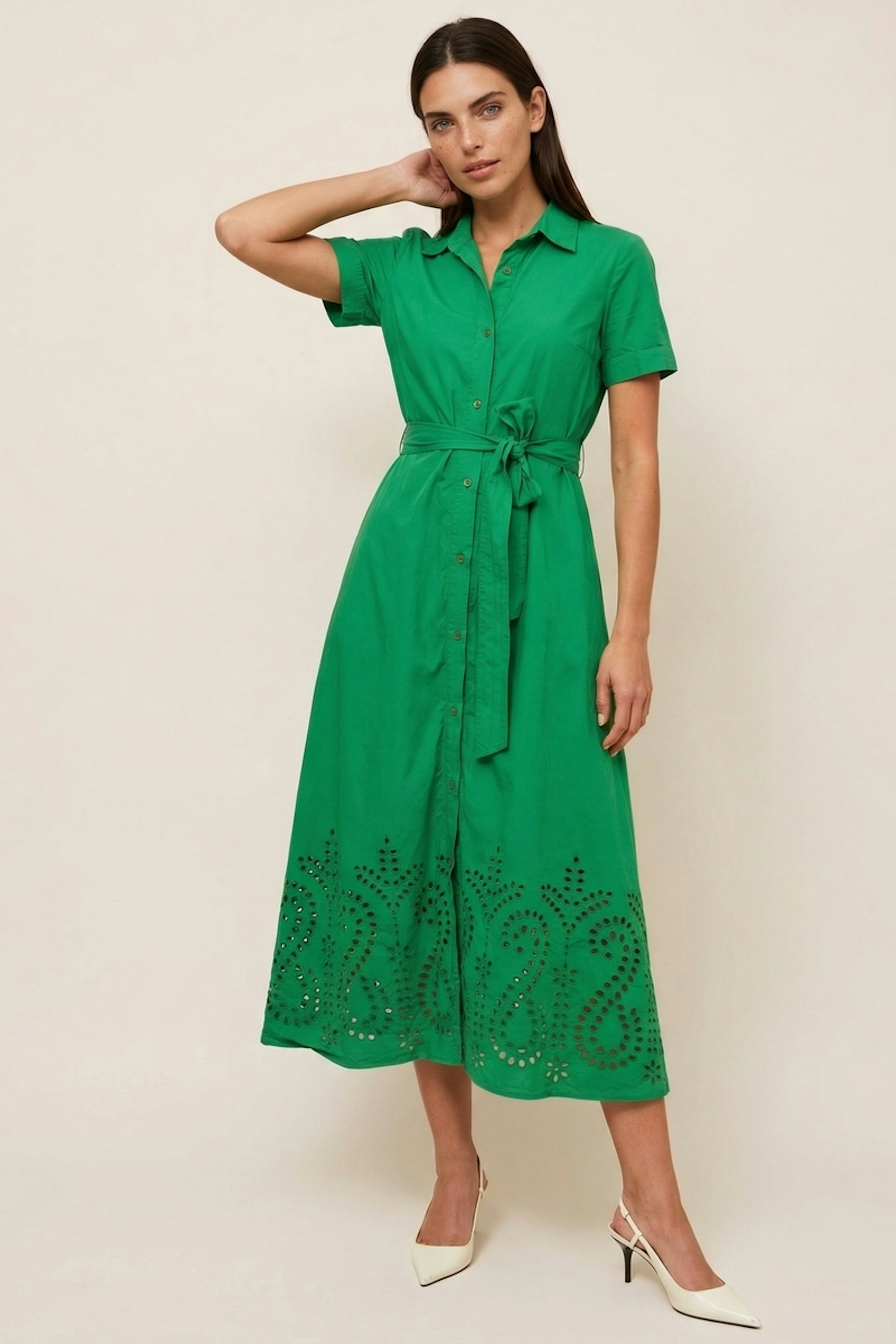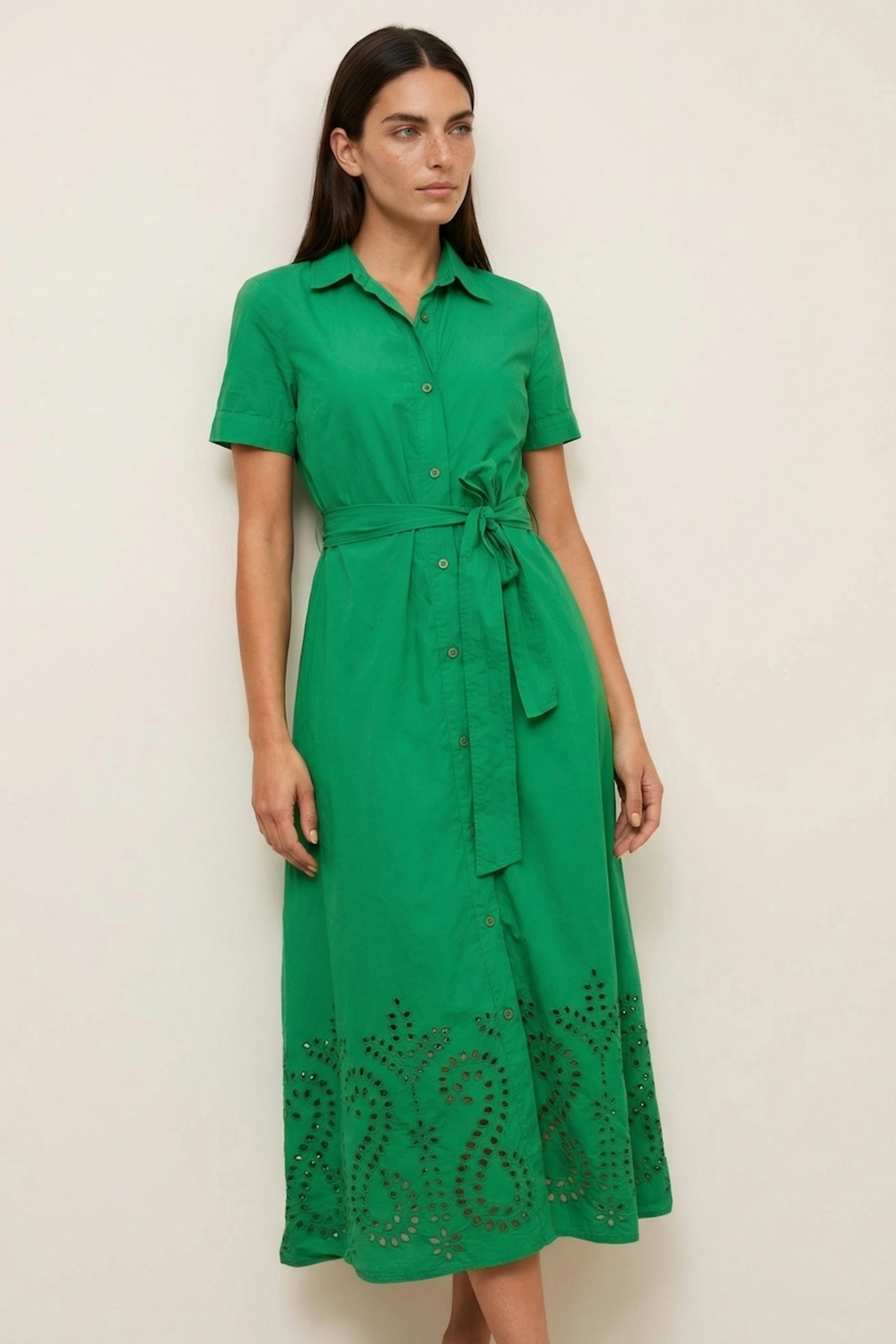 Pour un look estival chic, associez cette robe avec des sandales dorées et des boucles d'oreilles discrètes pour une touche de glamour. • Robe midi en coton • Coupe chemise • Manches courtes • Ceinture à nouer à la taille amovible • Détails ajourés en bas de la robe