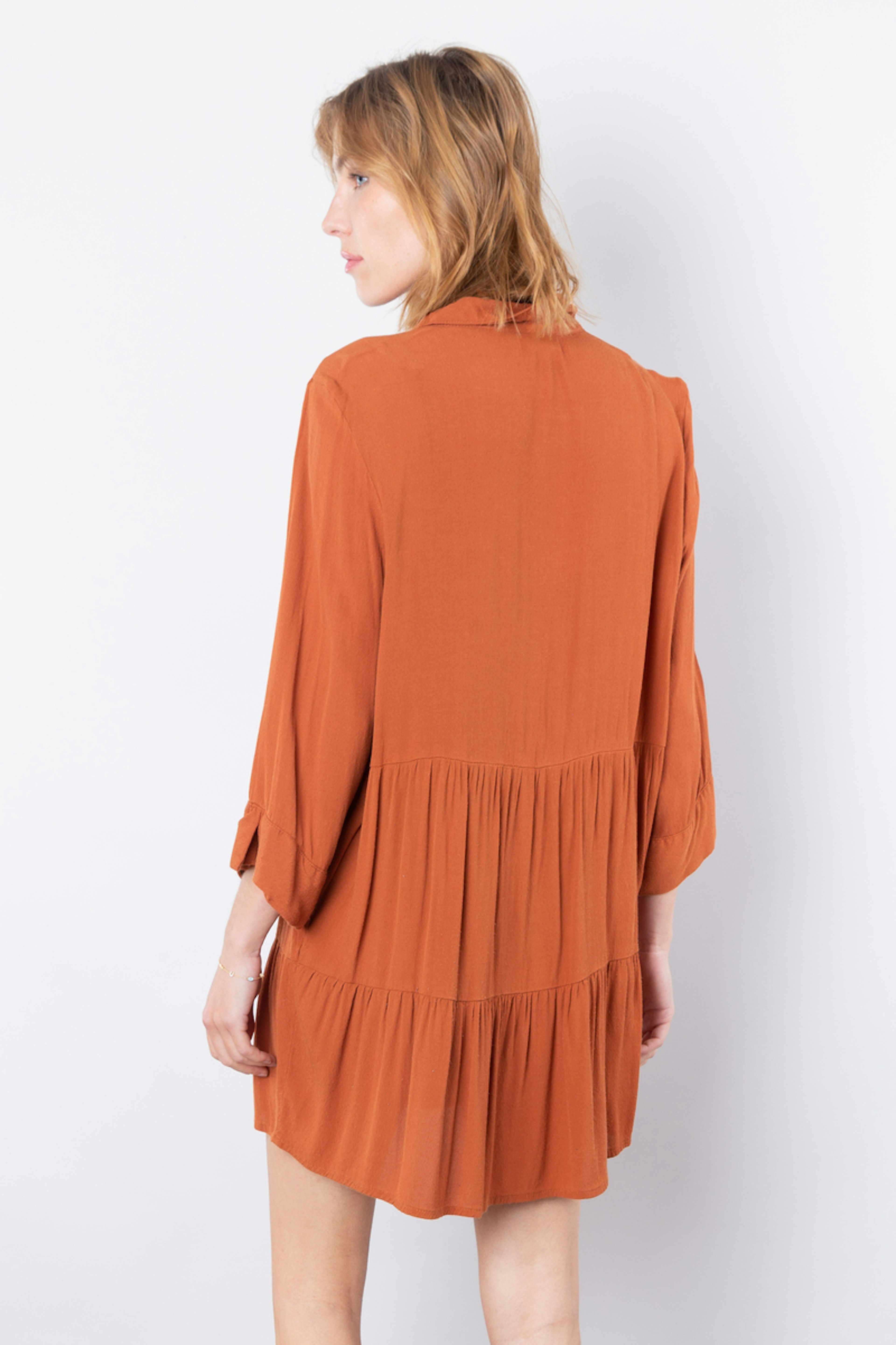 โข Robe chemise courte orangรฉe โข Patte de boutonnage โข Col chemise โข Manches 3/4 โข Volants plissรฉs sur le bas de la robe
