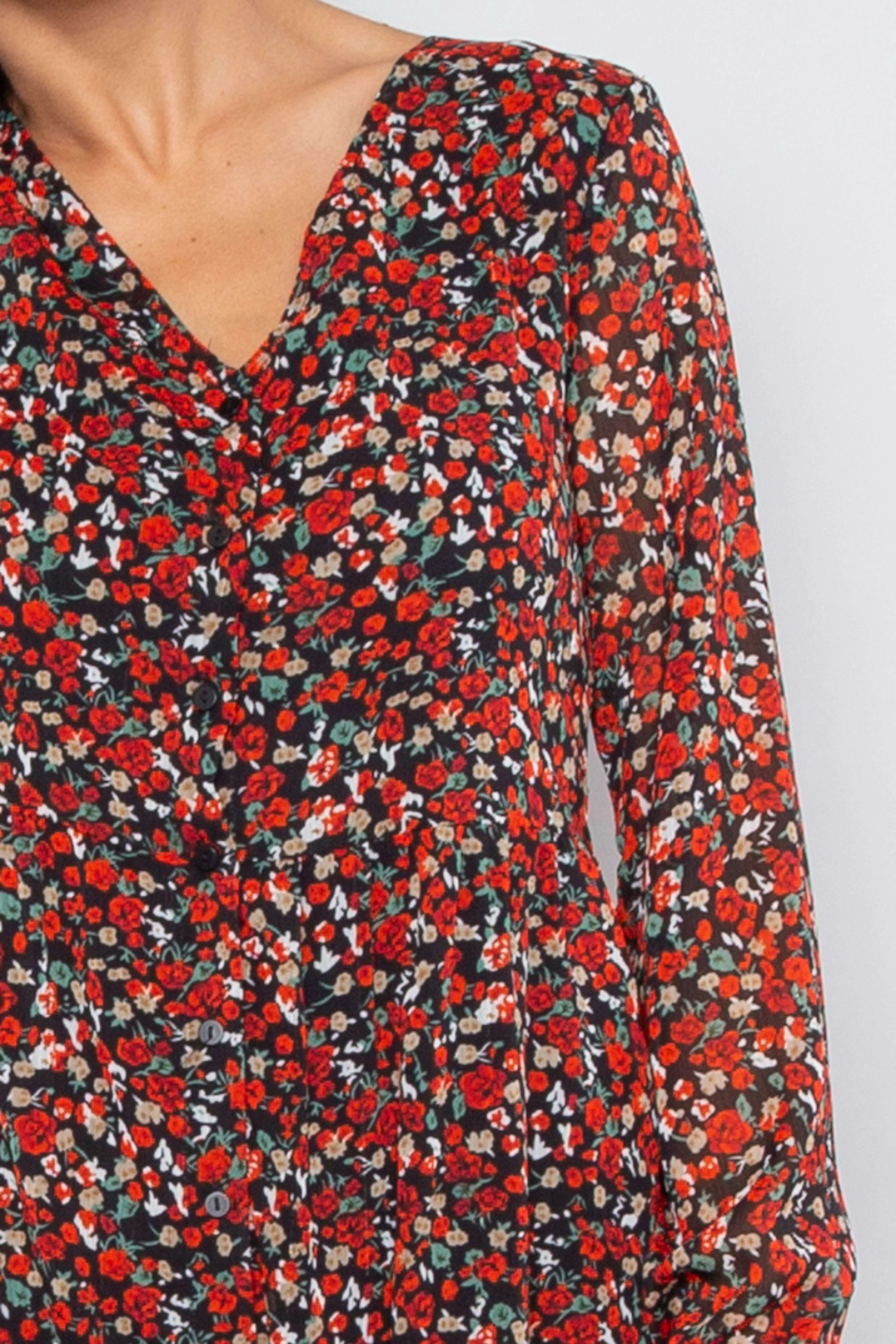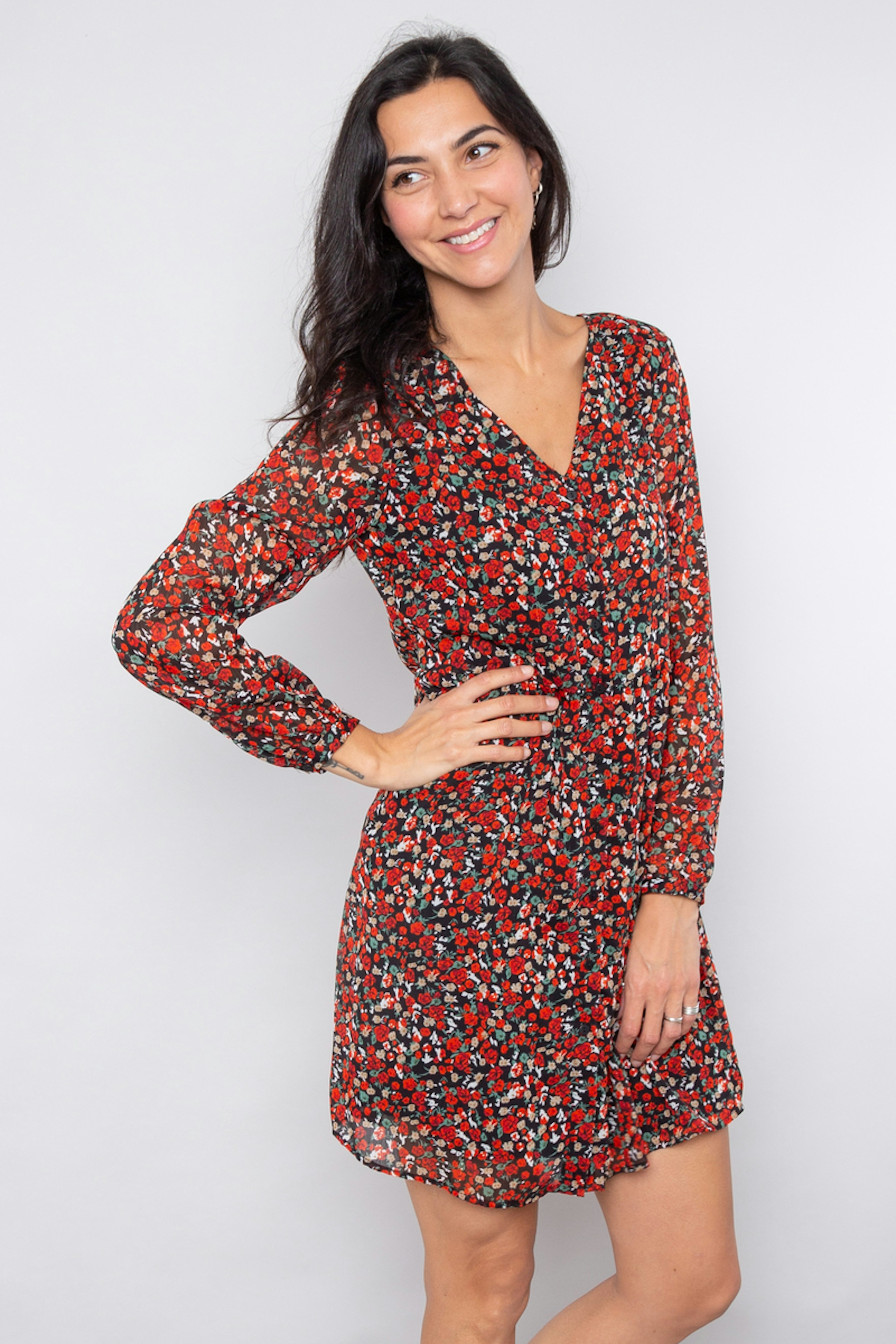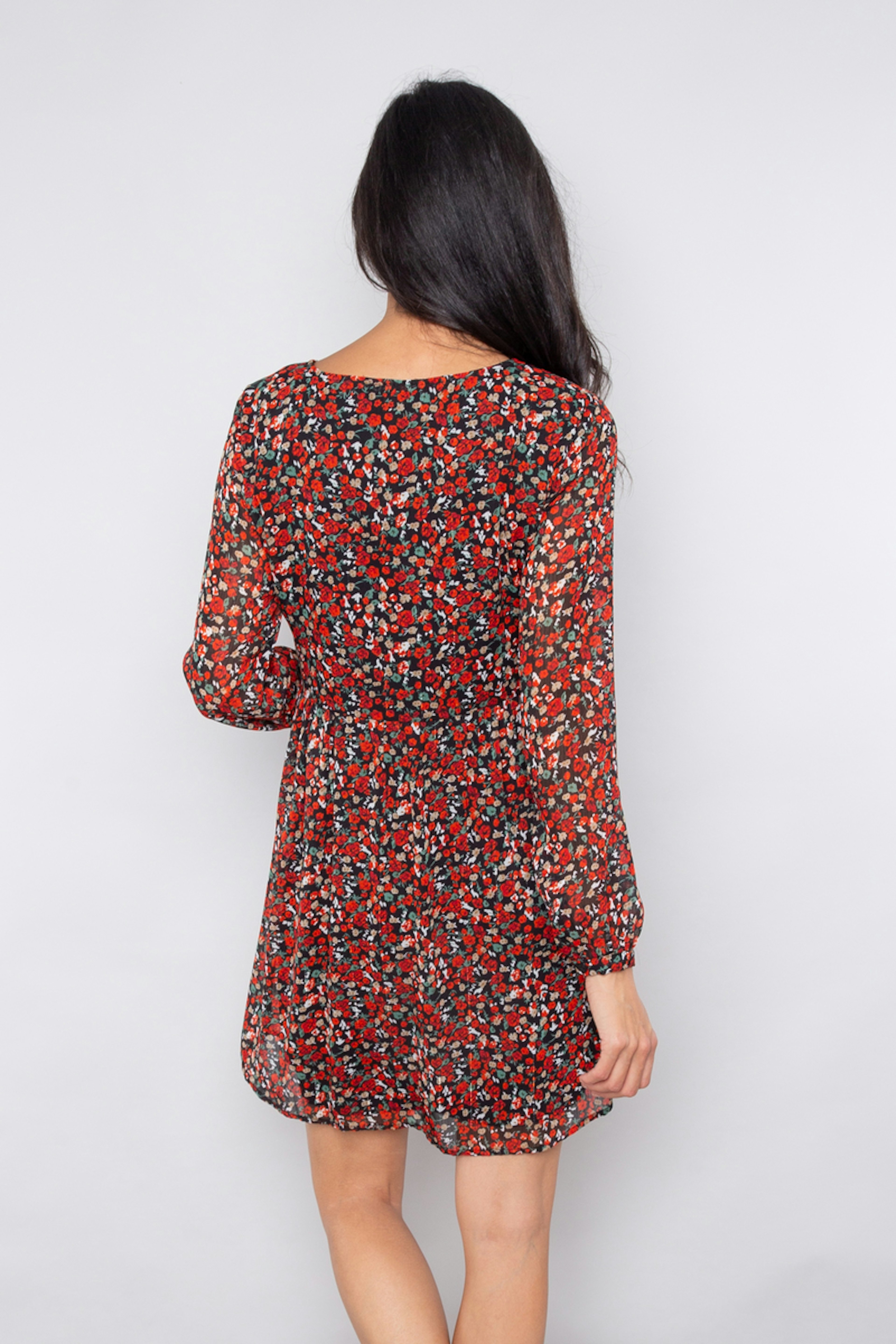 โ€ข Robe courte imprimรฉe โ€ข Col V โ€ข Manches longues transparentes โ€ข Taille cintrรฉe โ€ข Doublure