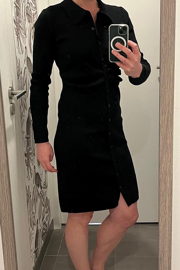 Associez cette robe noire avec des bottines en cuir et un foulard coloré pour dynamiser votre allure hivernale. • Robe droite • Manches longues • Fermeture boutonnée • Matière extensible • Col cheminée élégant