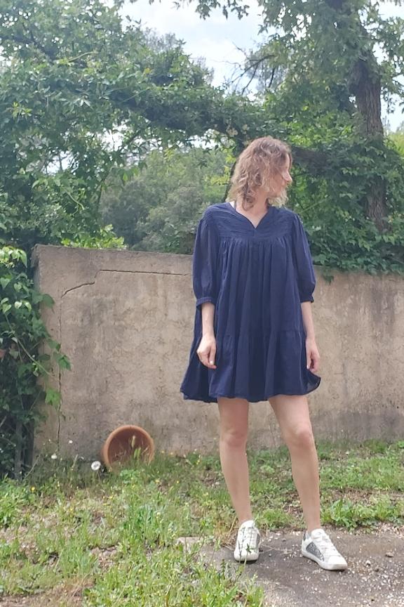 โข Robe Arielle en coton marine โข Coupe vaporeuse โข Manches courtes โข Dรฉcolletรฉ en V โข Fermeture ร boutons