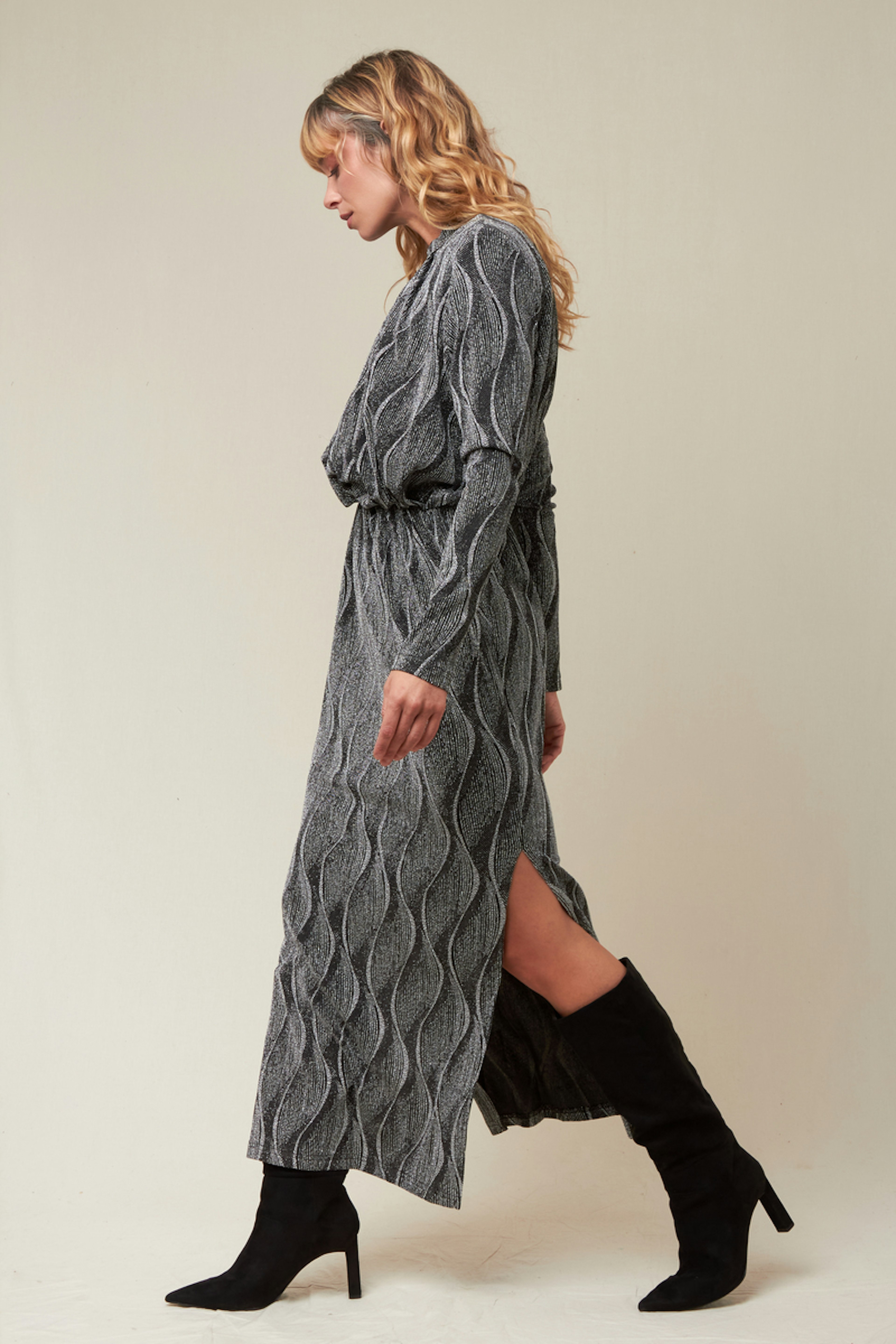 Optez pour des bottes hautes et un foulard en laine pour un look hivernal chic. • Robe longue • Manches longues • Coupe fluide • Imprimé moderne • Tissu scintillant