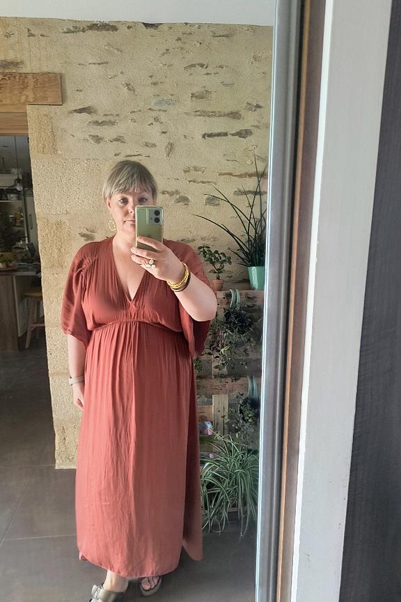 “Malheureusement le tissu ne met pas du tout en valeur les femmes qui ont des rondeurs (statique et collant). On voit tous les défauts. Cependant la couleur est très jolie.”