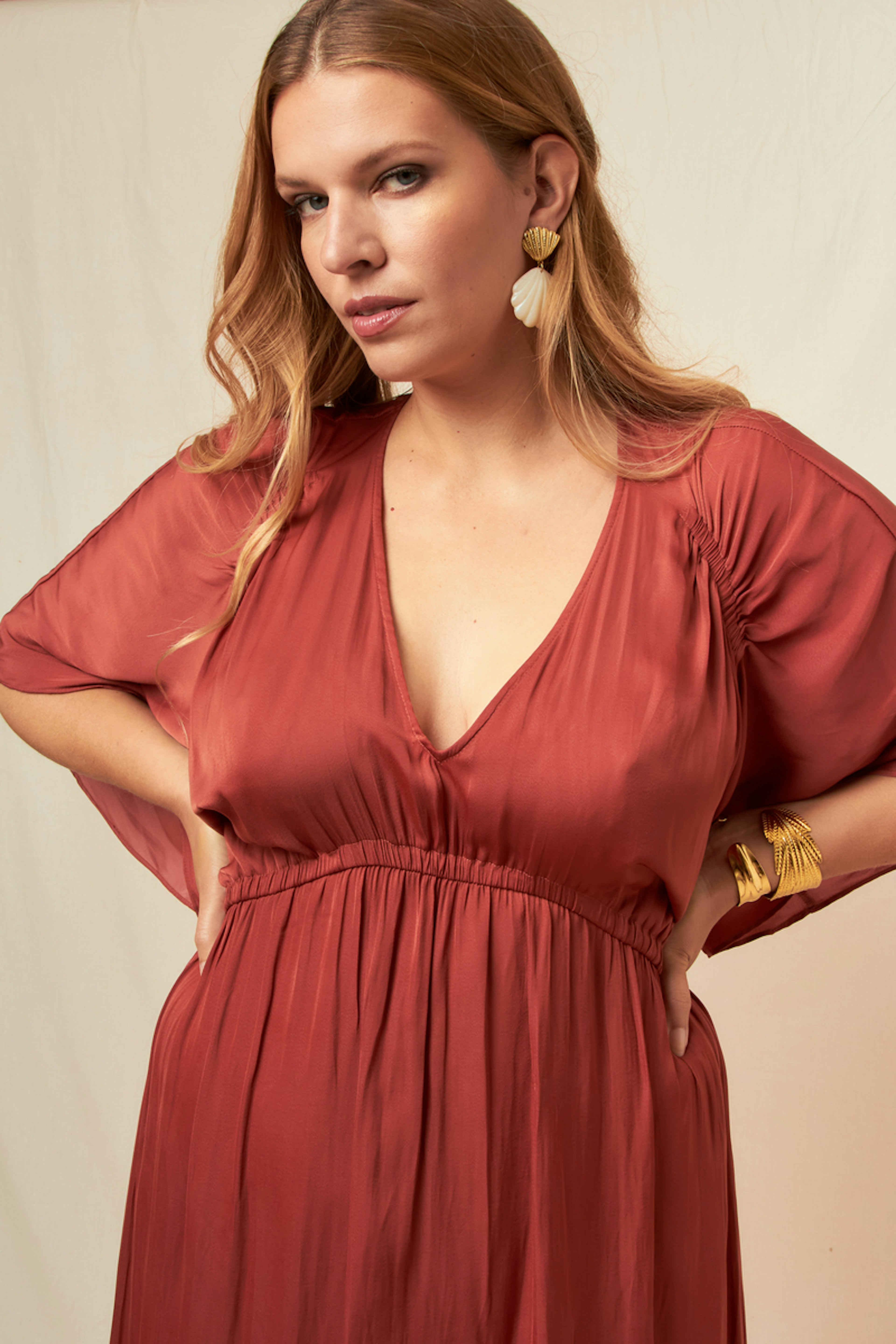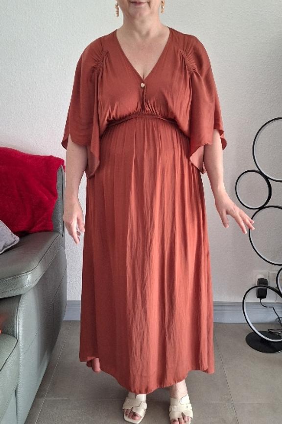 Ajoutez une touche bohème à votre look avec cette robe fluide. Associez-la à des sandales dorées et un chapeau de paille pour un style estival parfait. • Robe longue fluide • Manches courtes façon cape • Décolleté V profond • Taille élastiquée • Bas évasé