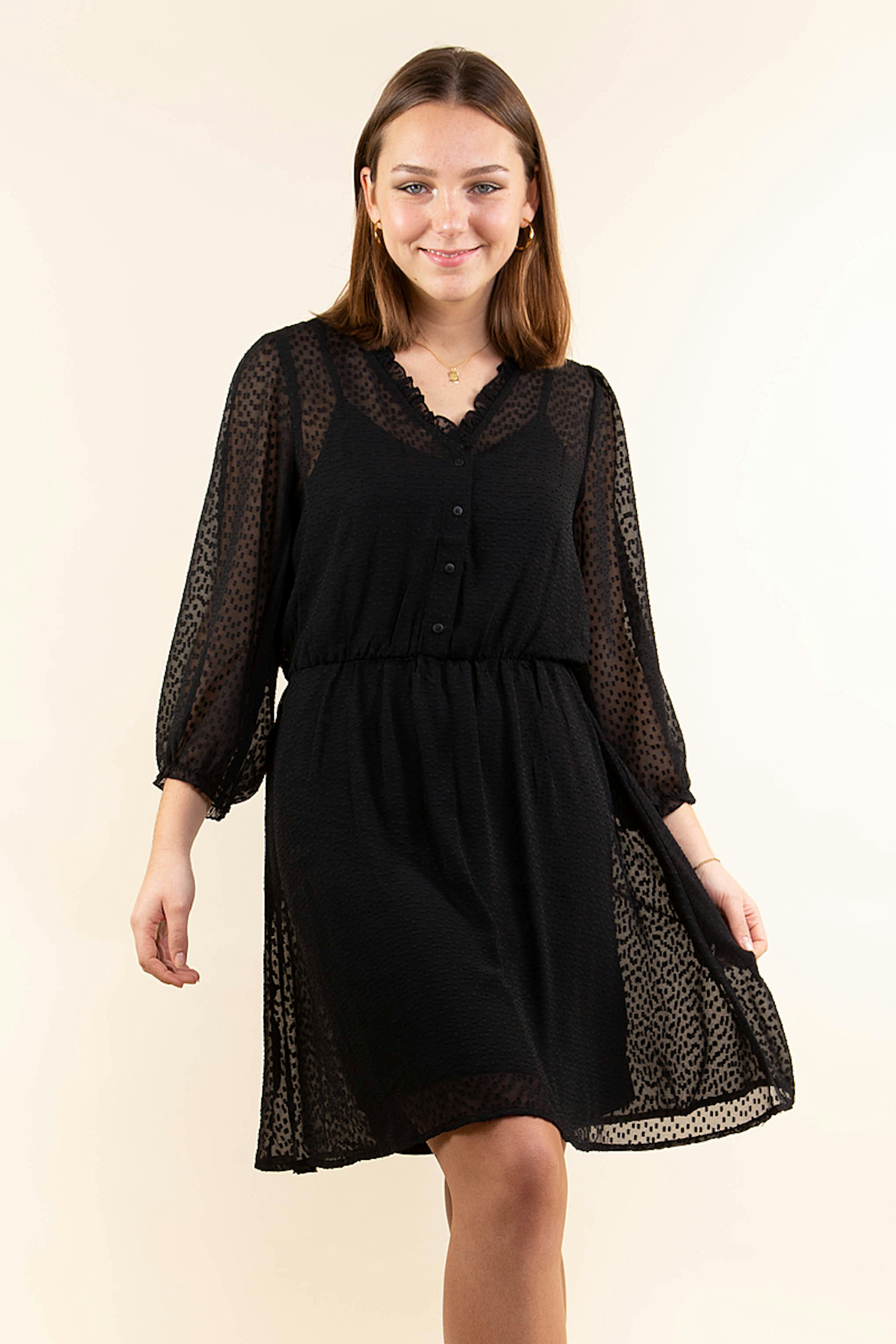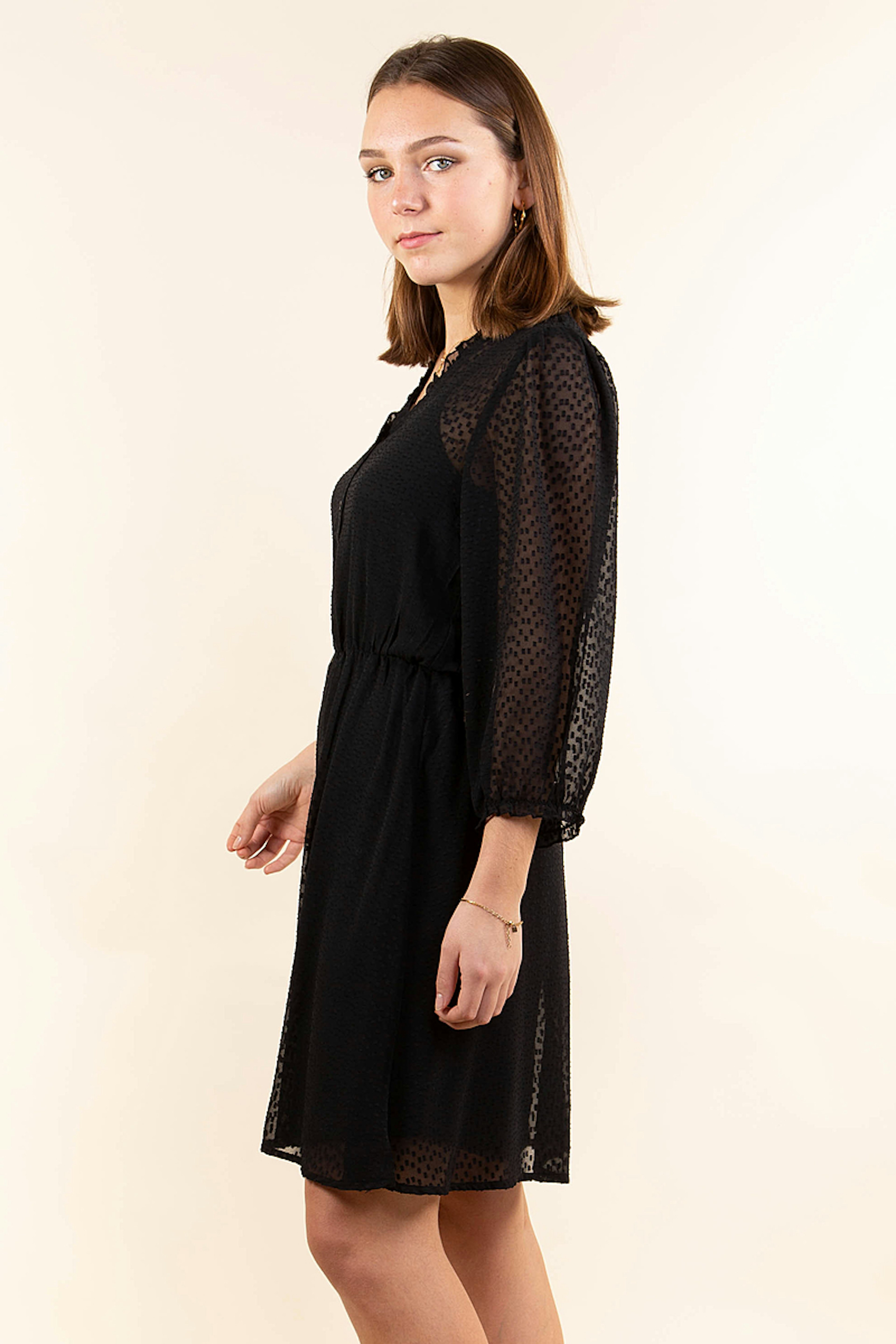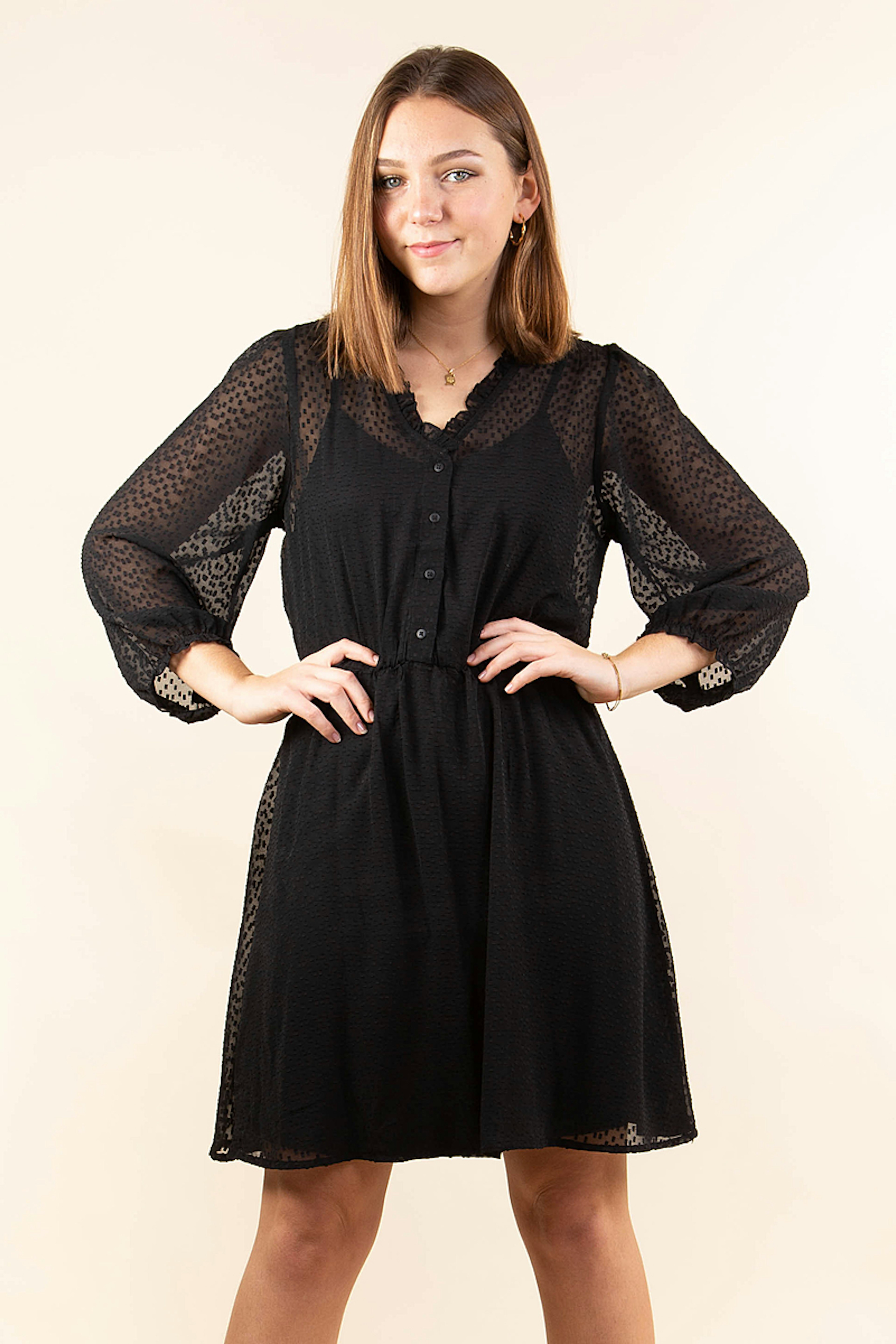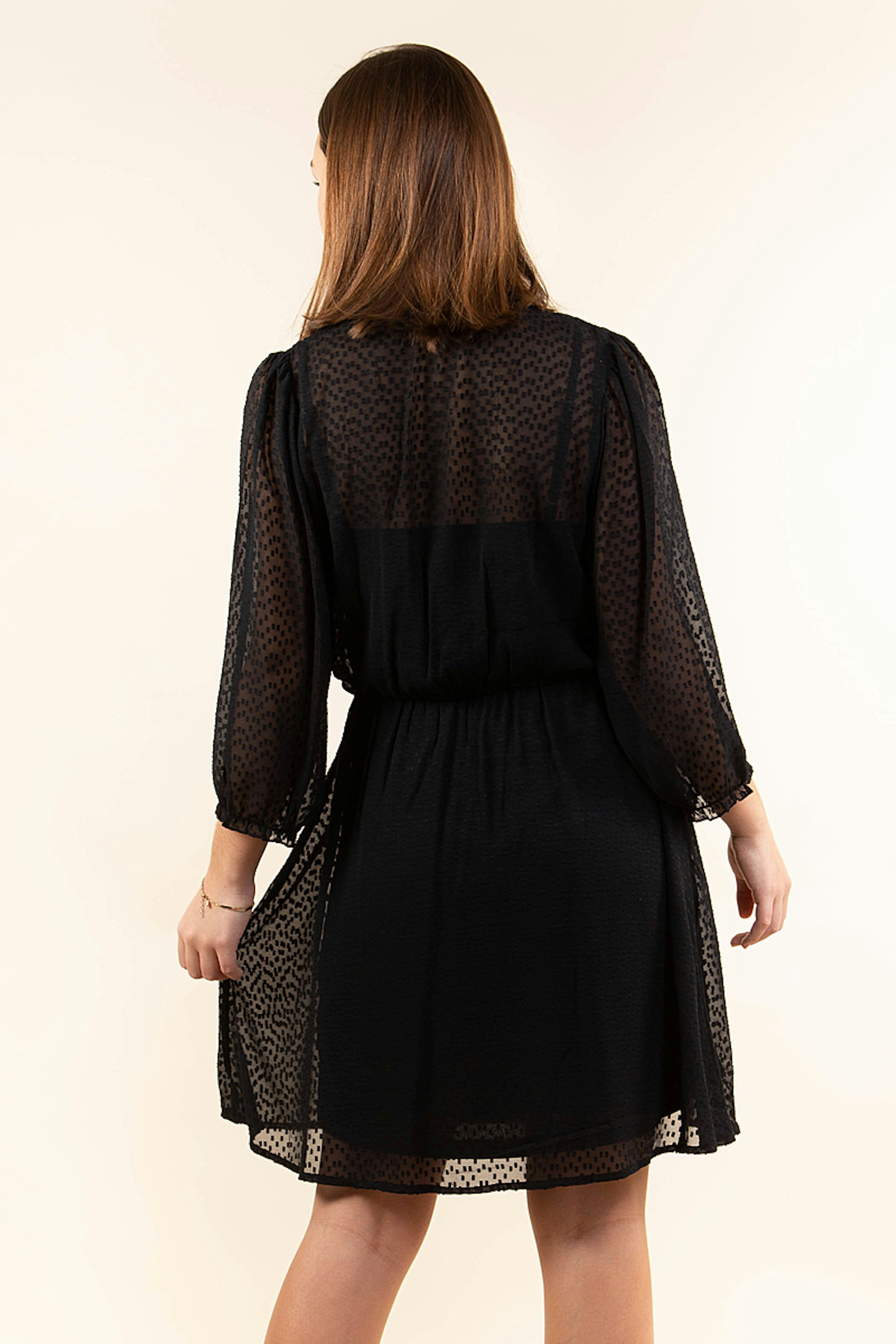 On aime la robe Ayella noire en dentelle qui est ultra chic. L'imprimรฉ plumetis sur les manches lui donne toute son originalitรฉ. Dรฉcalez-la avec une paire de Doc Martens pour plus de modernitรฉ. Ce modรจle dispose d'un fond de robe.