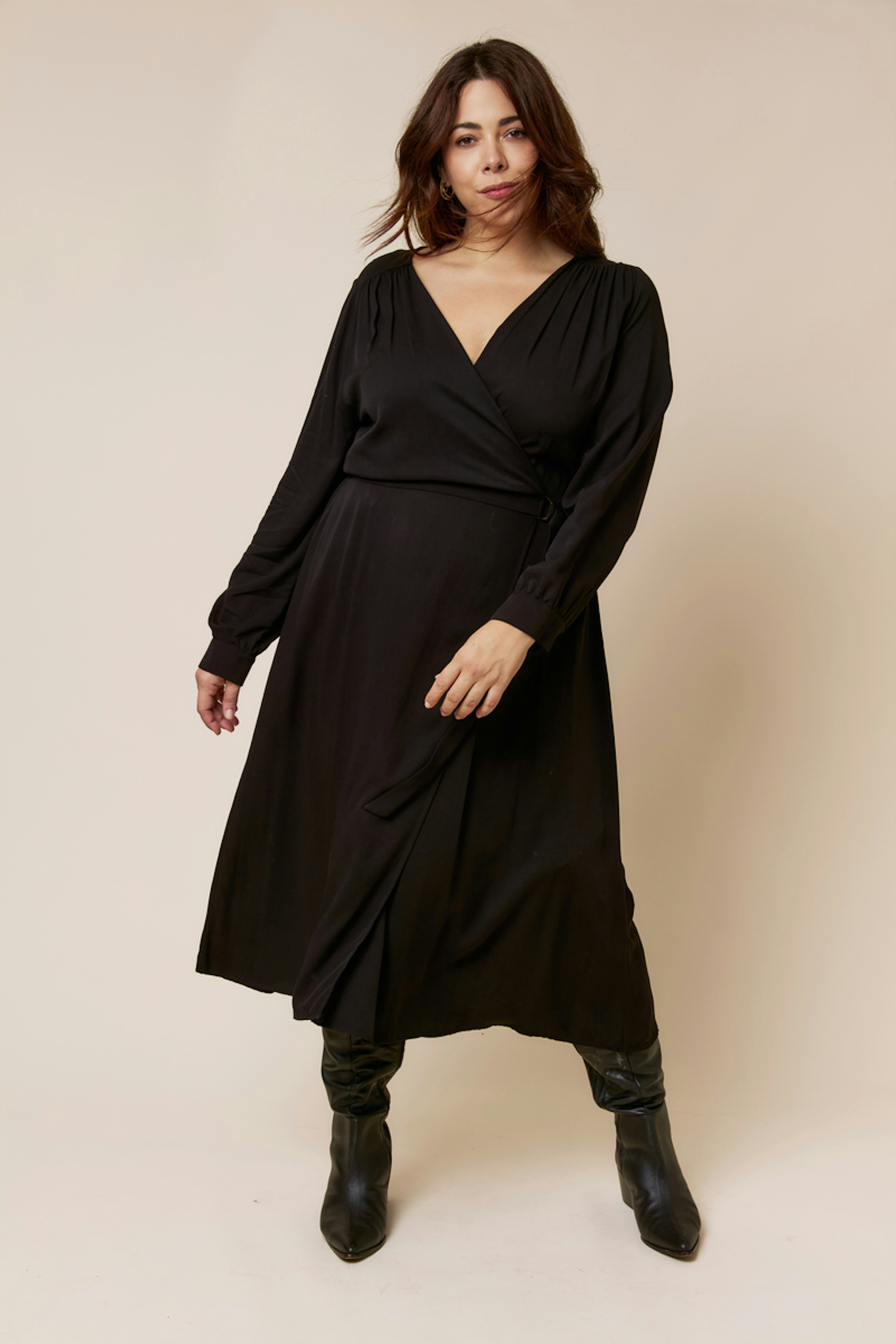 Cette robe portefeuille est idéale pour l'hiver. Associe-la à des bottes hautes et un manteau en laine pour un look chic et confortable. • Robe portefeuille • Décolleté en V flatteur • Manches longues élégantes • Ceinture à nouer • Style intemporel noir