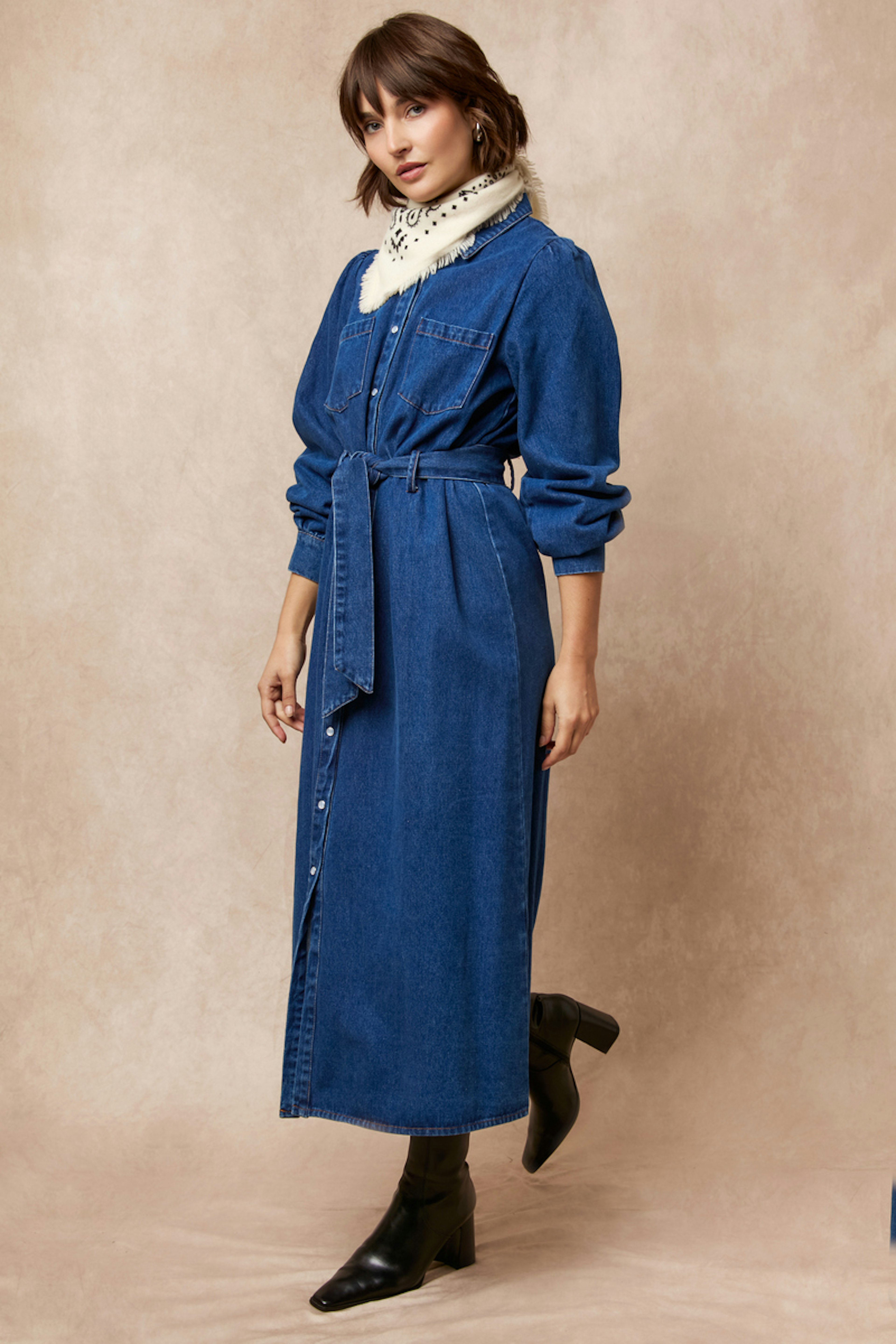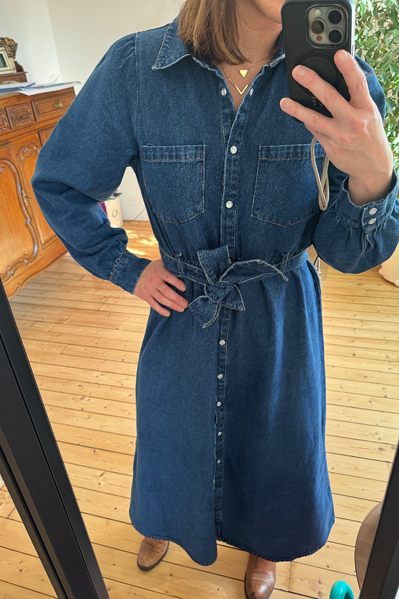Associez cette robe chemise en denim avec des bottes camel pour un look chaleureux cet hiver. • Robe chemise en coton • Manches longues • Boutons sur toute la longueur • Ceinture à la taille • Poches latérales