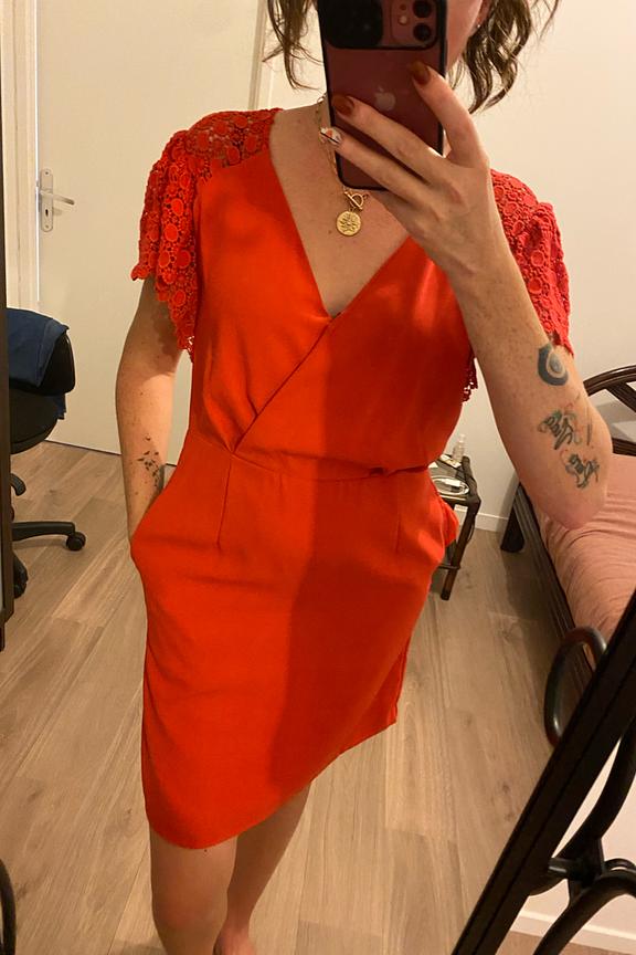 โข Robe courte โข Dรฉcolletรฉ V cache-cลur โข Dรฉtail de plis sur le haut de la piรจce โข Manches courtes en dentelle โข Poches dans coutures cรดtรฉs โข Incrustation dentelle dans le dos โข Fermeture 4 petits boutons et ganses โข Zip invisible milieu dos sur la partie โข Doublure 100% viscose