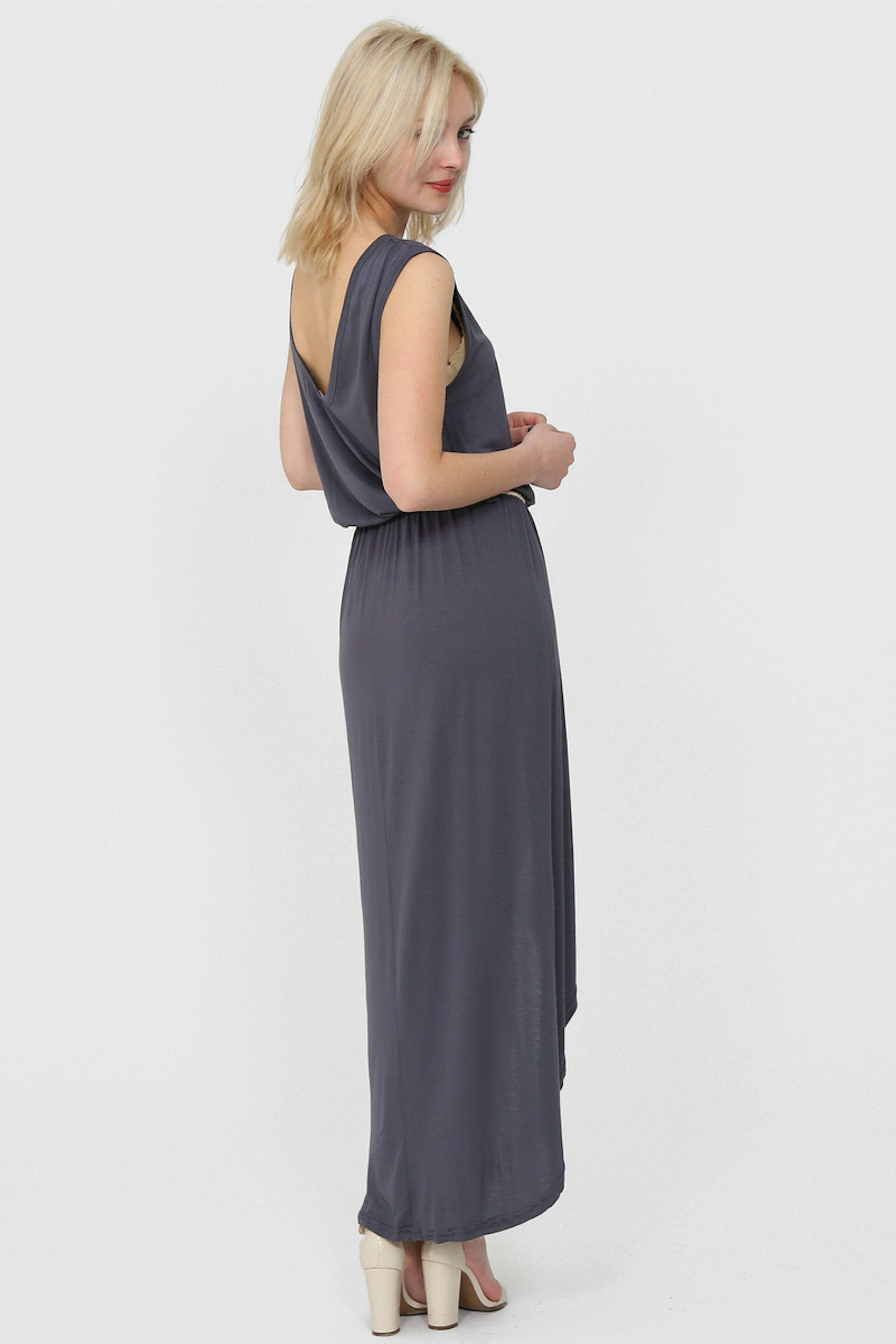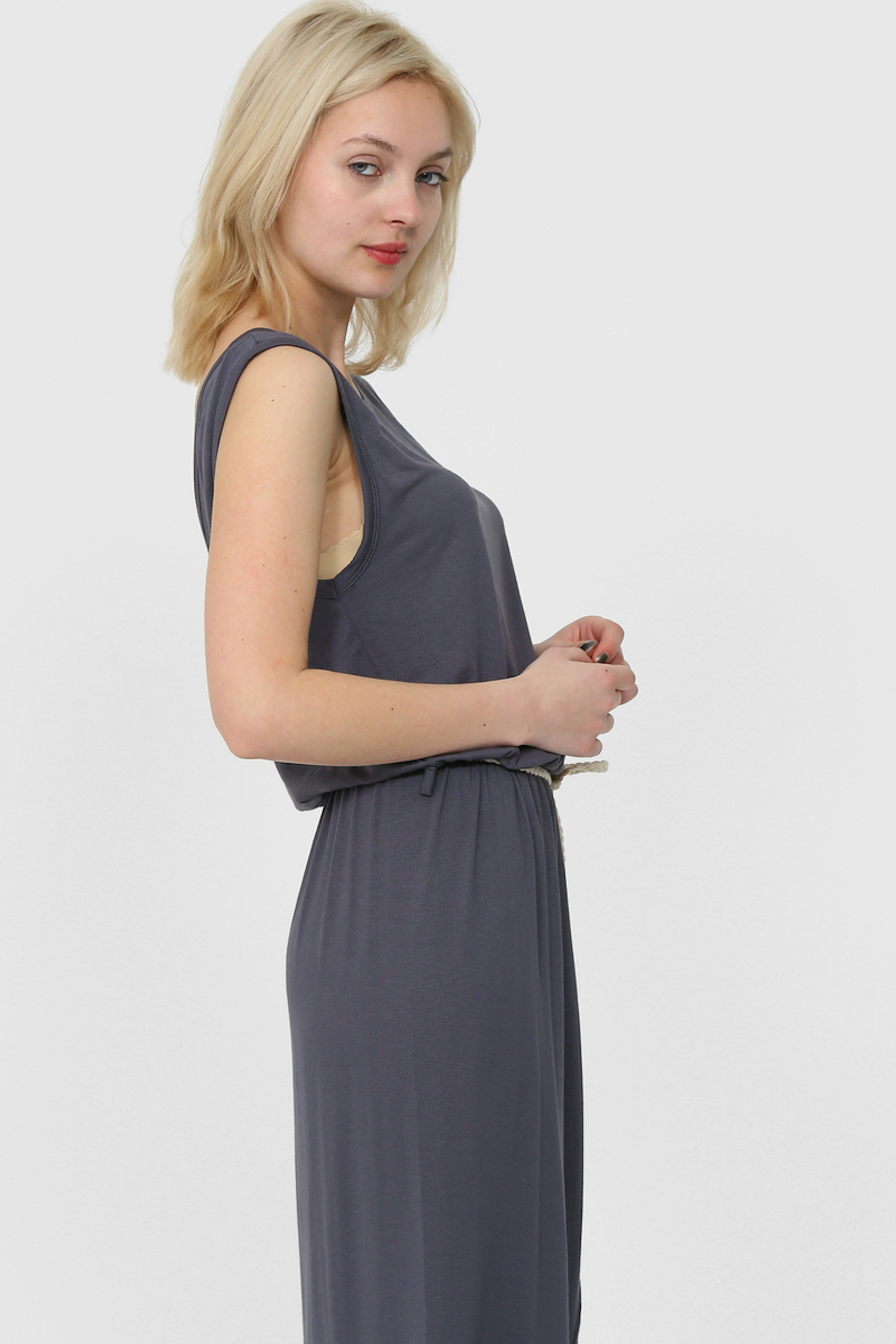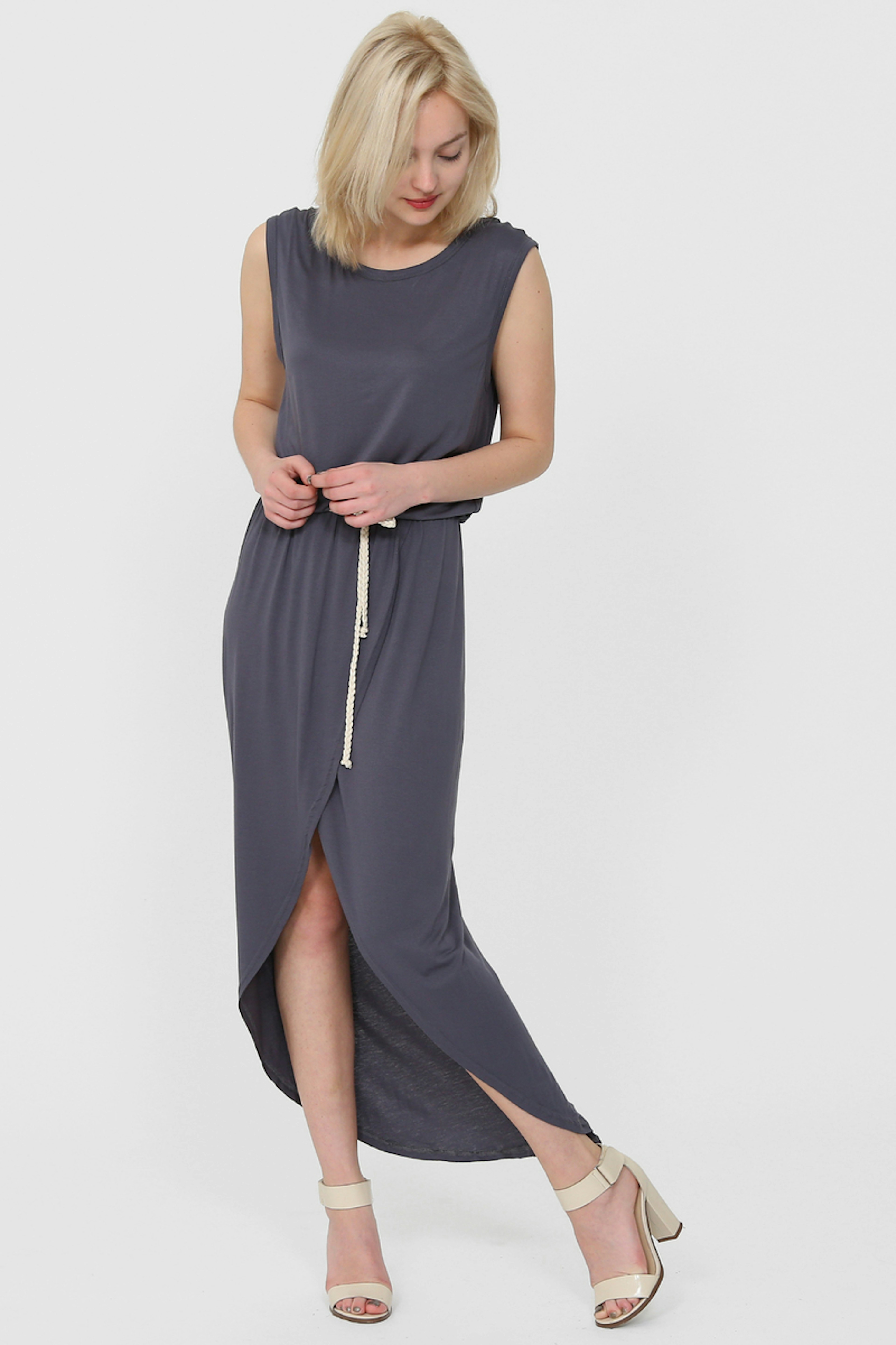 Robe grise en jersey avec un effet plus court sur le devant et encolure ronde. Cintrรฉe ร la taille grรขce ร une ceinture blanche.