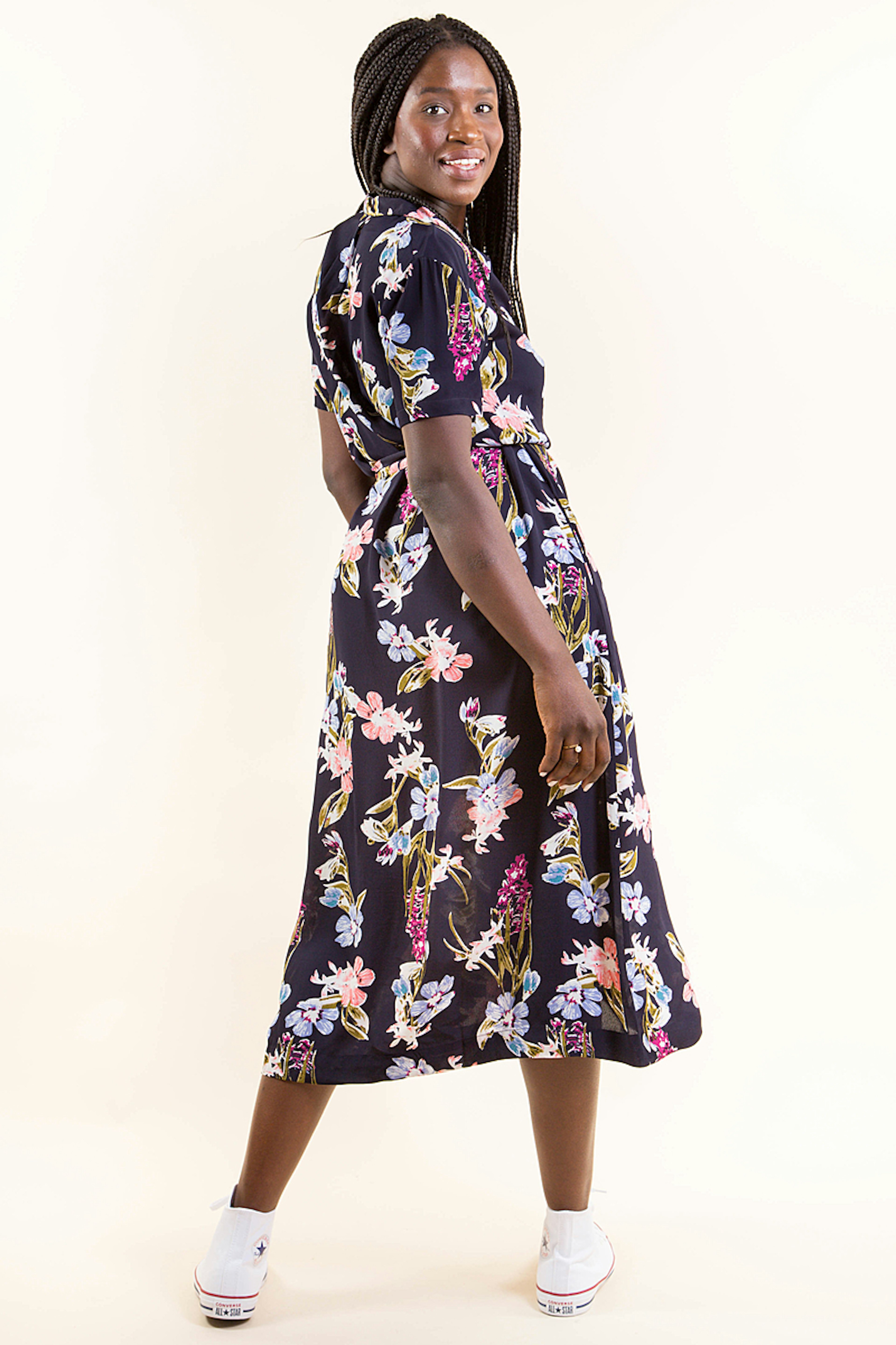 Laissez entrevoir votre jambe en optant pour cette somptueuse robe ร fleurs Bizance ร boutons.