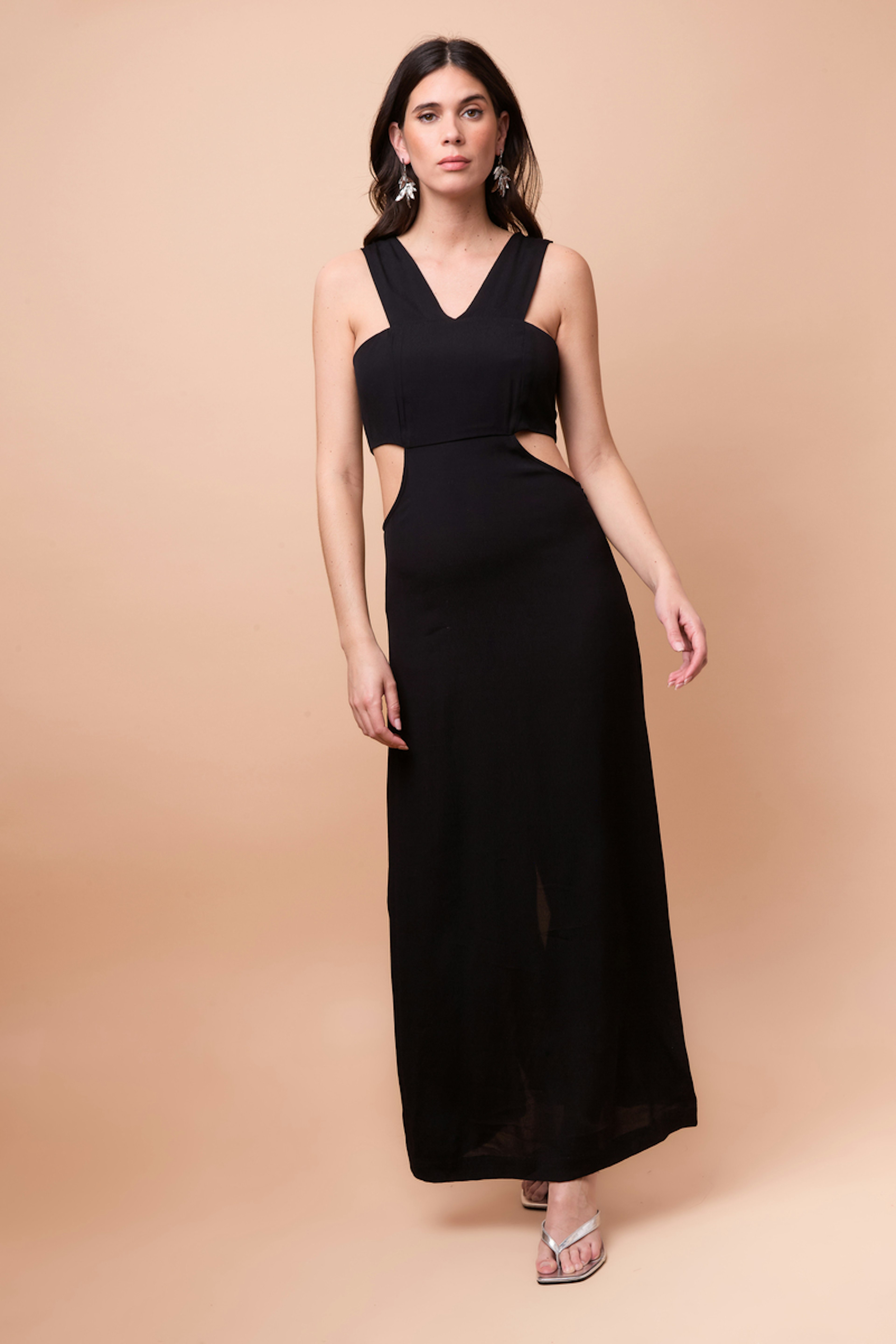 Pour un look chic et intemporel, associez cette robe noire à des sandales argentées et des bijoux scintillants. Idéale pour les soirées d'été. • Robe longue • Dos nu • Coupe ajustée • Fente à l'arrière • Coloris uni noir