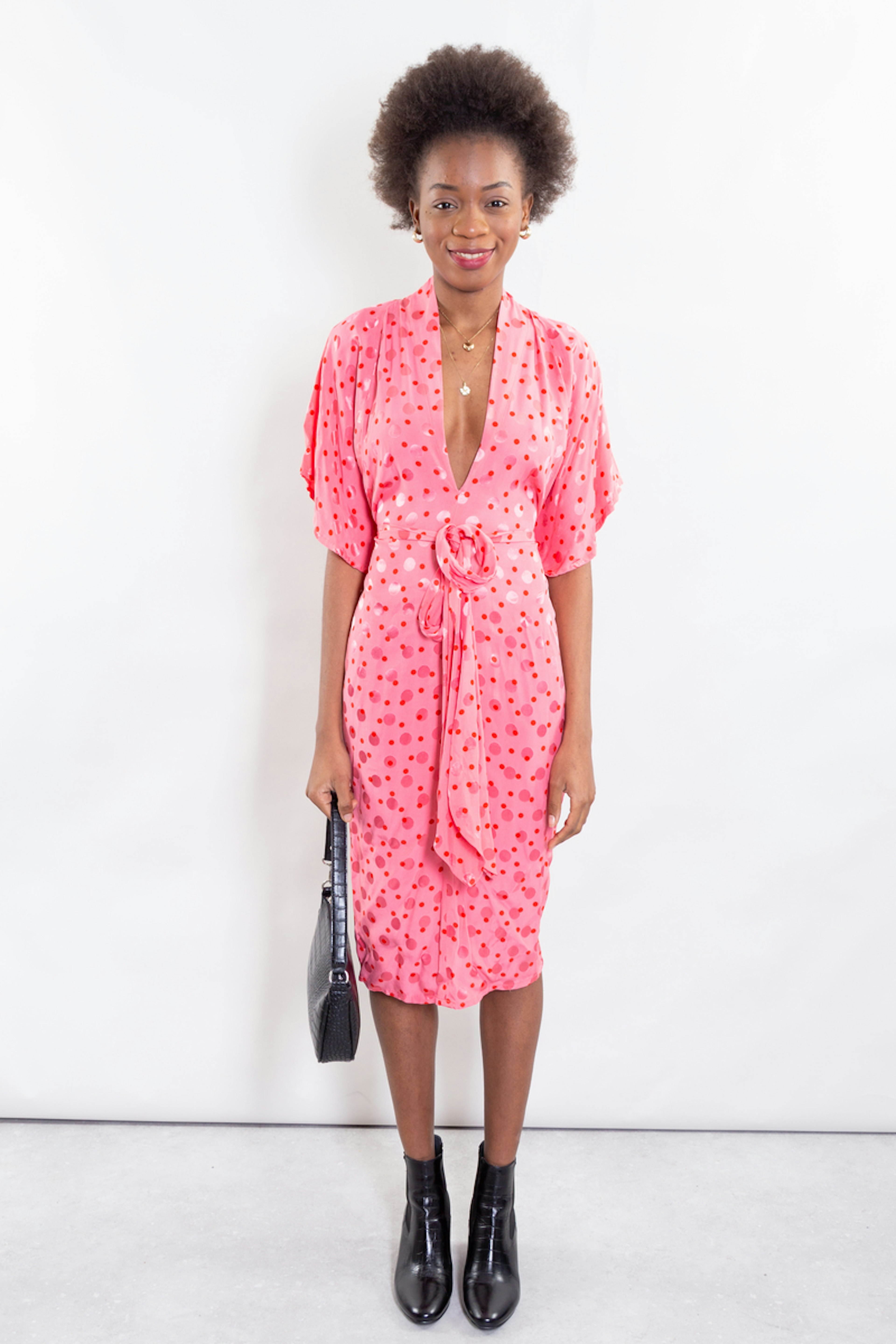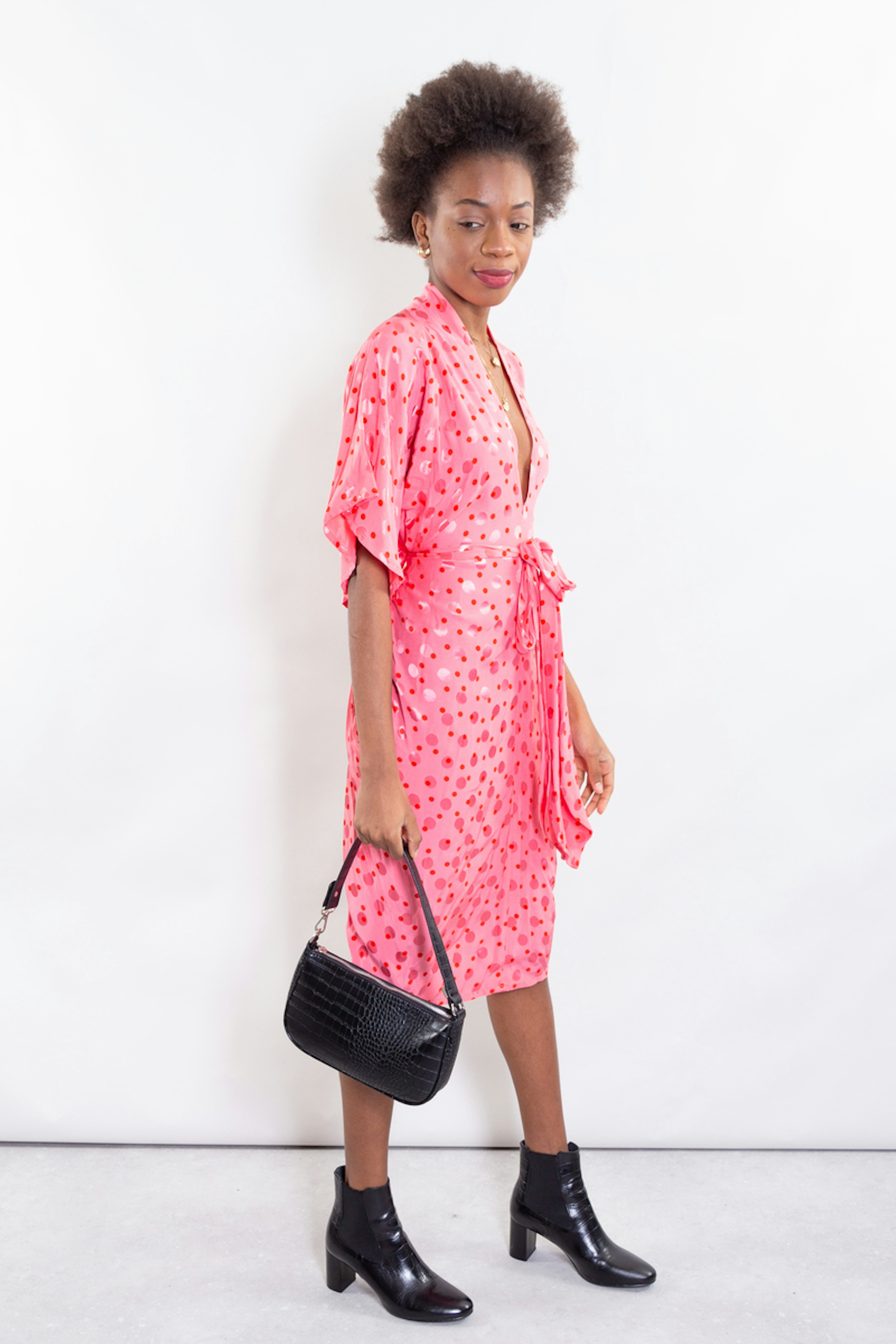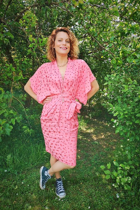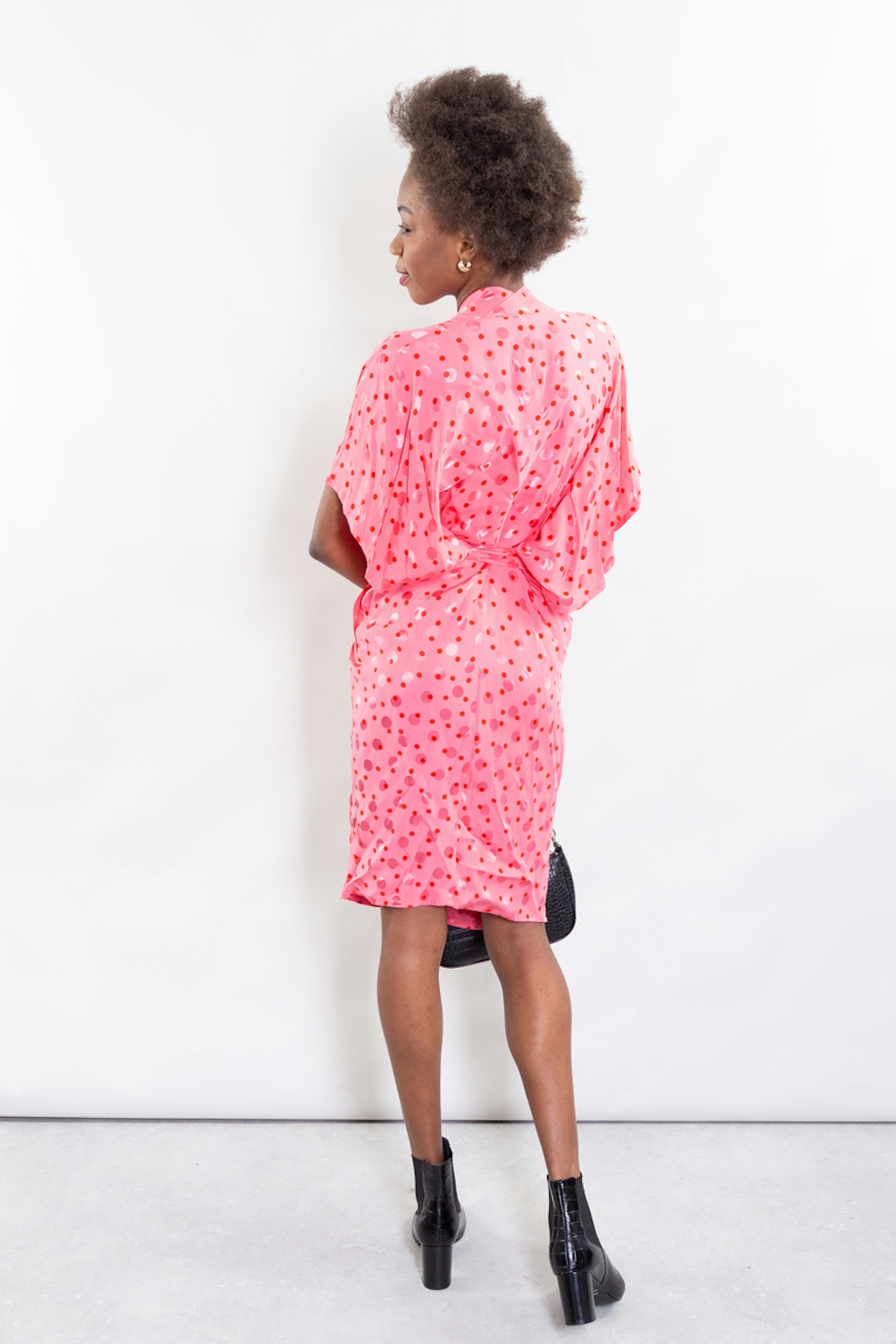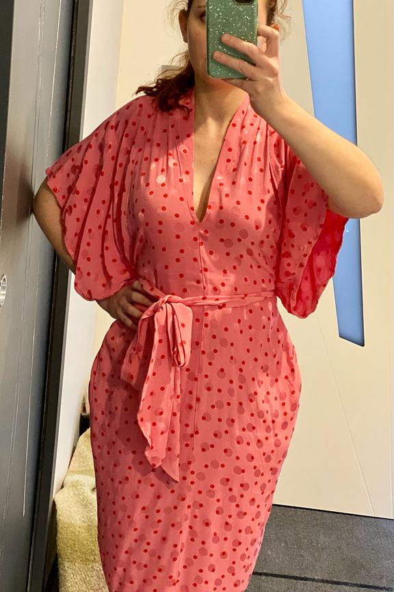 Robe forme "kimono" dans un pois revisitรฉ. Baby bump compatible ! โข Robe forme "Kimono", manches larges longueur au coude โข Deux longs liens ร nouer ร la taille โข Partie jupe droite, longueur sous le genou โข Poches ร passepoils sur les cรดtรฉs devant