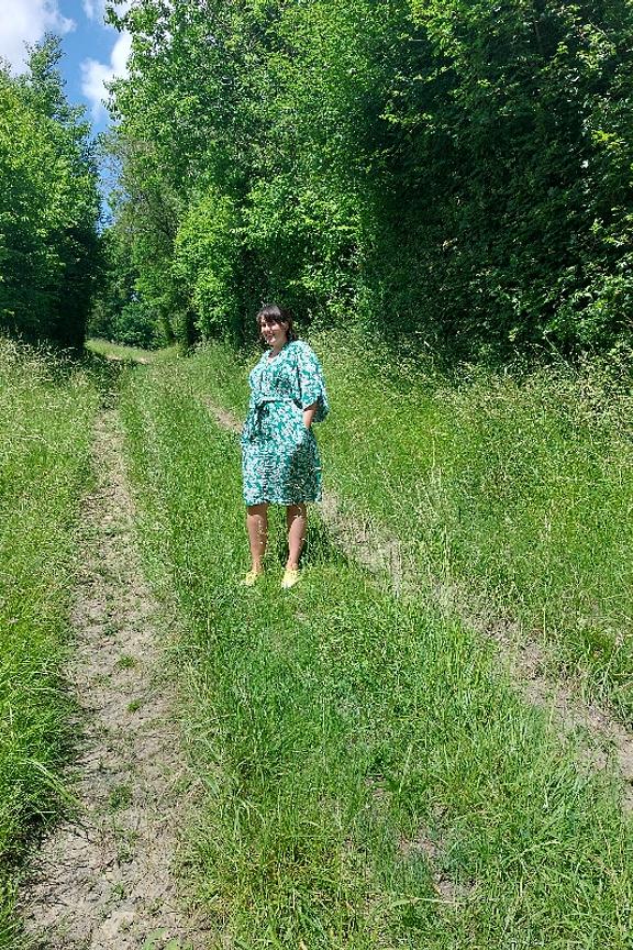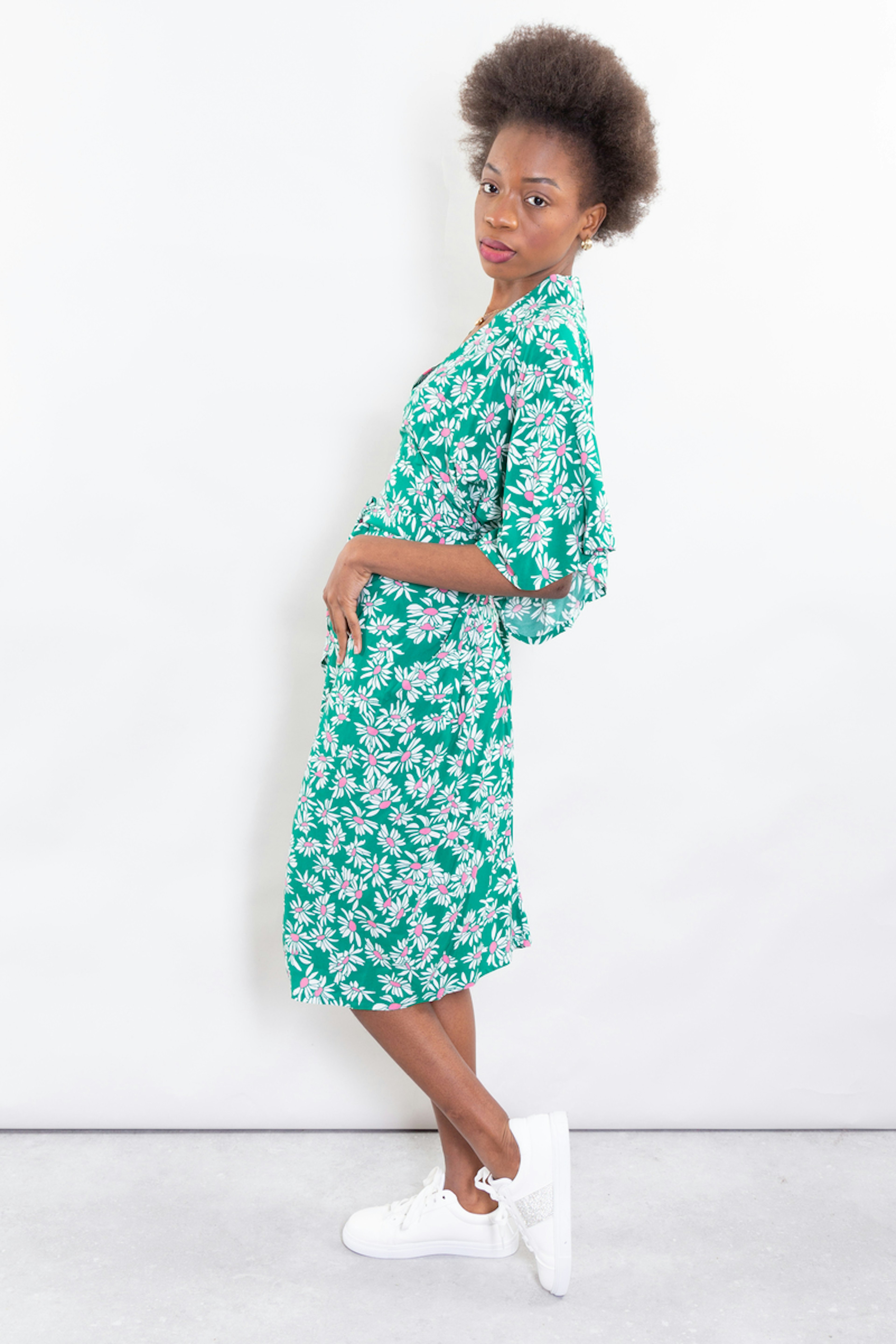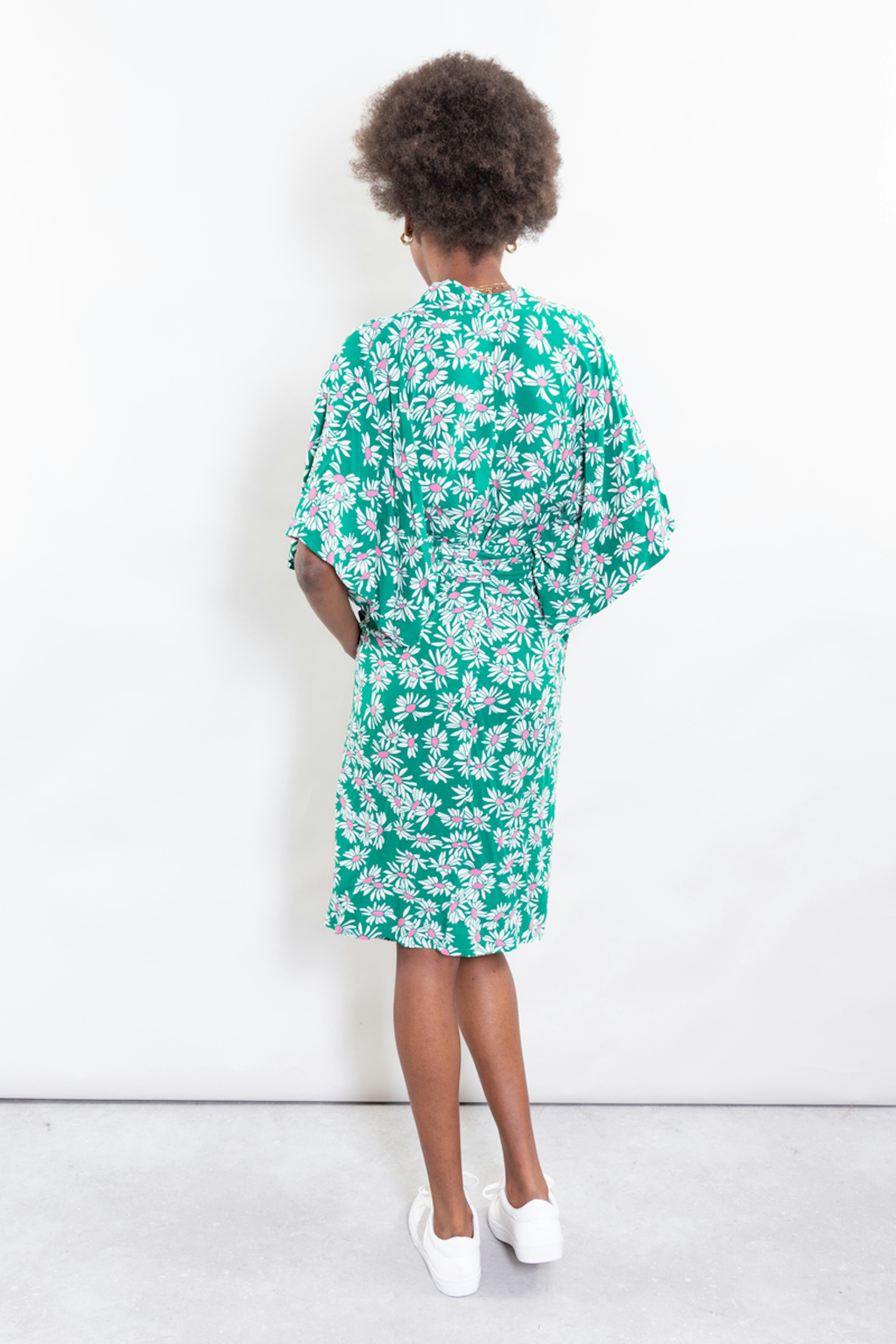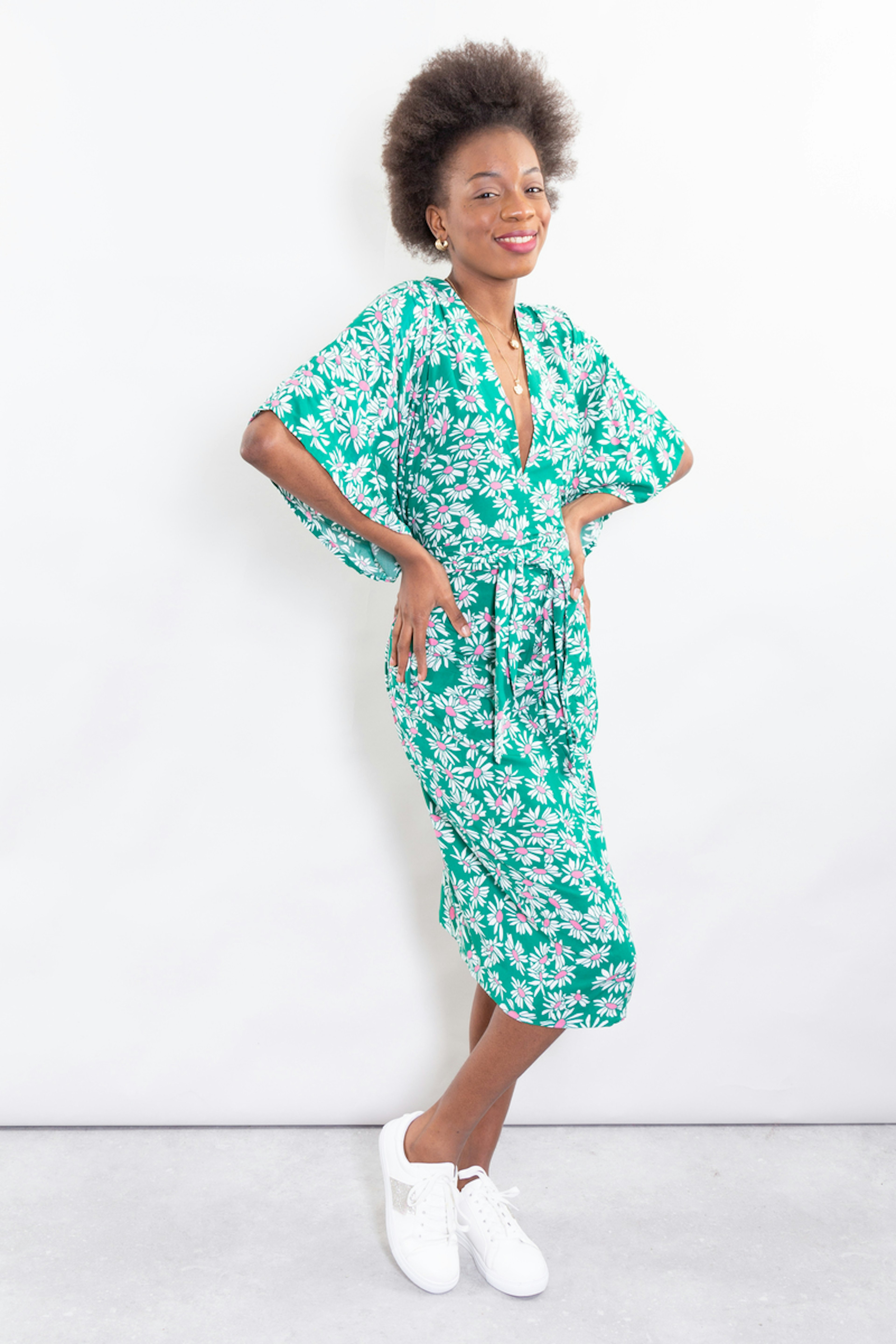 Robe forme kimono dans un imprimรฉ exclusif ! Baby bump compatible ! โข Robe forme "Kimono", manches larges longueur au coude โข Deux longs liens ร nouer ร la taille โข Partie jupe droite, longueur sous le genou โข Poches ร passepoils sur les cรดtรฉs devant