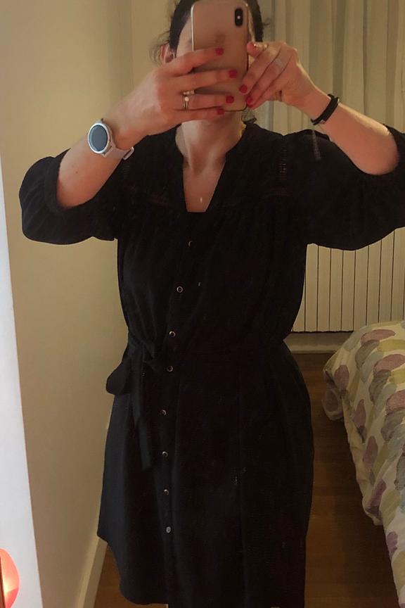 โข Robe noire longueur au dessus du genou โข Tissu faux uni texturรฉ โข Ceinture amovible โข Dรฉtail inserts tissu ajourรฉ โข Col V โข Manches 3/4 โข Boutonnage sur le devant avec boutons รฉmaillรฉs