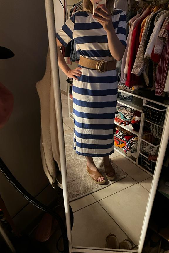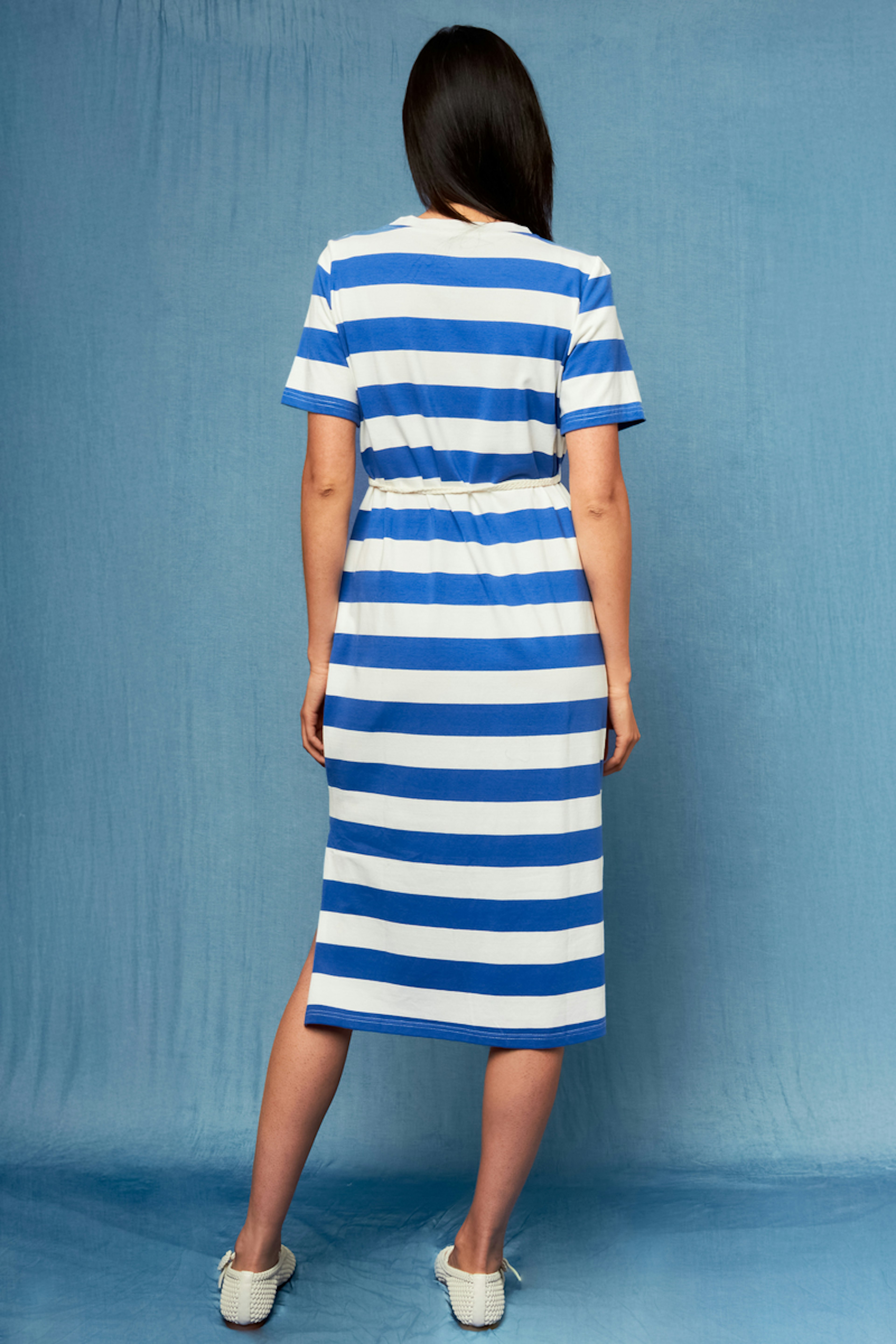 Portez-la avec des espadrilles pour un look estival frais. • Robe en coton • Coupe droite, confortable • Manches courtes • Col rond • Rayures élégantes