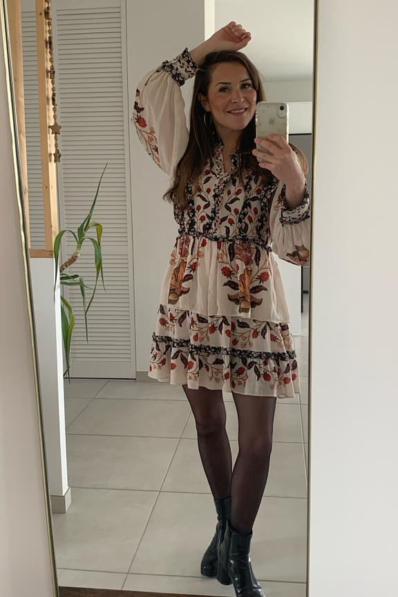 Ajoutez une touche de fantaisie avec cette robe imprimée. Associez-la à des bottines noires et un chapeau feutre pour un look hivernal chic. • Robe courte • Taille empire flatteuse • Manches longues bouffantes • Volants délicats • Motif floral éclatant