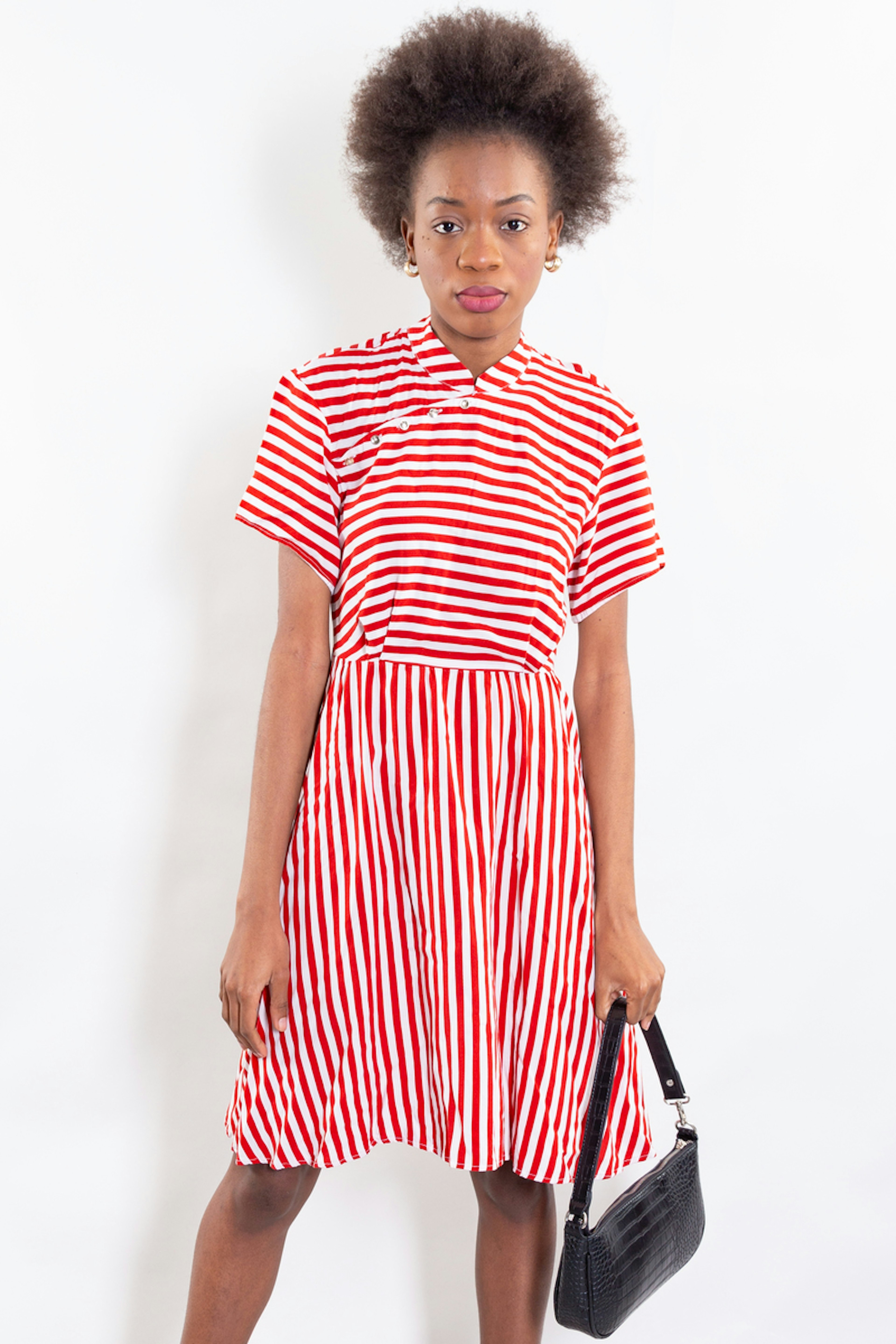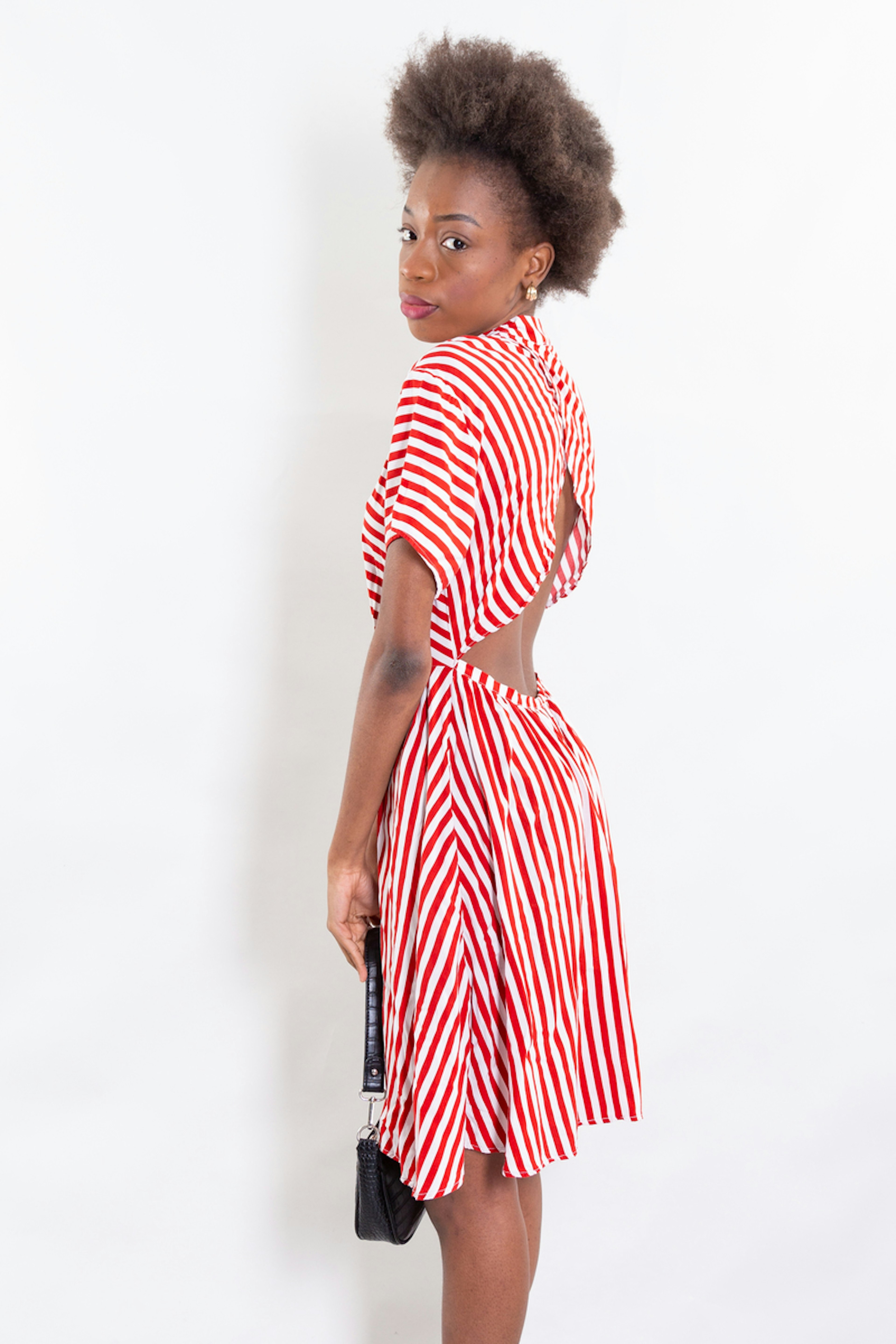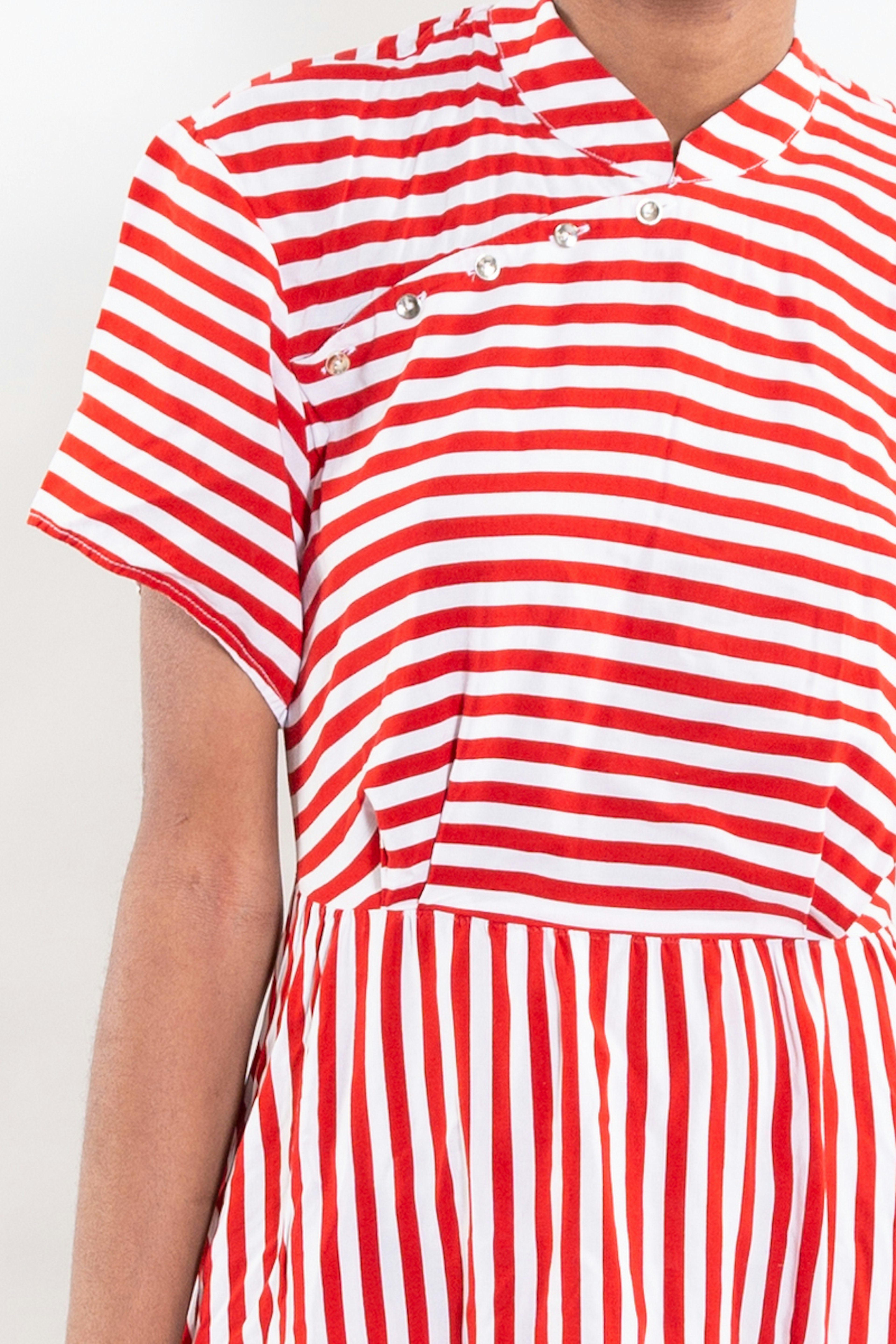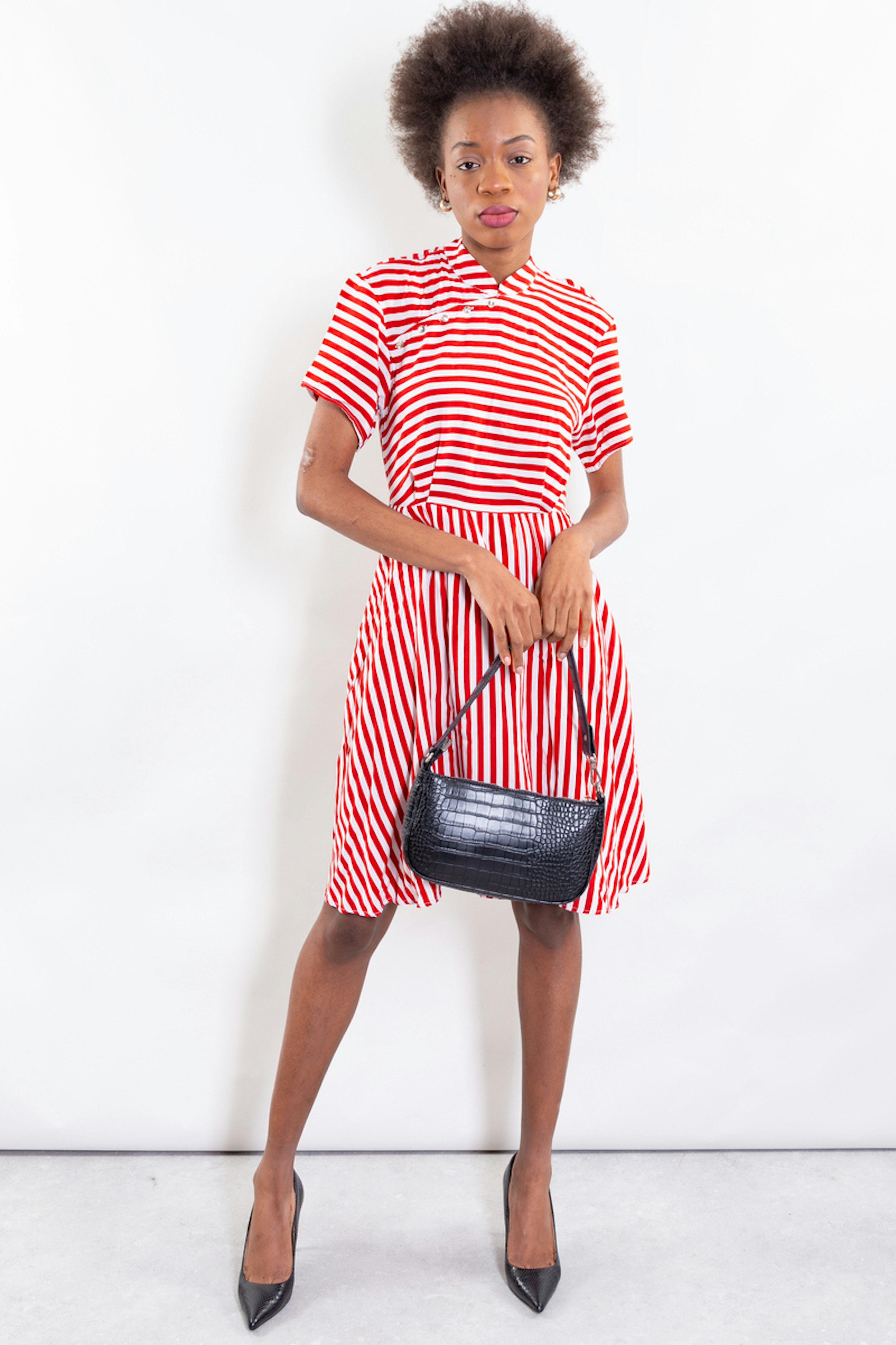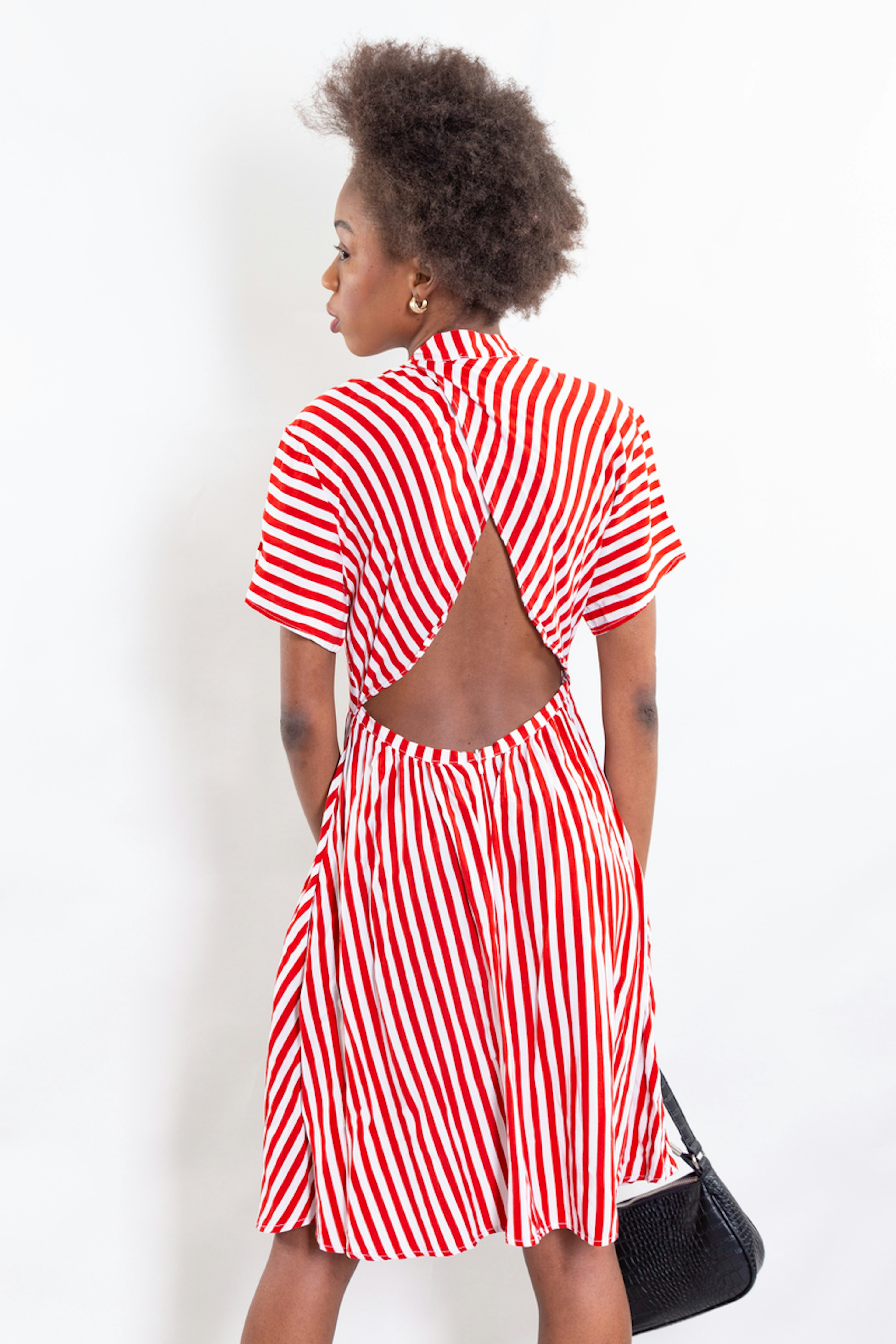 Son dos papillon et son col mao font de Betsy LA robe ร lโรฉlรฉgance rรฉtro. โข Robe ร manches courtes rayรฉe rouge et blanche โข Col mao boutonnรฉ โข Dos ouvert โข Longueur genou
