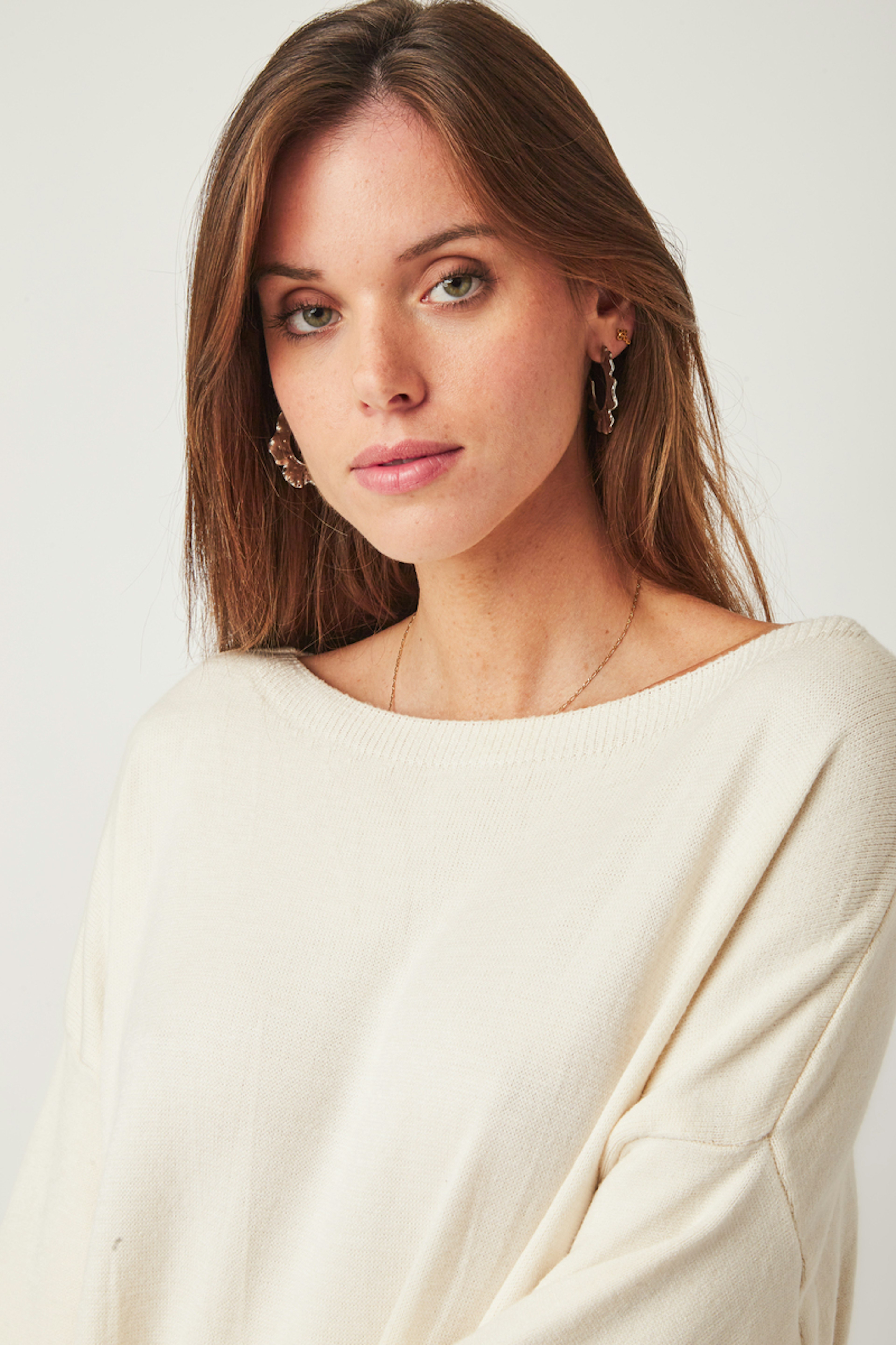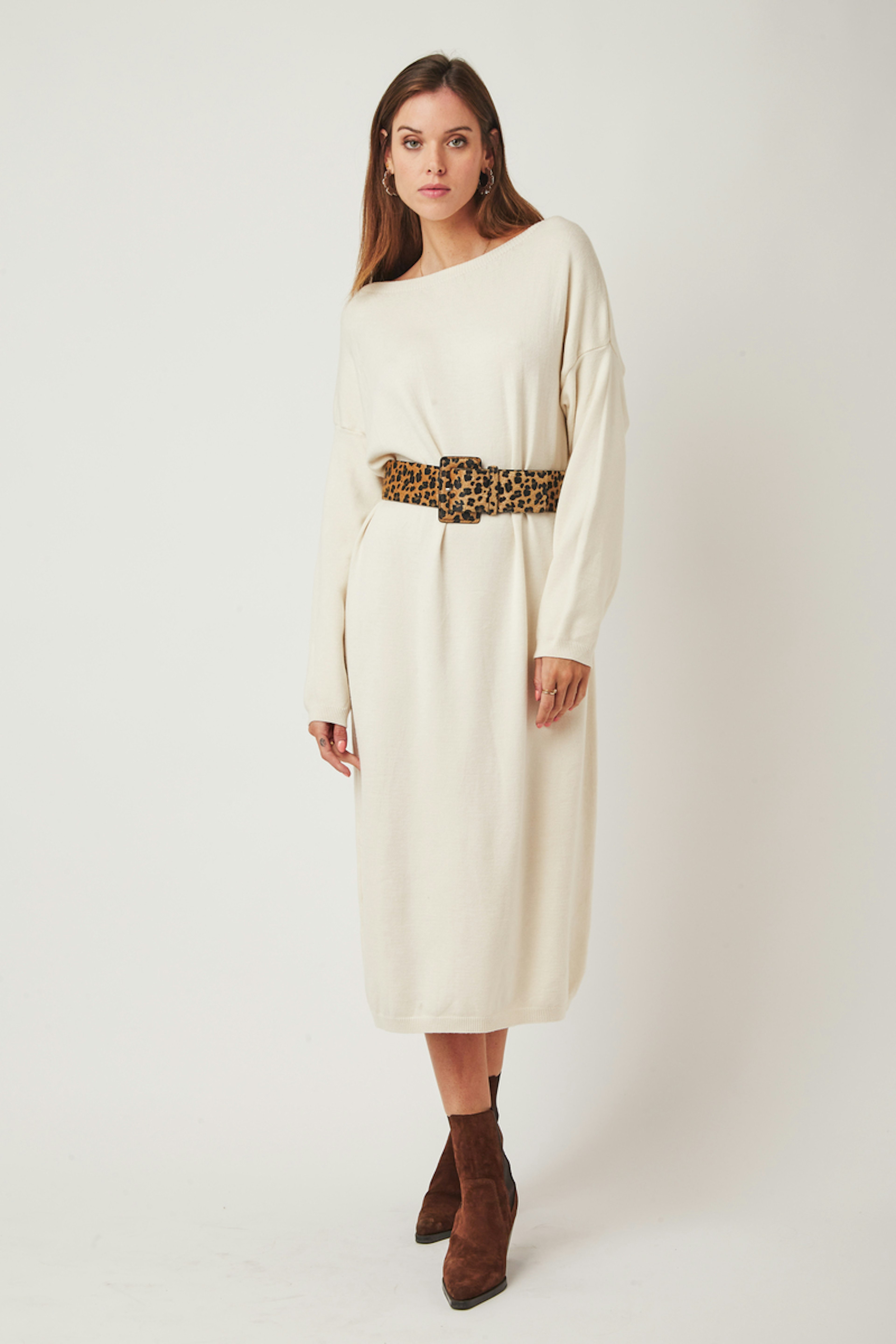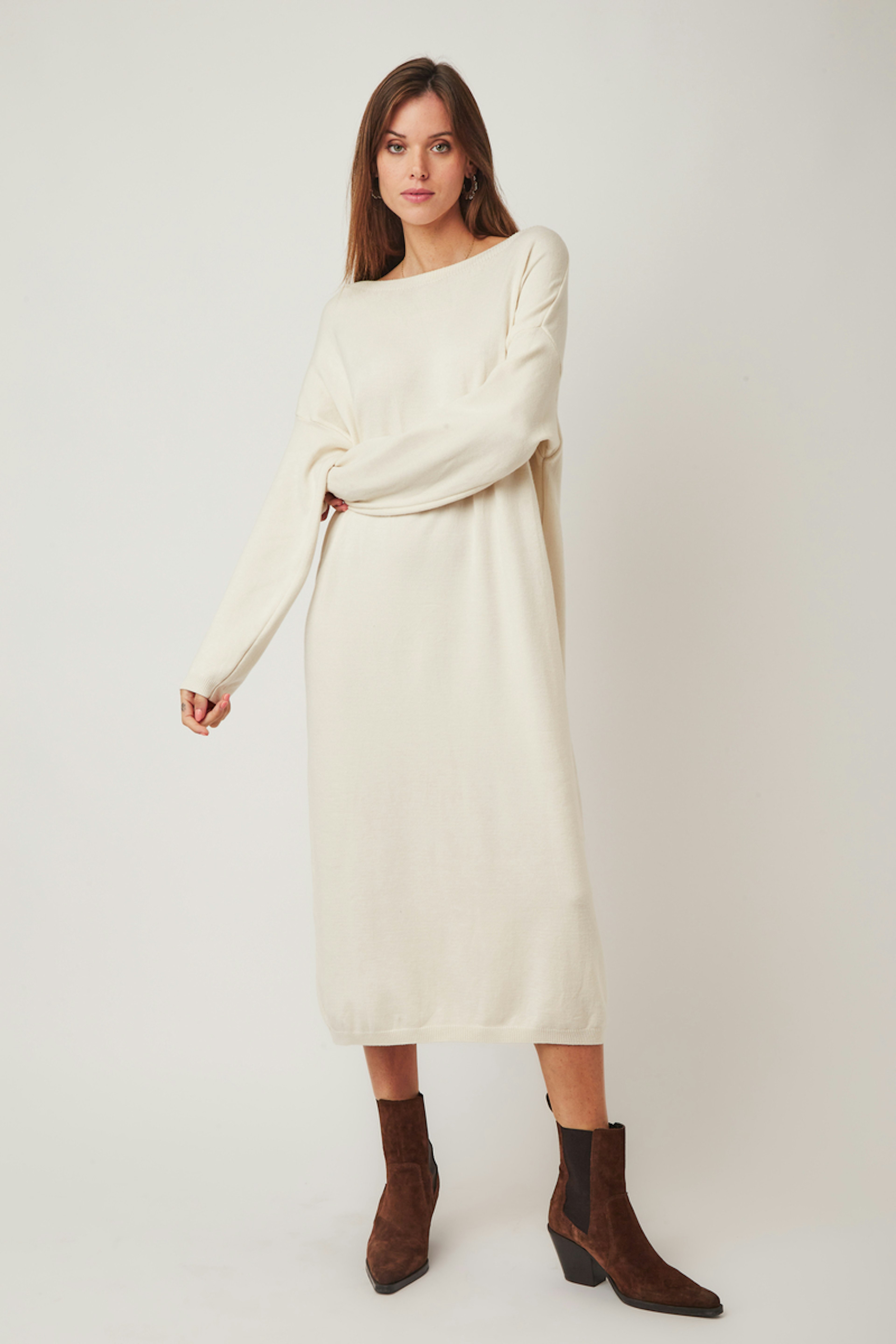 โข Robe pull longue โข Couleur ecru โข Coupe droite โข Manches longues โข Col rond