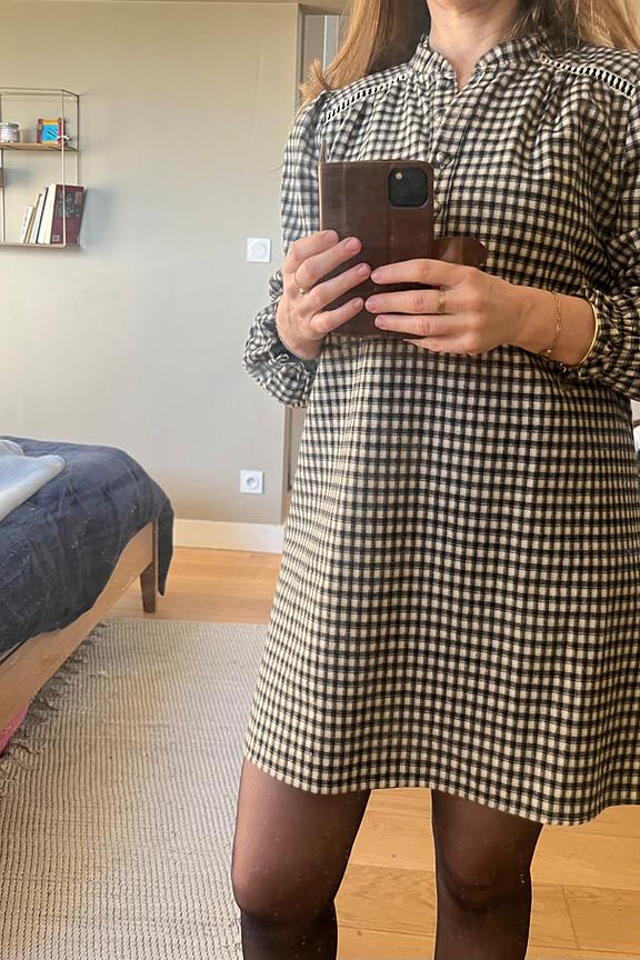 Associez cette robe à des bottes en cuir et un chapeau feutre pour une touche hivernale bohème. • Robe courte • Manches longues • Col rond • Imprimé vichy • Pompons sur les manches