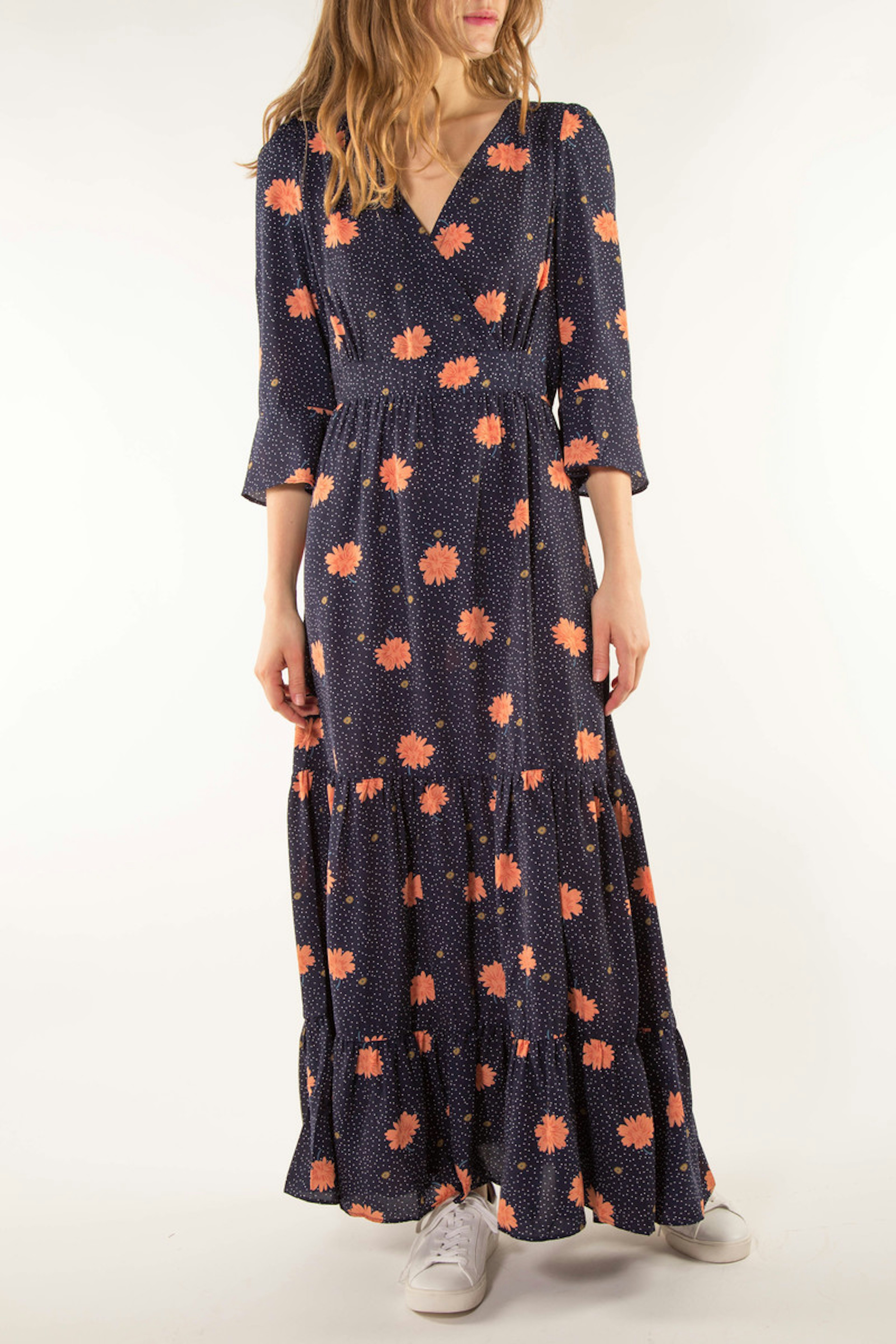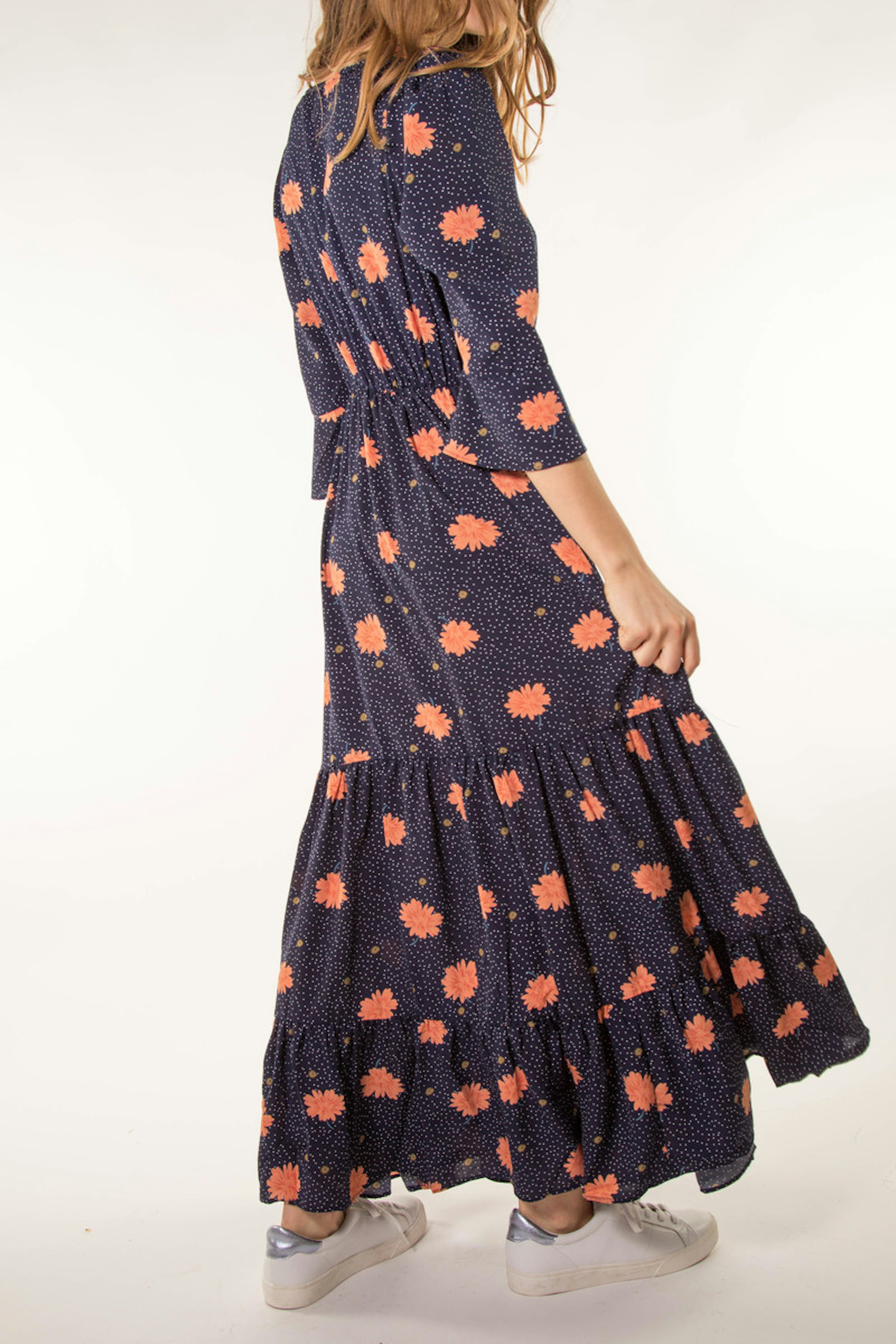 La robe longue Bonnie nous donne dรฉjร envie d'รชtre en รฉtรฉ. Cette robe longue, ร volants et ร imprimรฉ fleuri peut tout ร fait combler cette envie ! Vous pouvez la porter avec une paire de baskets et un perfecto. On peut รฉgalement ajouter un chapeau pour un look bohรจme.